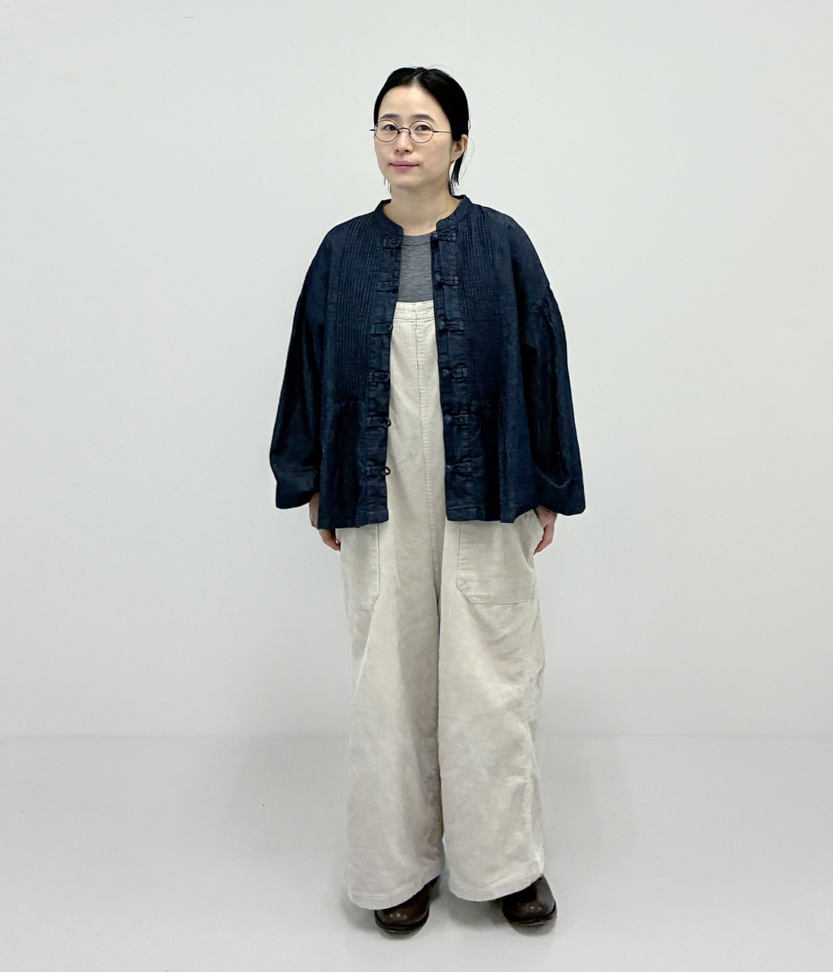 コットンリネンデニム チャイナボタンブラウス