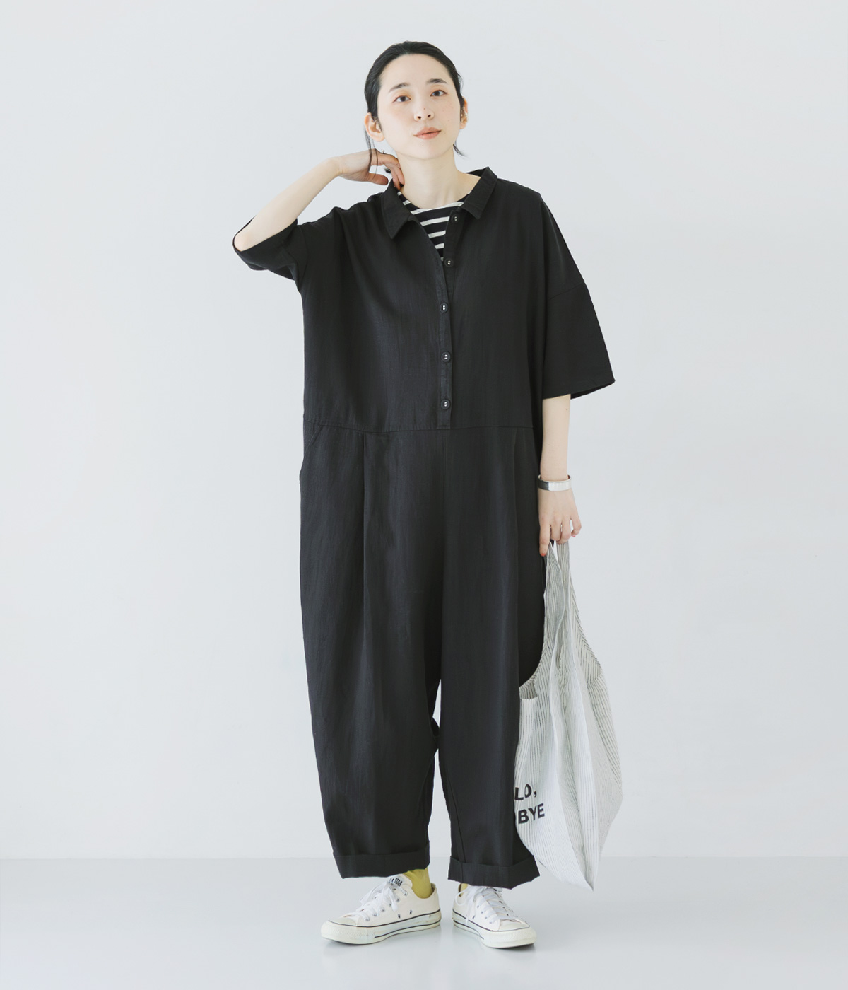 コットンリネン空羽チェックタックワイドパンツ