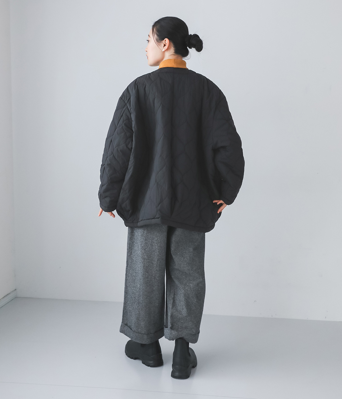 保温中綿ノーカラーハーフコートの着用コーディネート