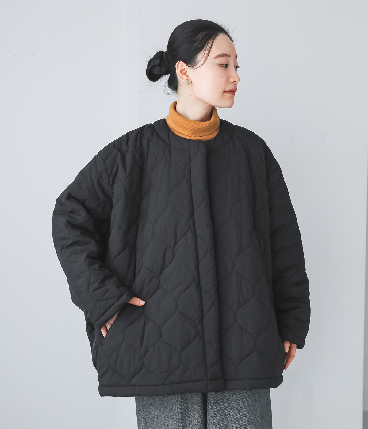 ひょうたん型キルティングの、やわらかな曲線が女性らしいコートを主役にした、落ち着きのある大人カジュアルスタイル。