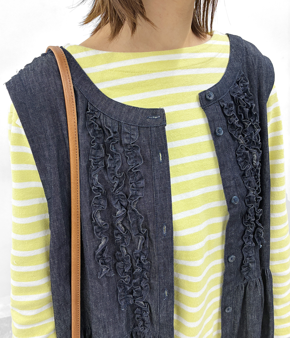 コットンリネンループ染めインディゴ前後フリル使い2wayノー...