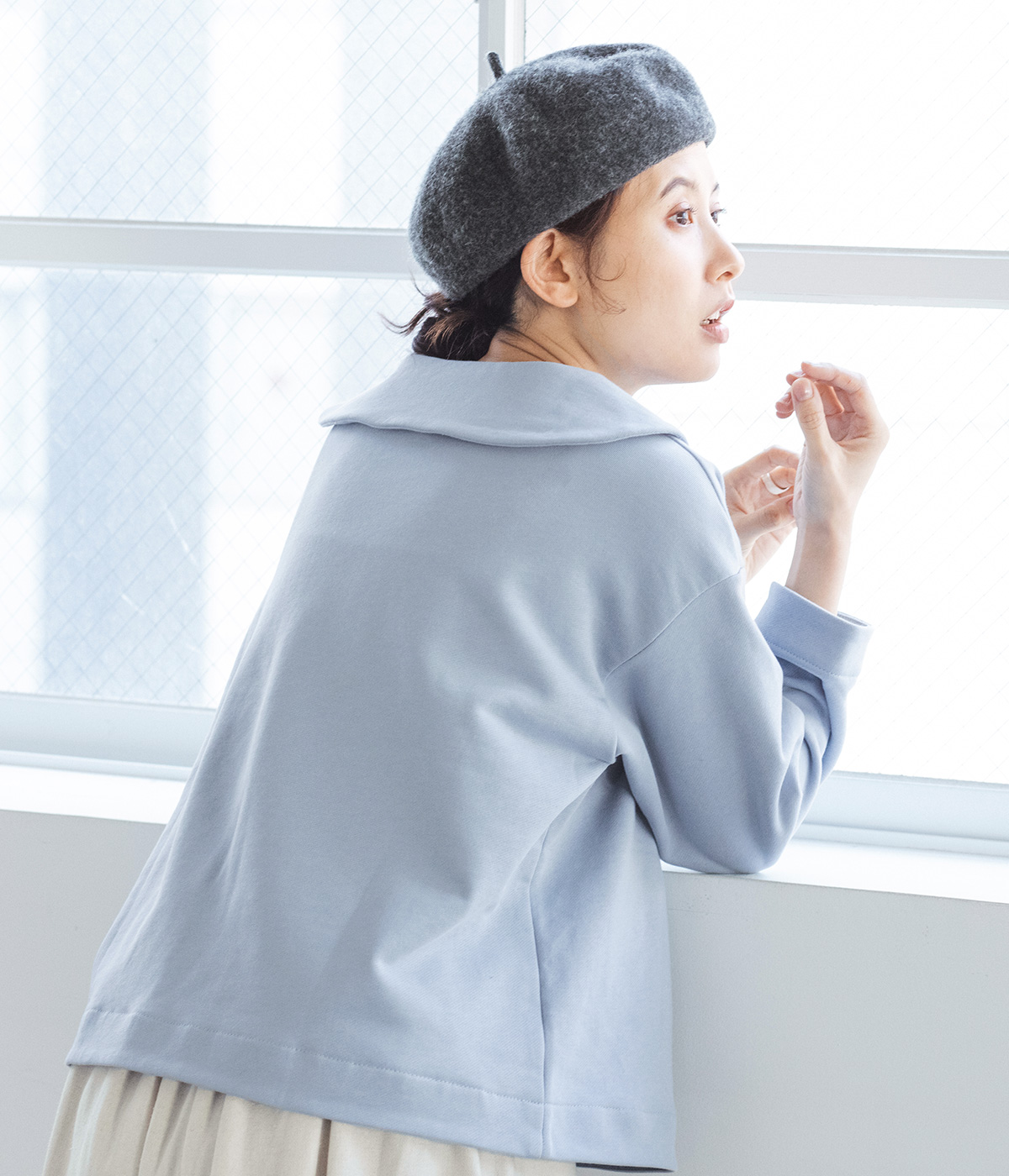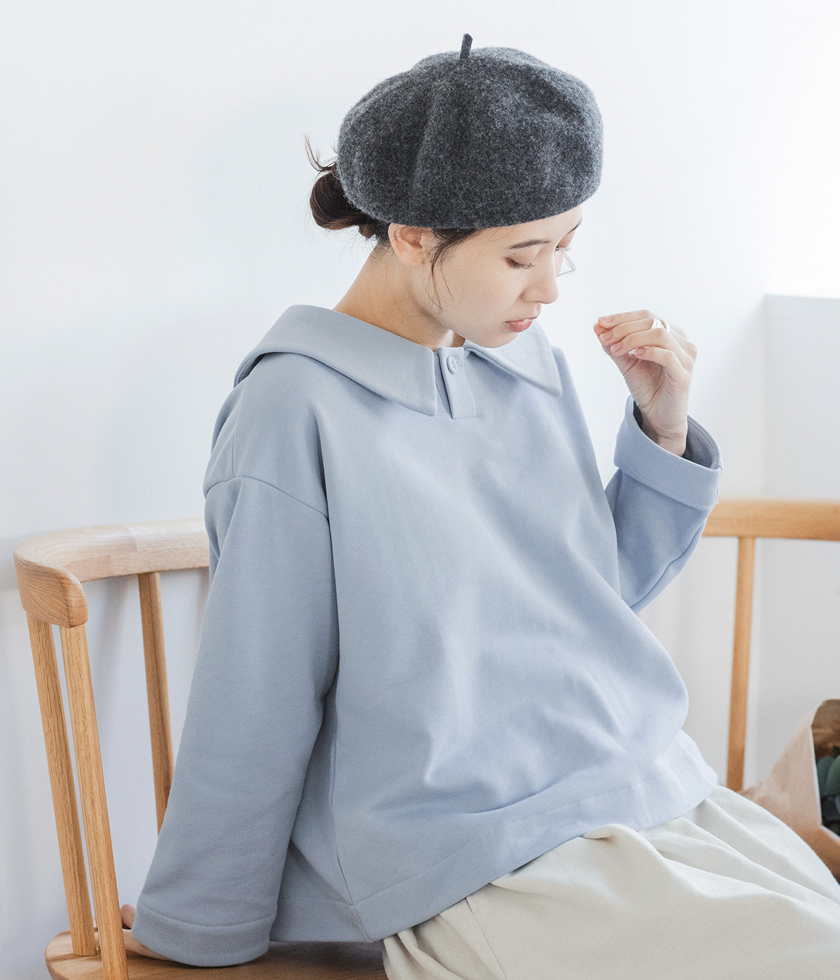 大きめ襟の裏毛プルオーバーの着用コーディネート