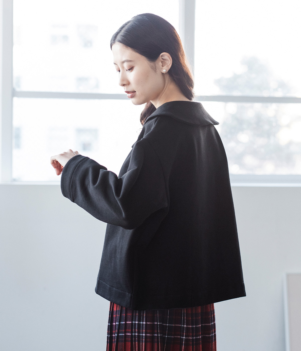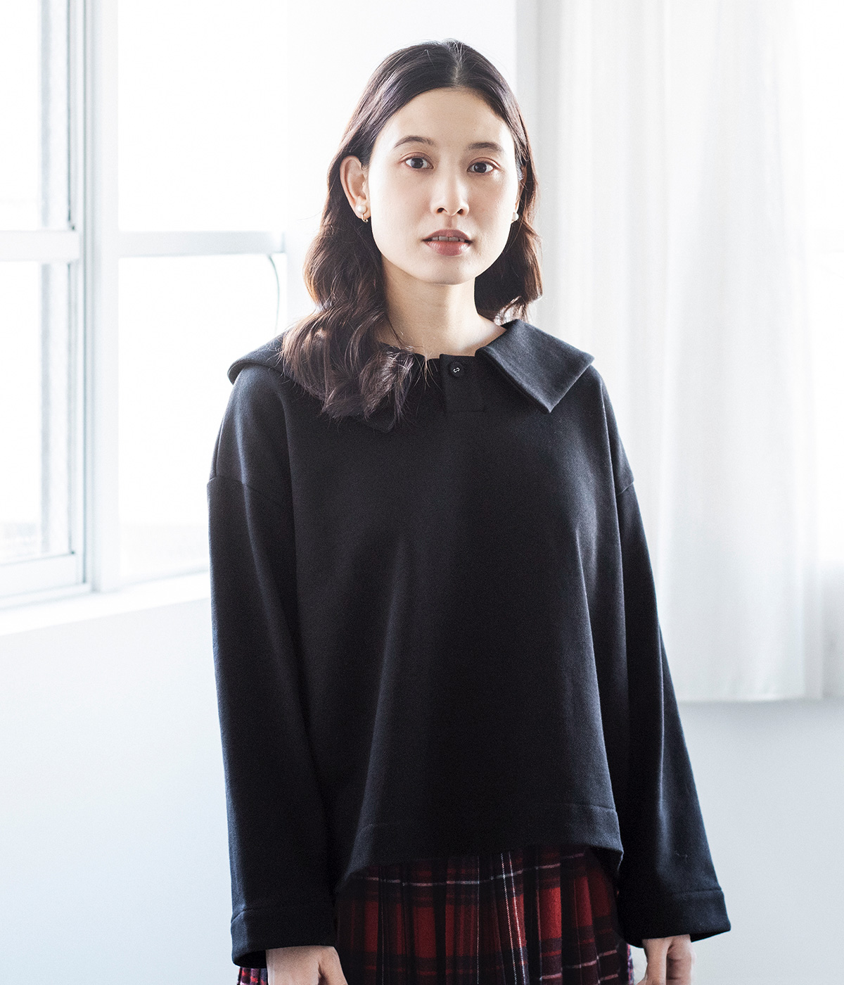 大きめ襟の裏毛プルオーバーの着用コーディネート