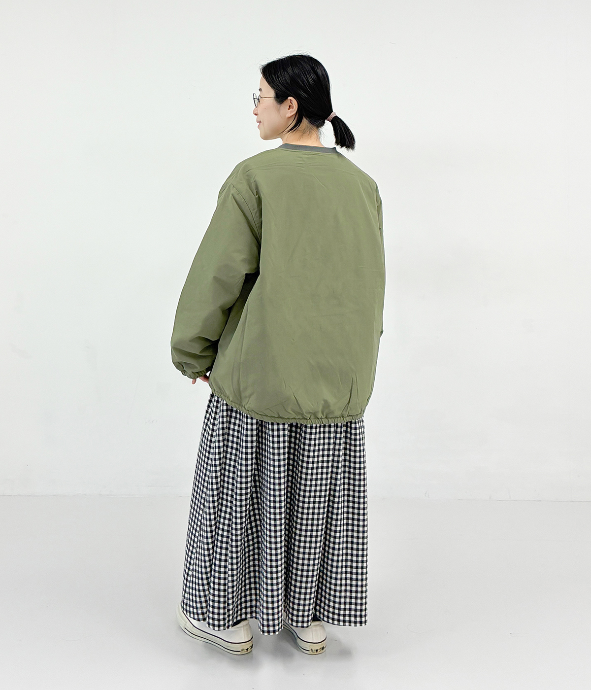軽量中綿リブ襟コートの着用コーディネート
