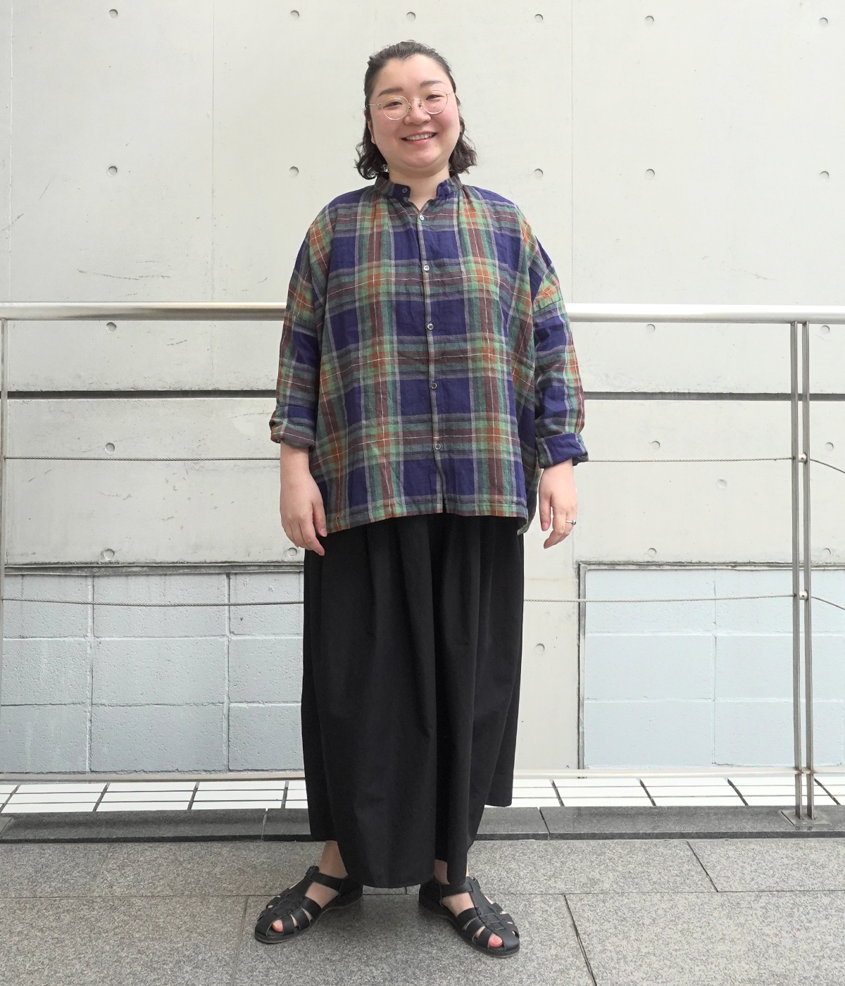 リネンコットンタータンチェックシャツの着用コーディネート