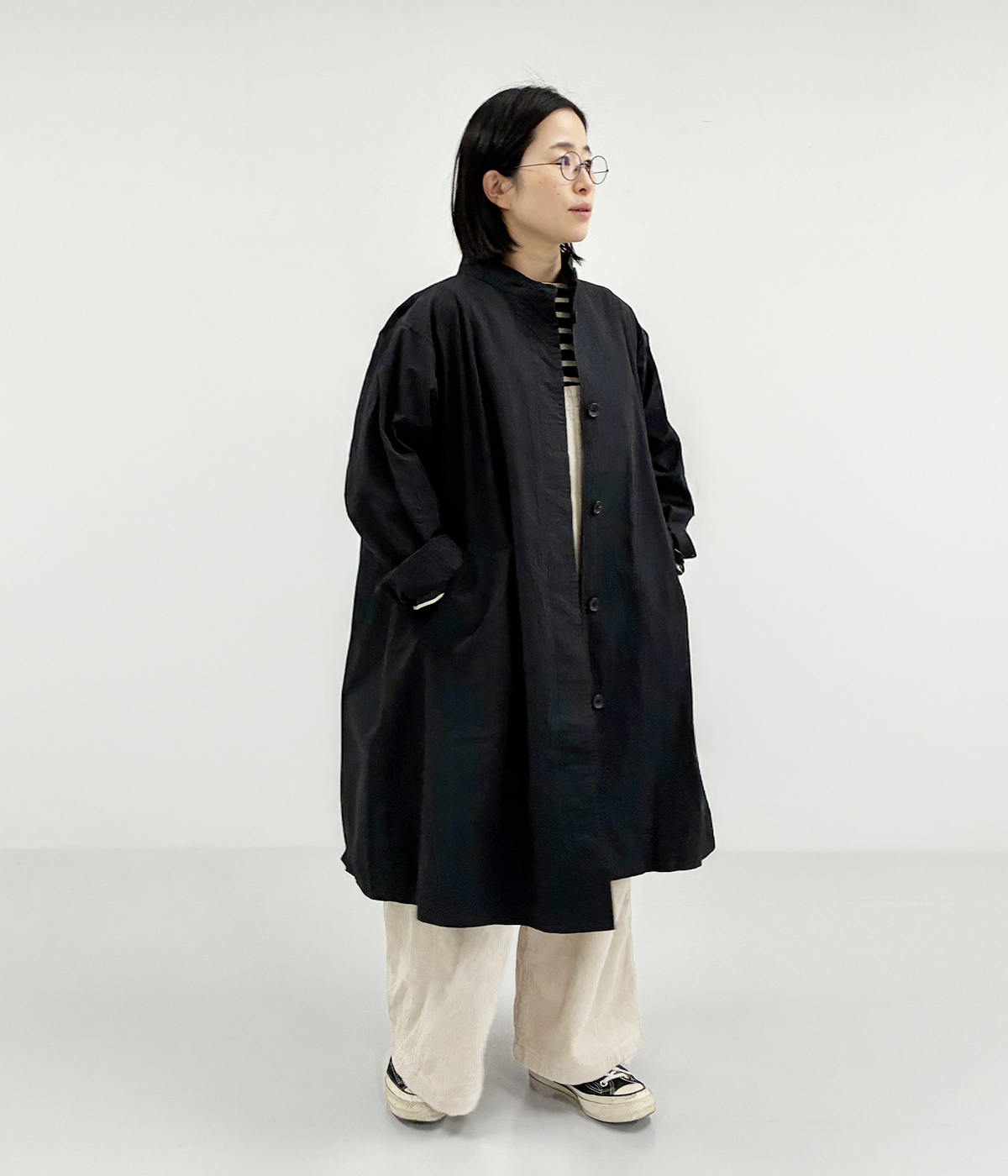 軽量中綿リブ襟コートの着用コーディネート