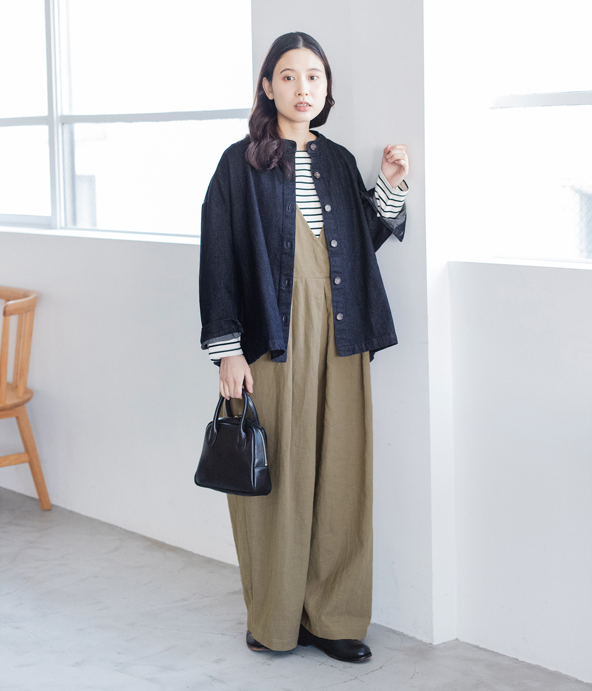 デニムオーバーオールの着用コーディネート