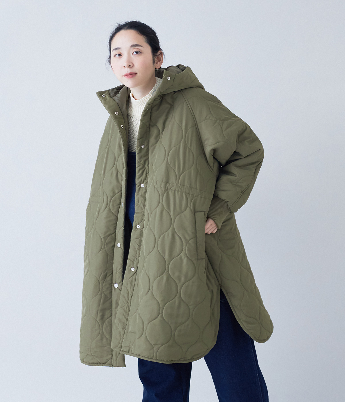 ひょうたんキルトフーディーコートの着用コーディネート