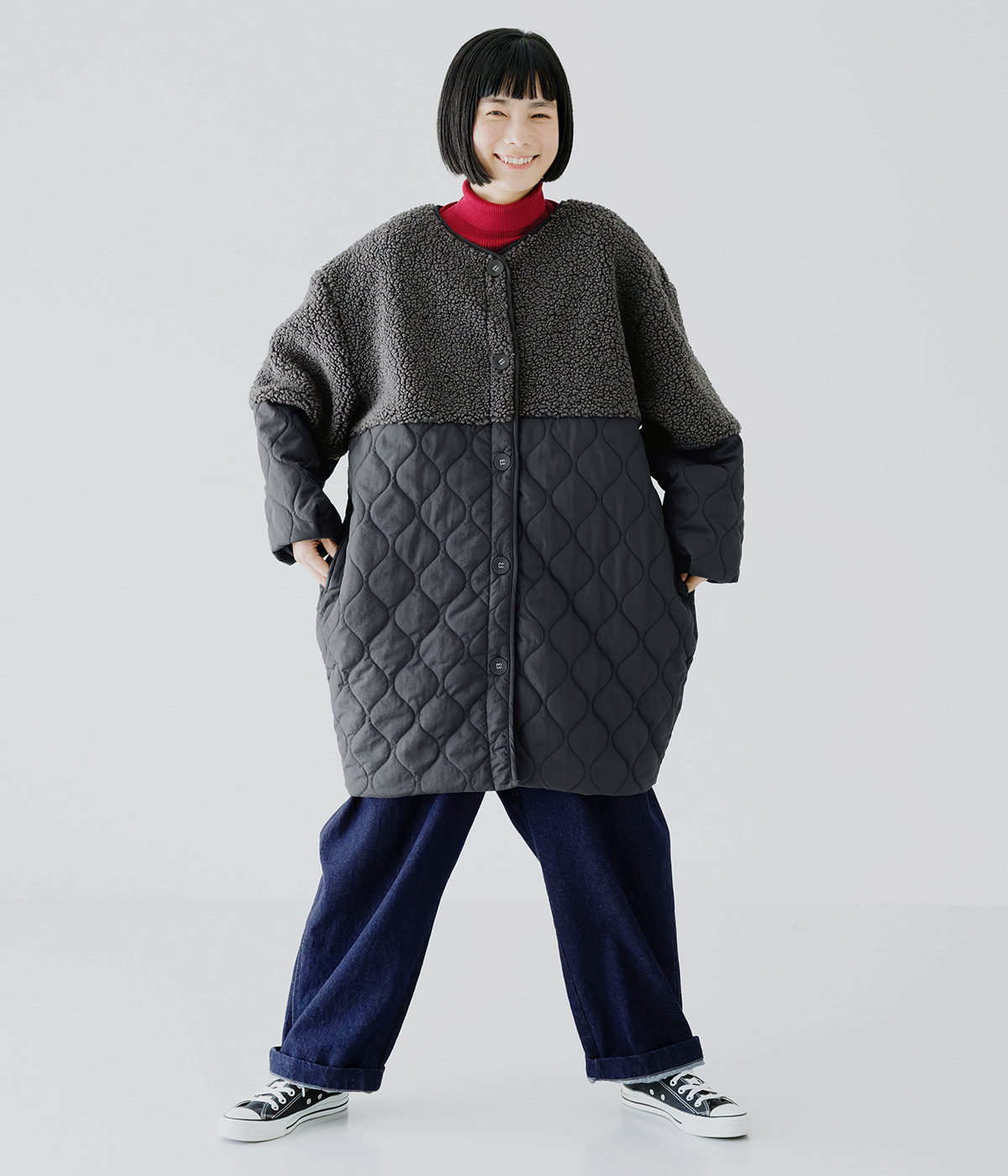 ボアキルトノーカラーコクーンコートの着用コーディネート
