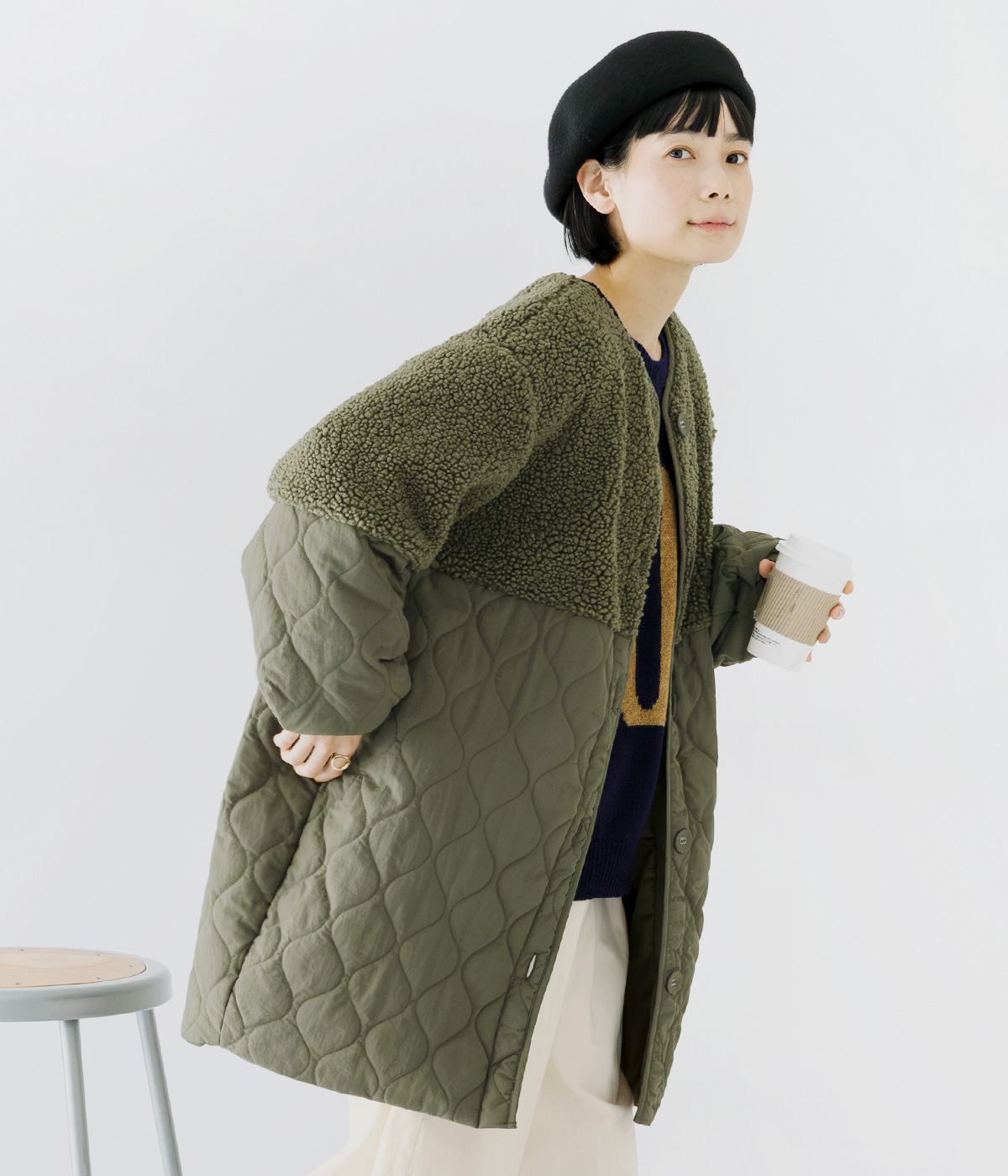 ボアキルトノーカラーコクーンコートの着用コーディネート
