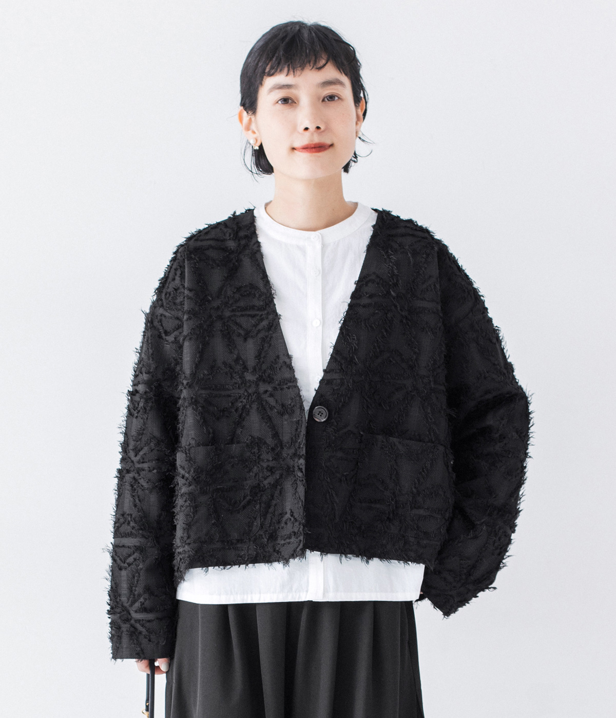 Vネックショートジャケットの着用コーディネート
