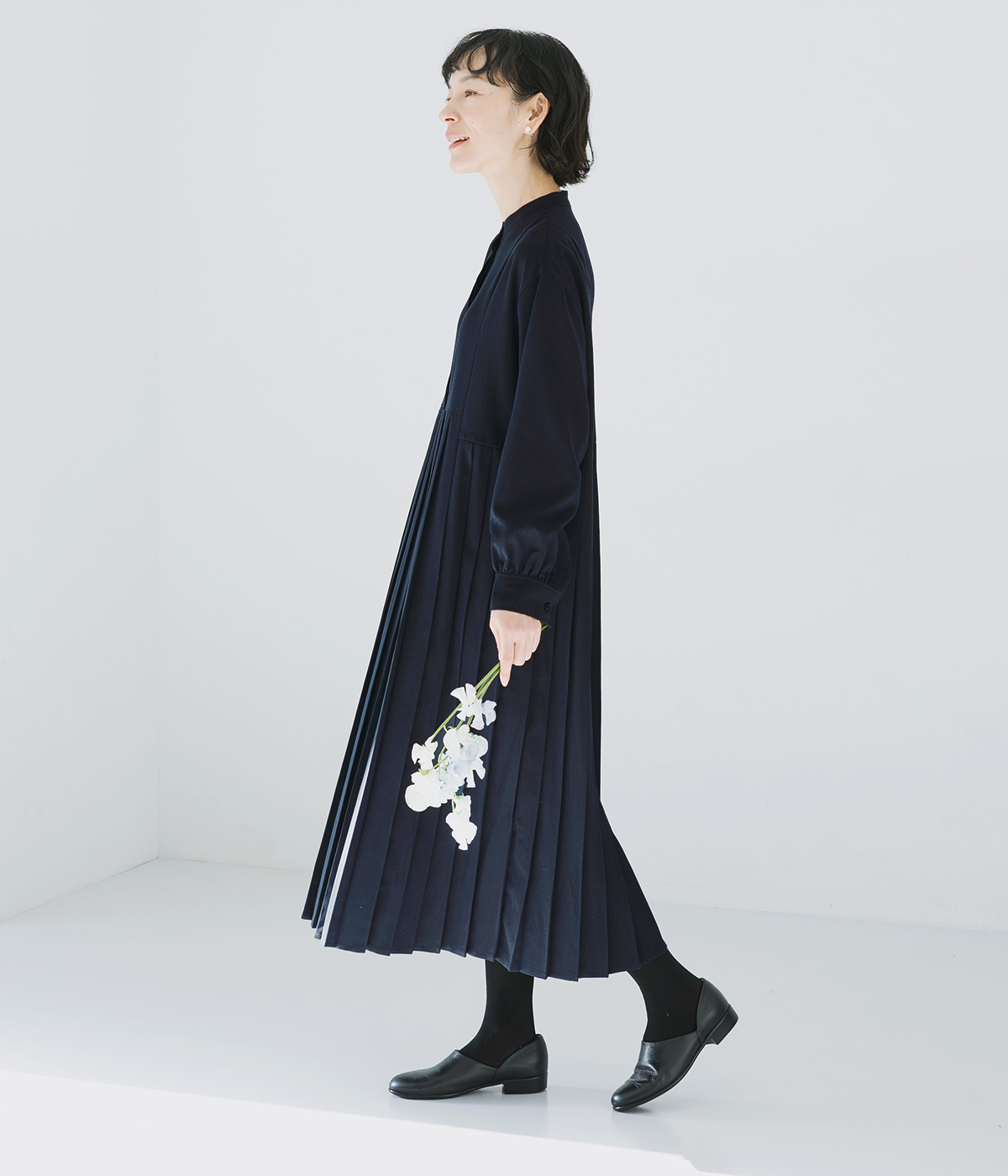 イレギュラー切替プリーツワンピースの着用コーディネート