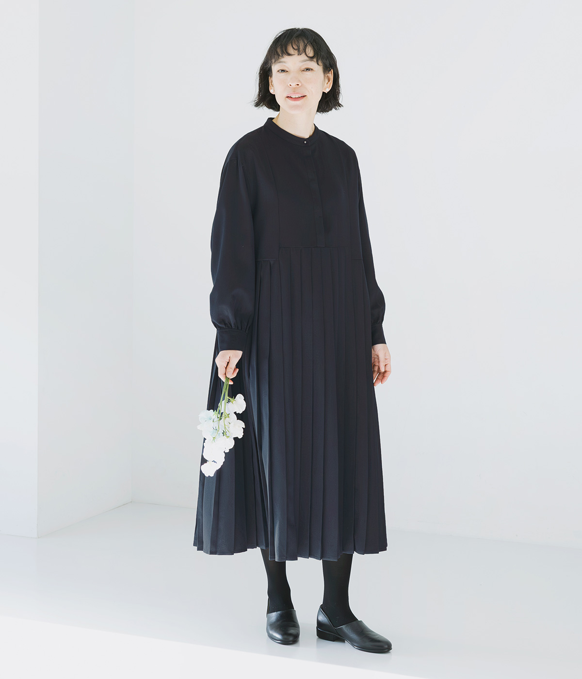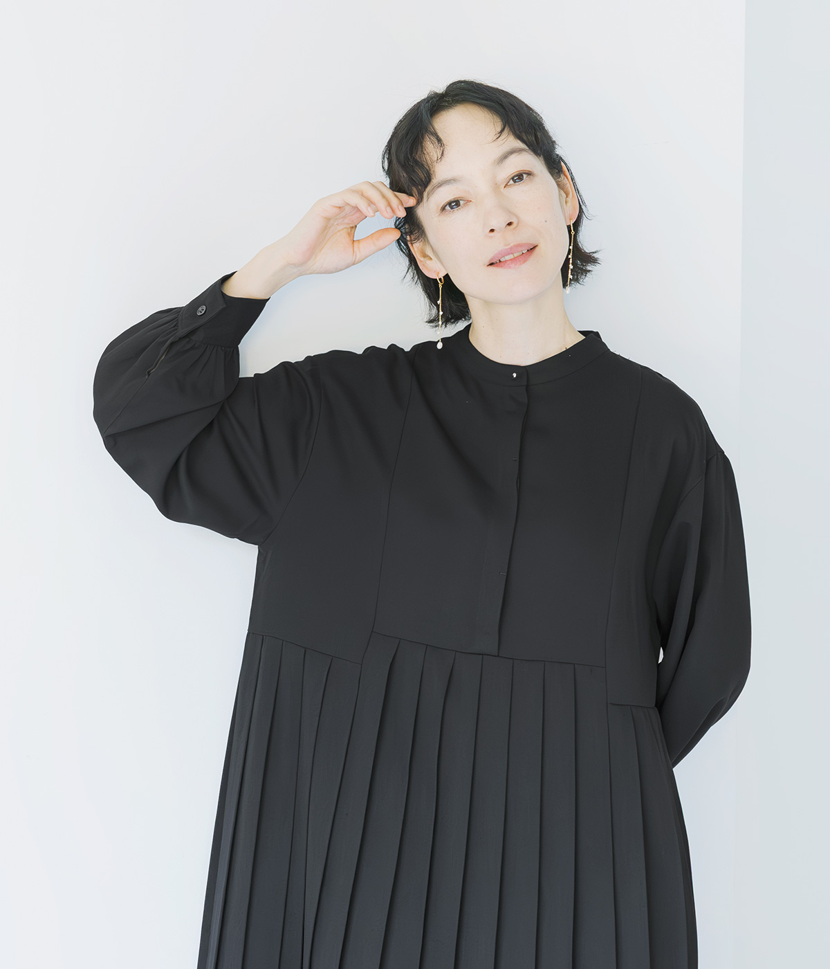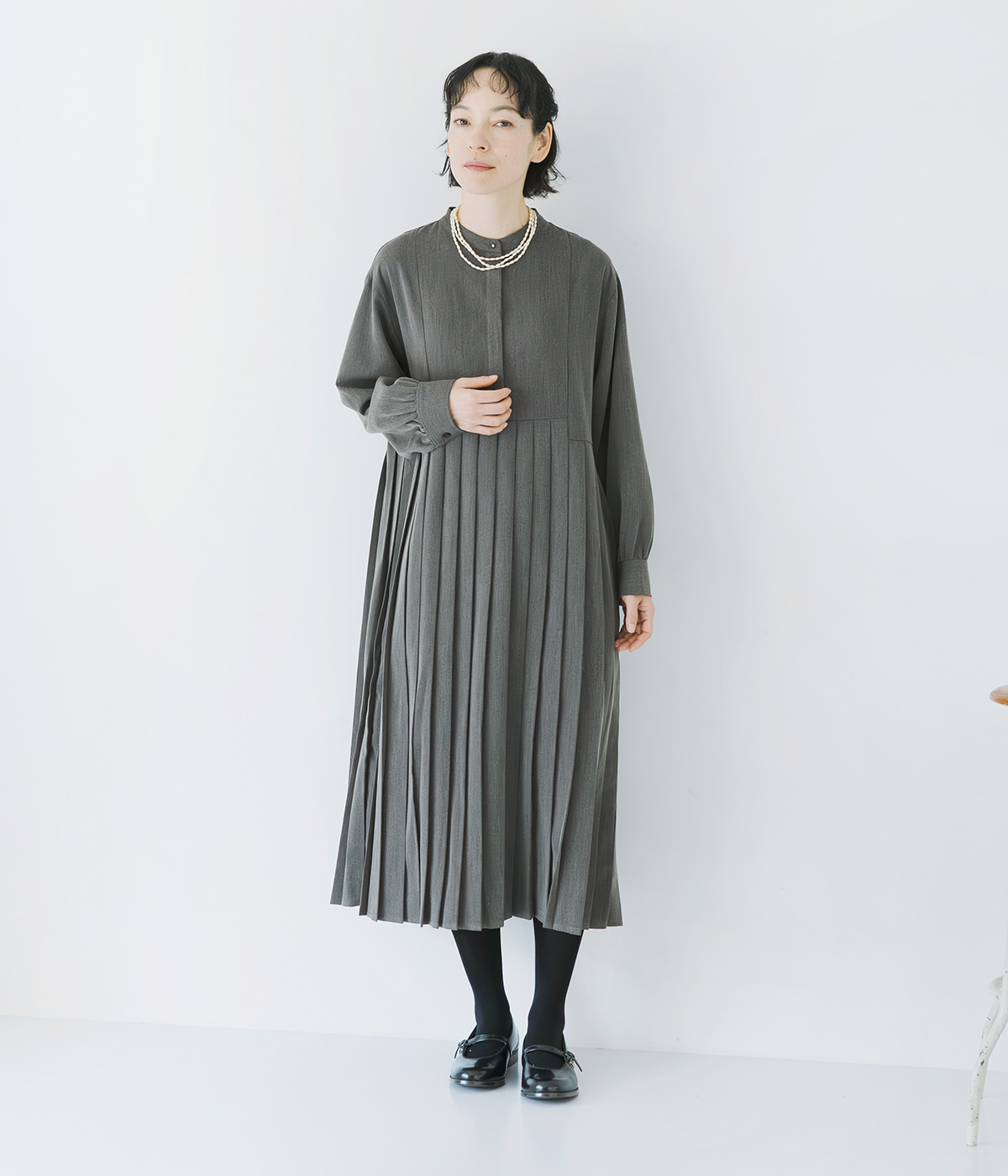 イレギュラー切替プリーツワンピースの着用コーディネート