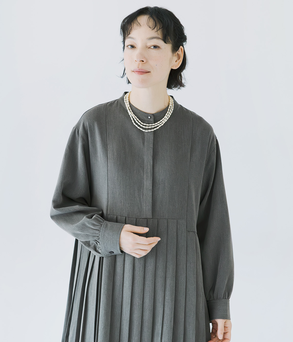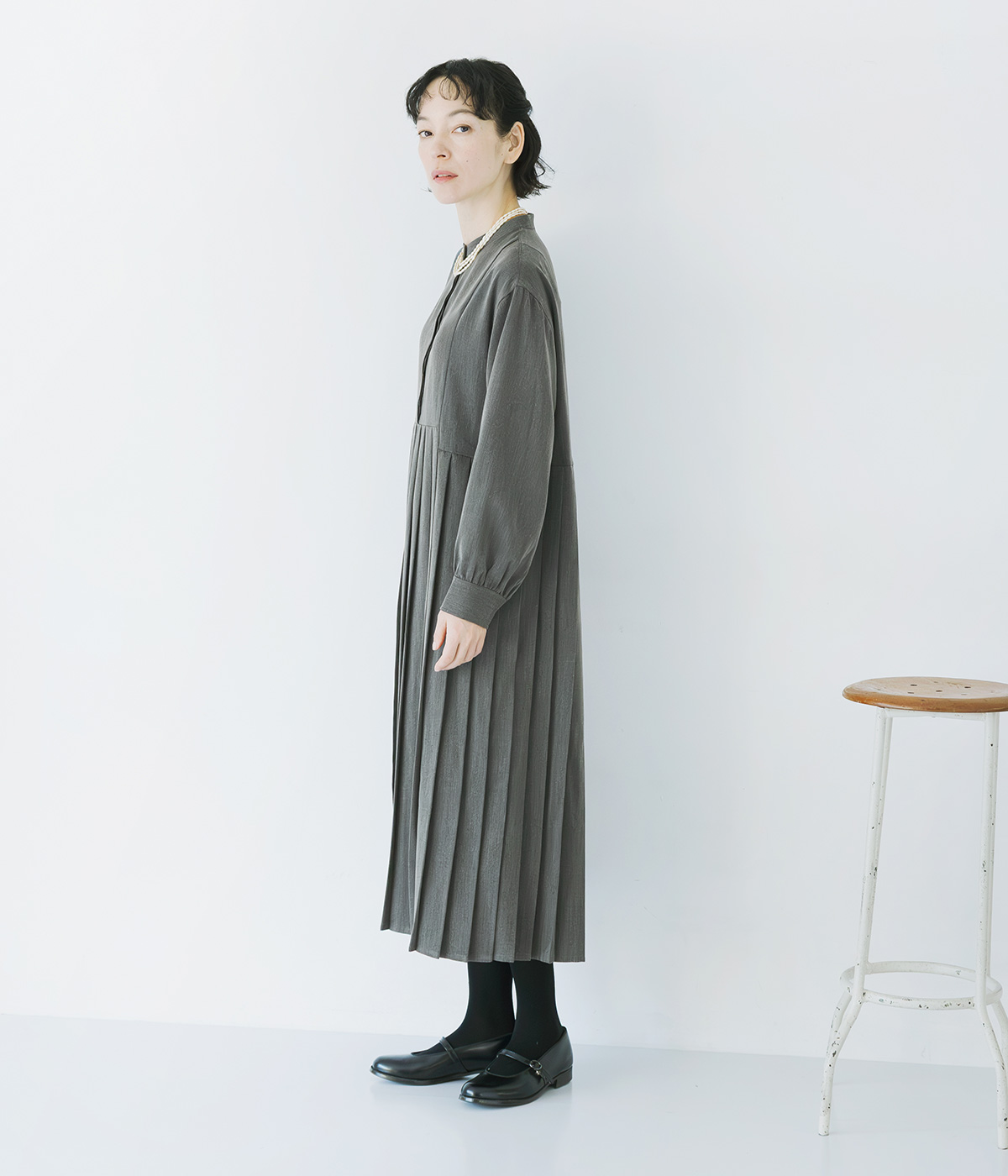 イレギュラー切替プリーツワンピースの着用コーディネート