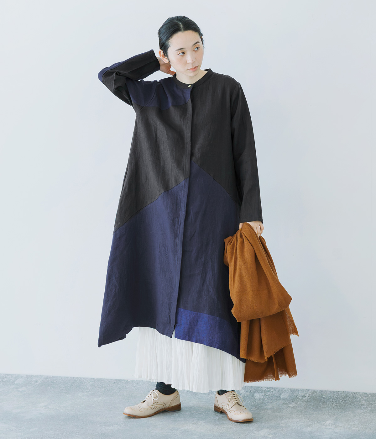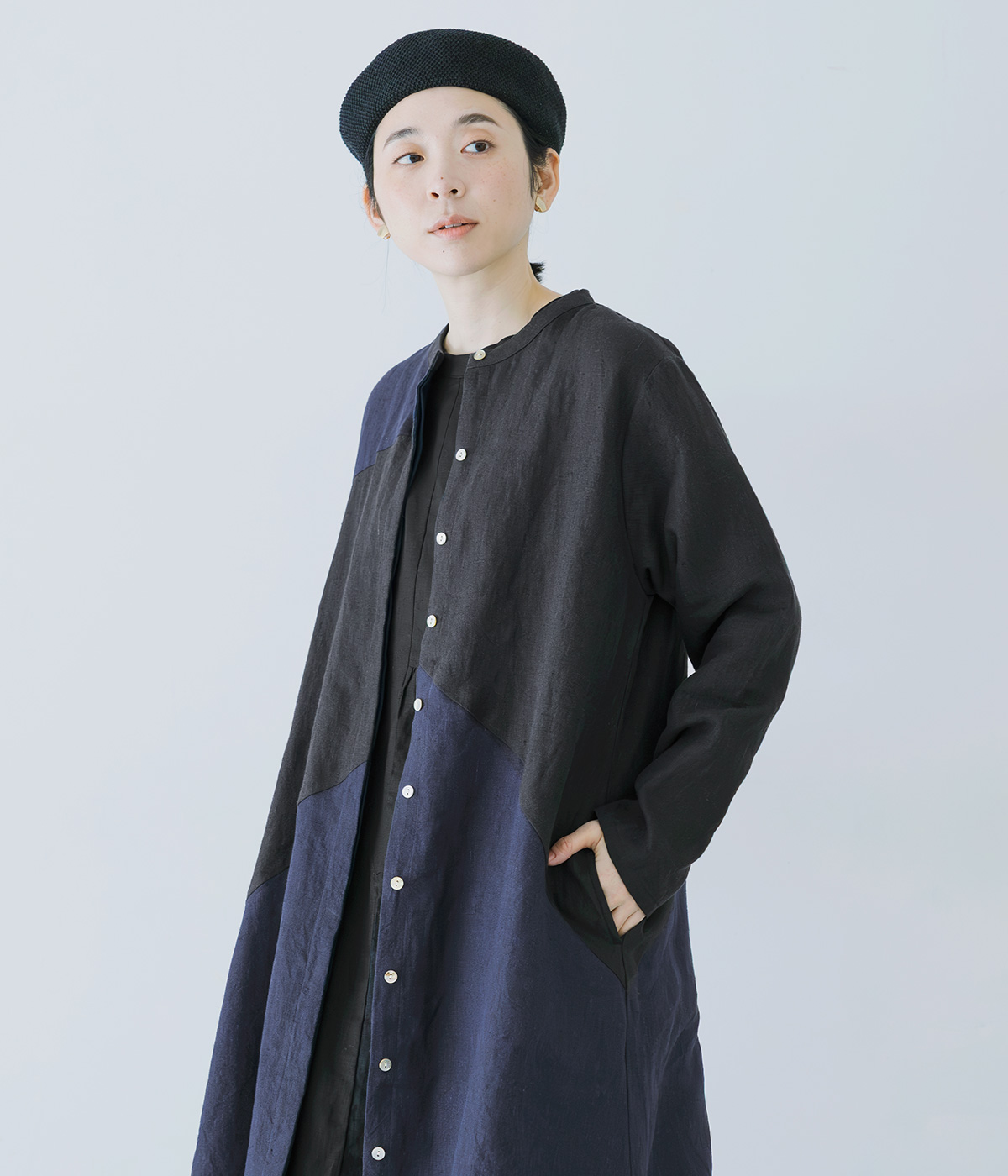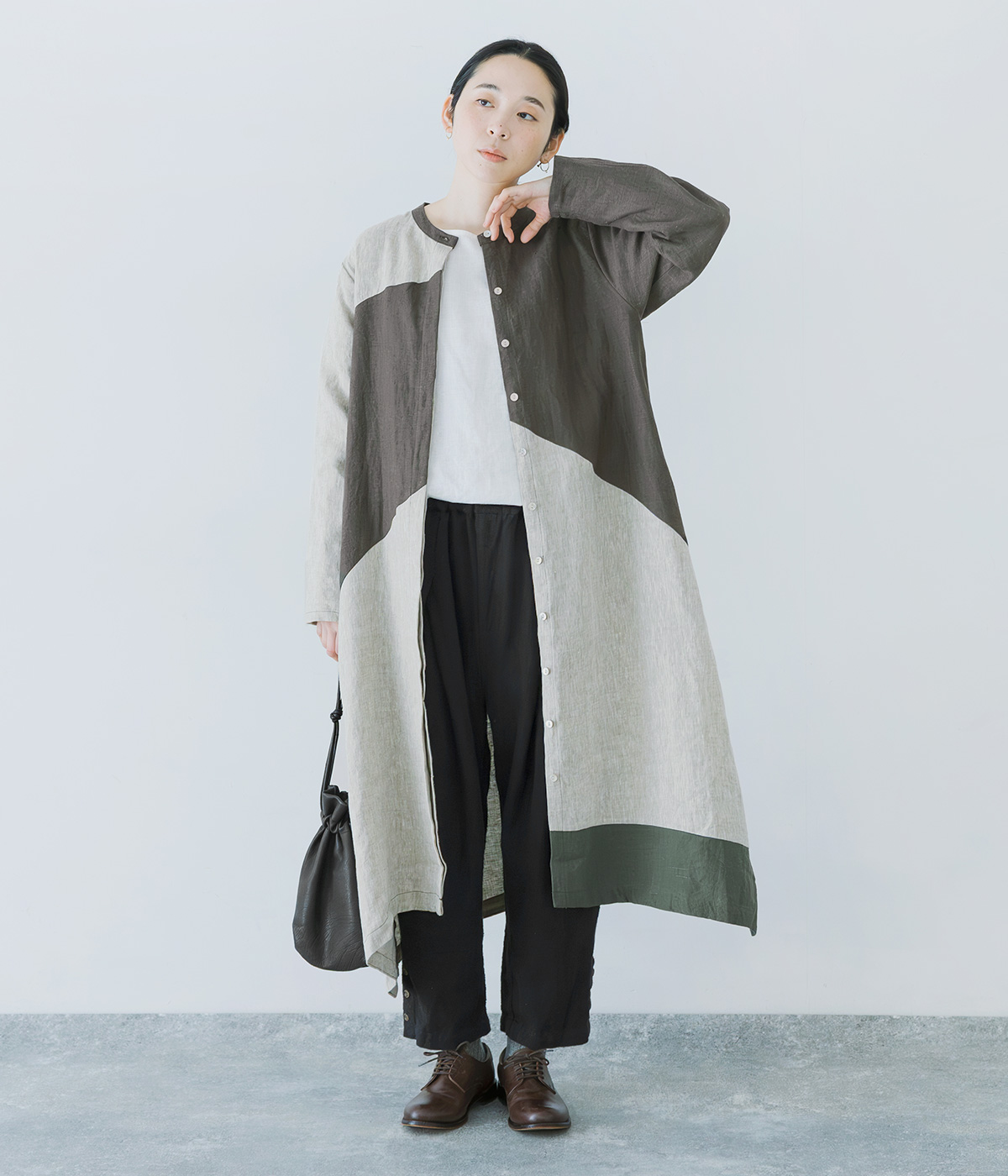 9番手リネンアシンメトリー切り替えワンピースの着用コーディネート