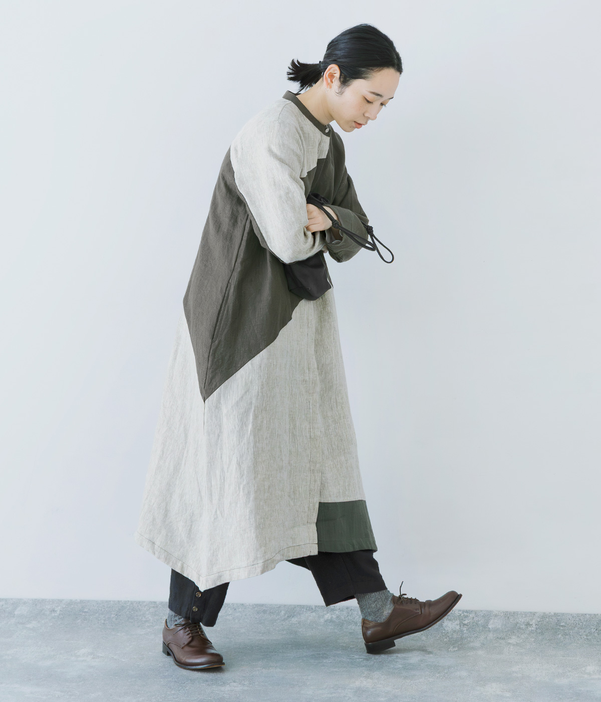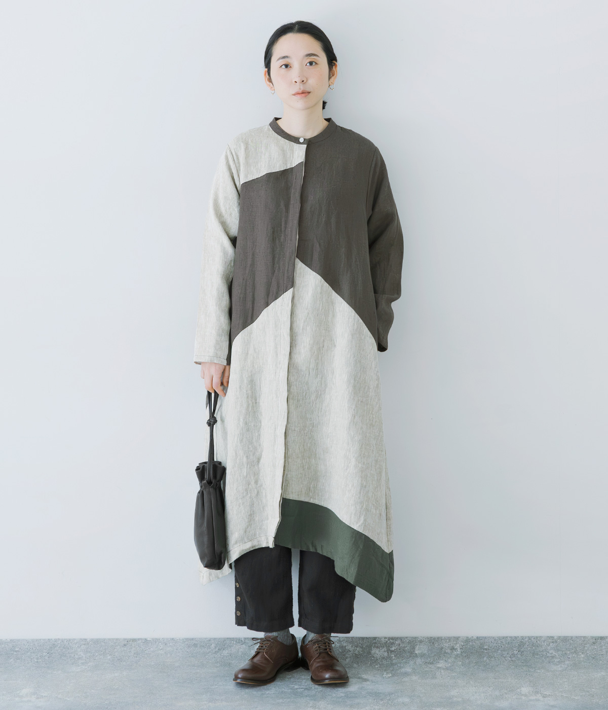 9番手リネンアシンメトリー切り替えワンピースの着用コーディネート