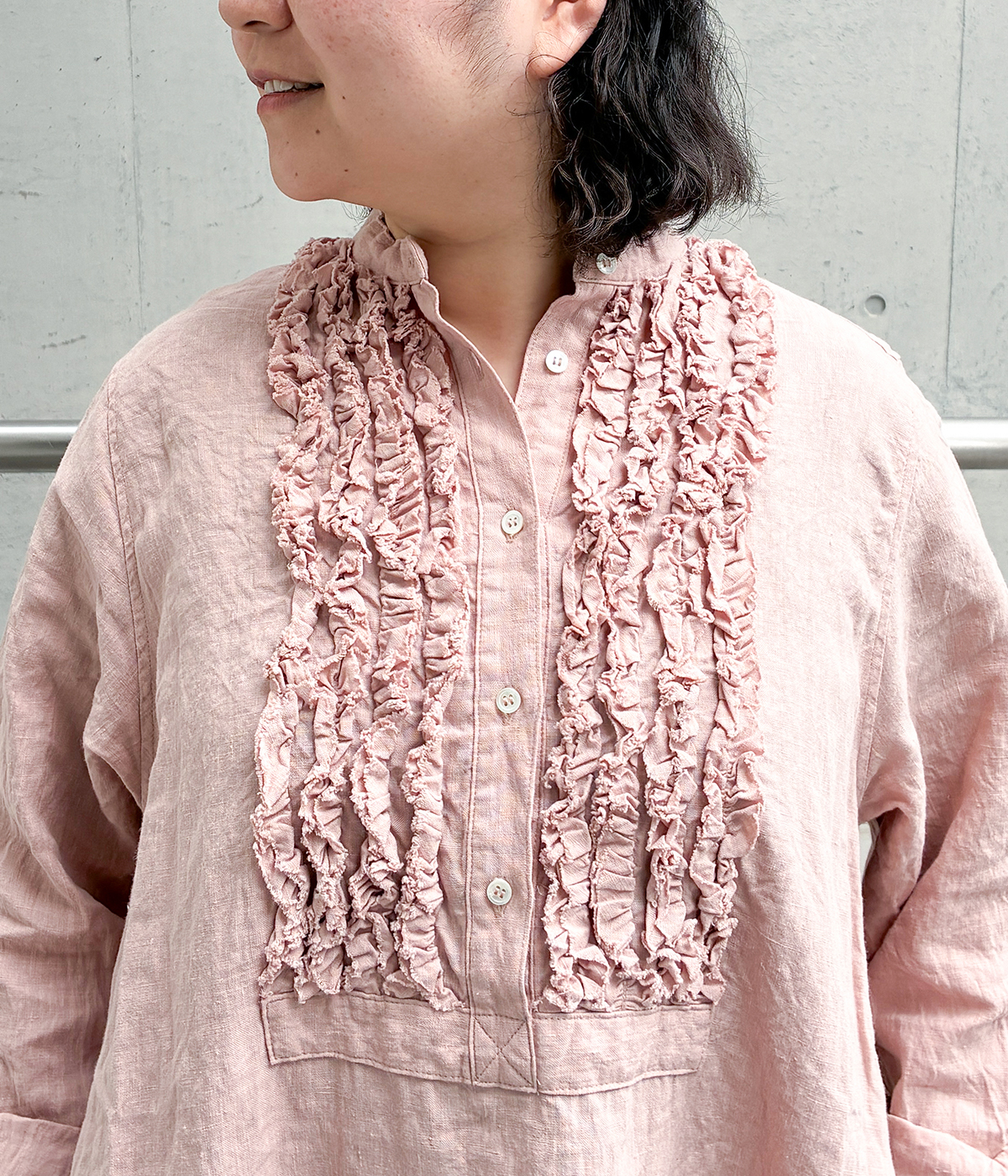 コットンリネンデニムチャイナボタンブラウスの着用コーディネート