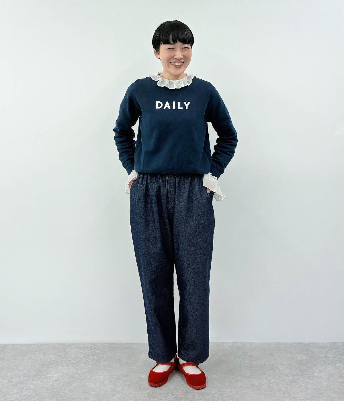 トップス:M、ボトムス:M、シューズ:23.5cm 365日柄物を着ています。腰の位置が低いウェーブ体型なので、トップスをinしたり、短めの着丈のトップスを着ることが多いです。