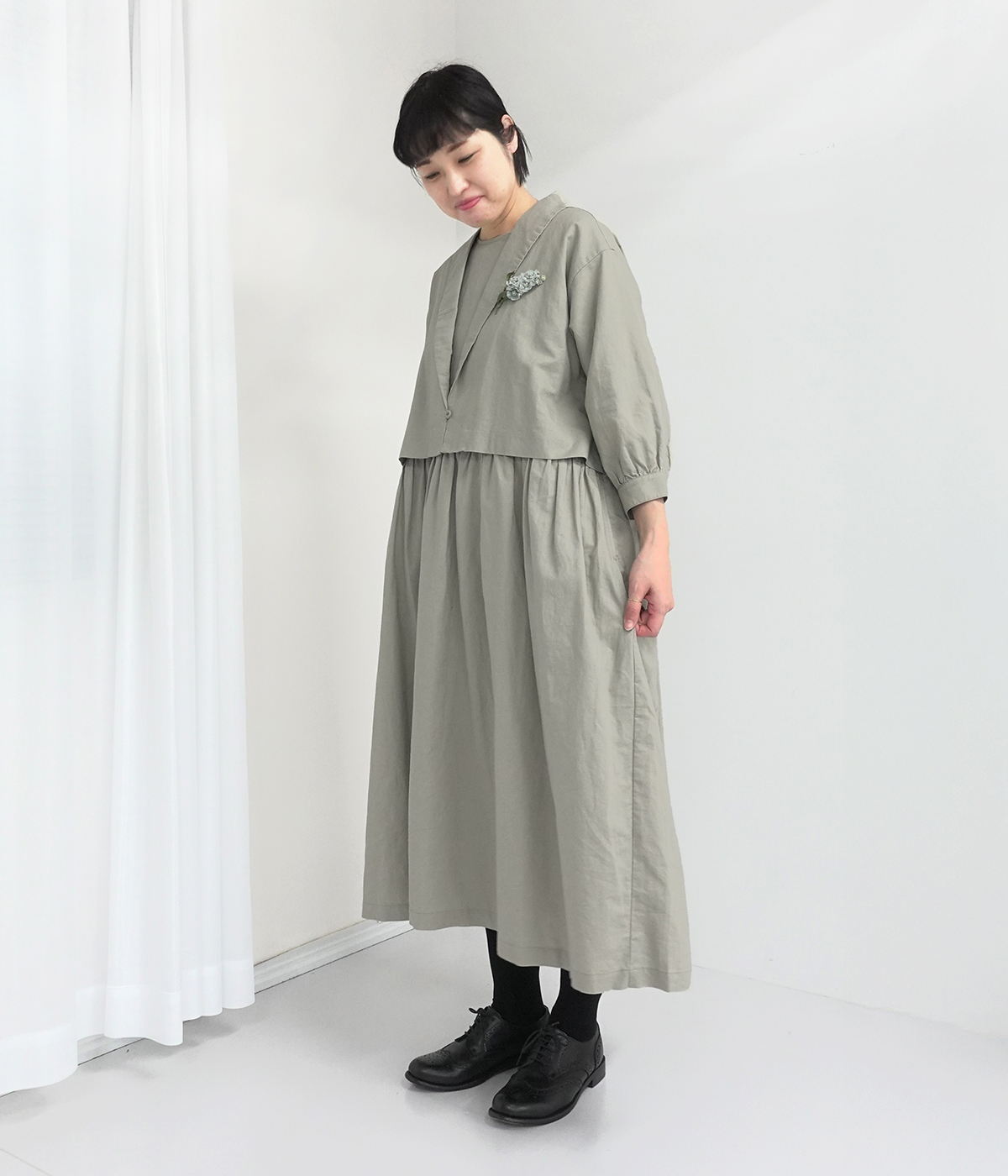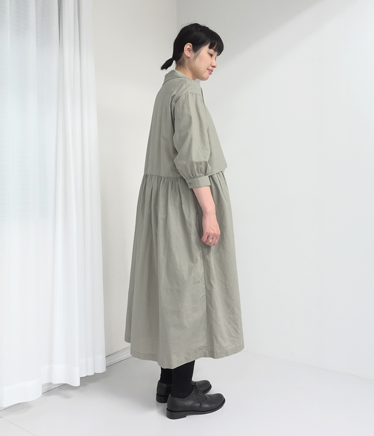 コットンリネンデニムチャイナボタンワンピースの着用コーディネート