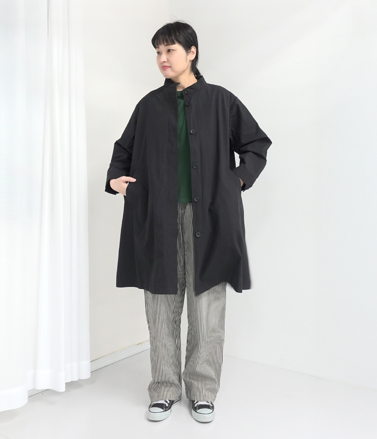 ノーカラーライトコートの着用コーディネート