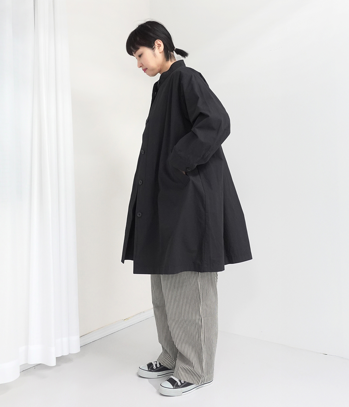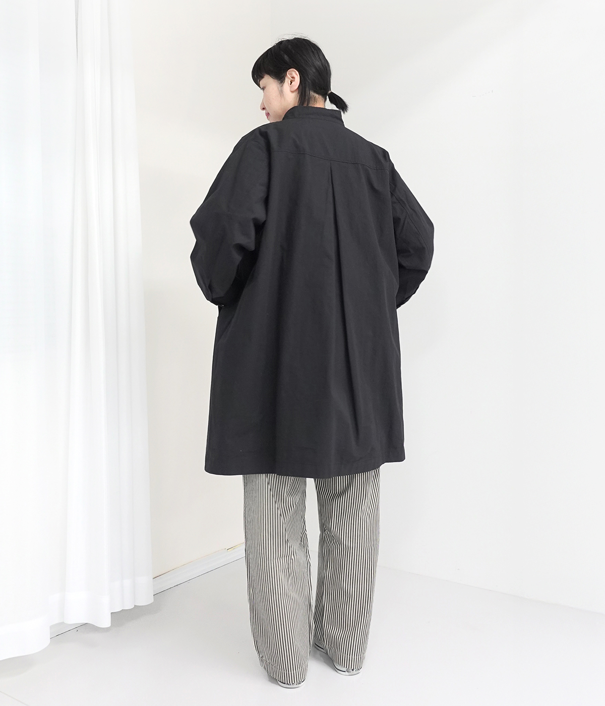 ノーカラーライトコートの着用コーディネート