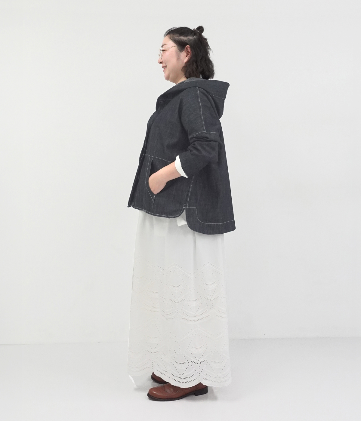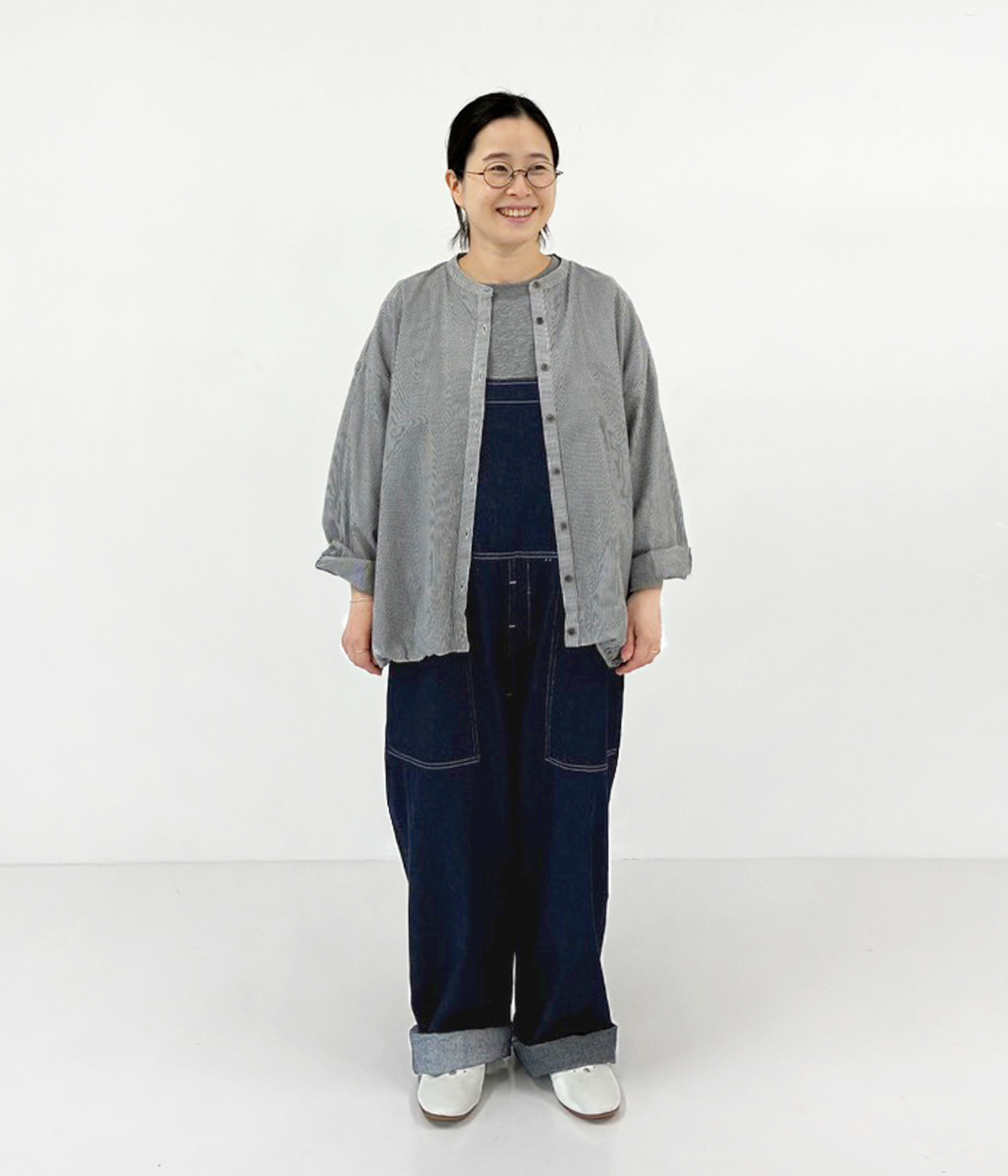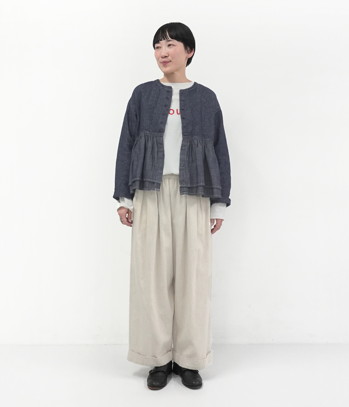 コットンリネンデニムチャイナボタンブラウスの着用コーディネート