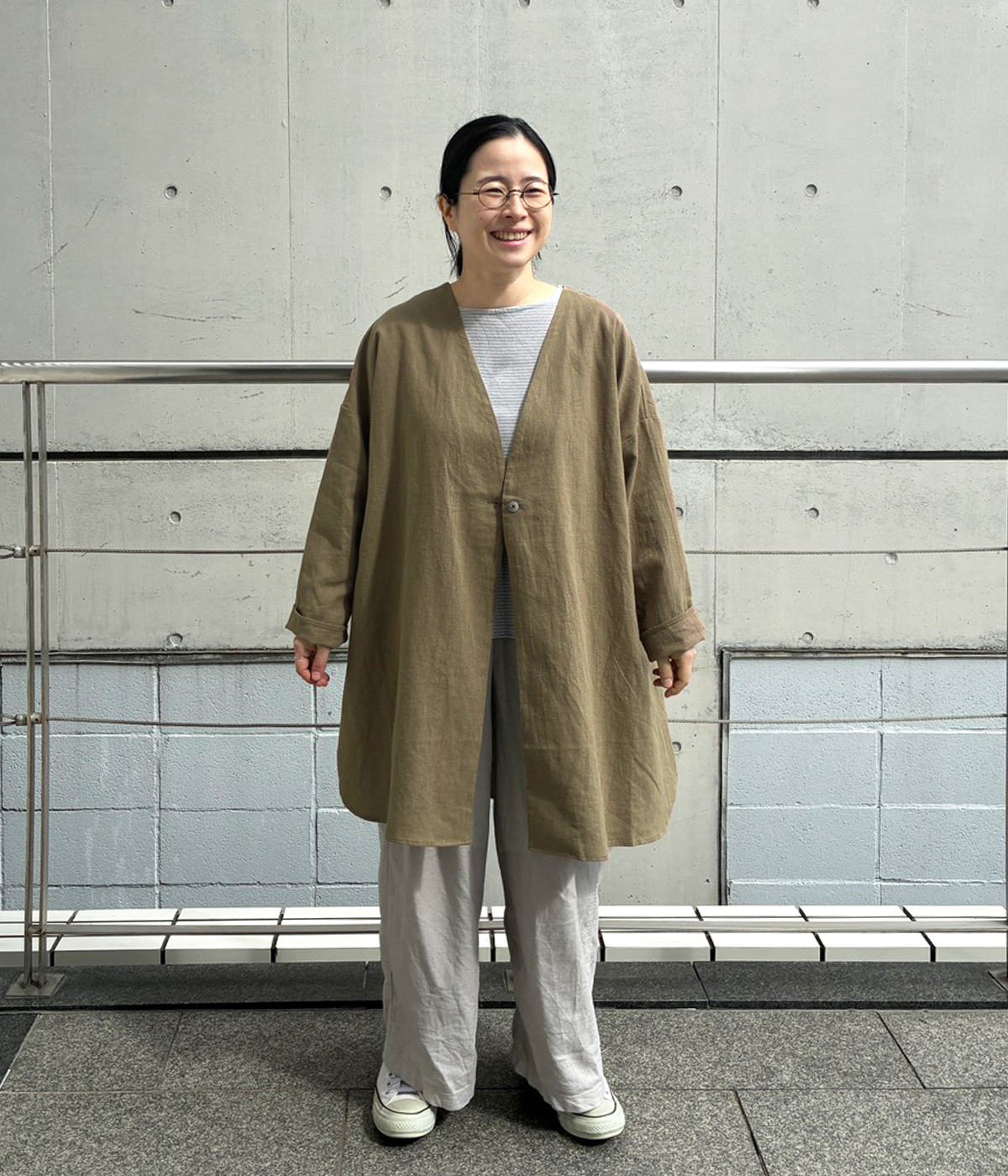 ノーカラーライトコートの着用コーディネート