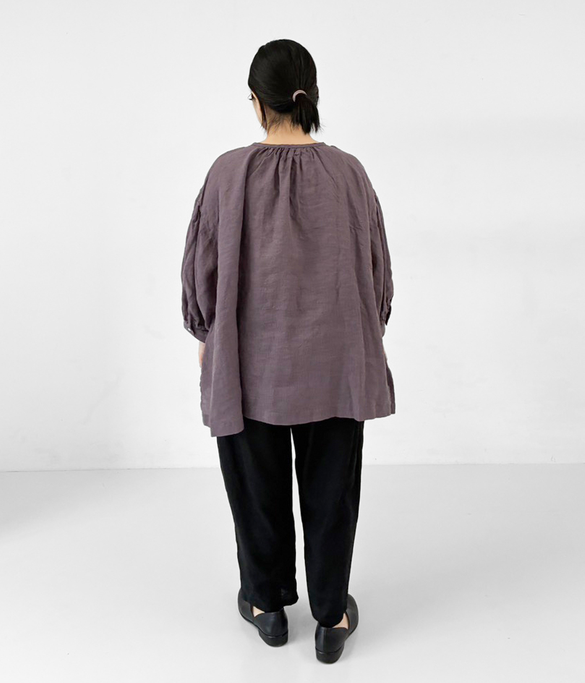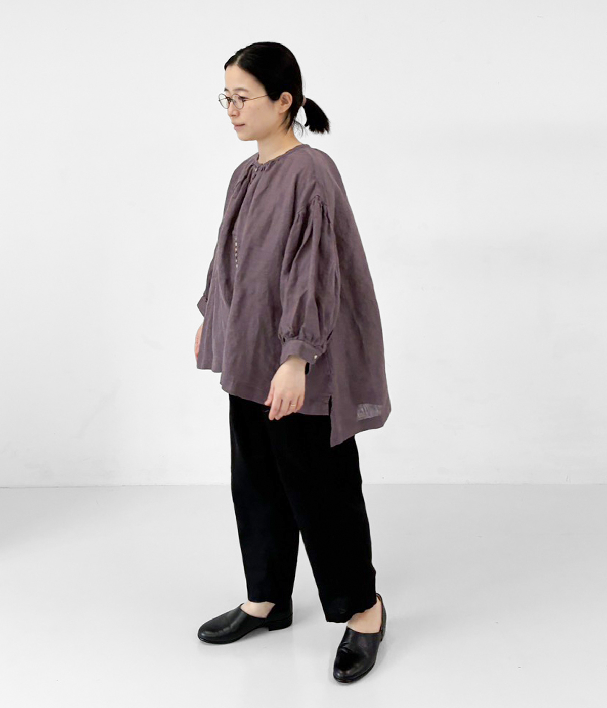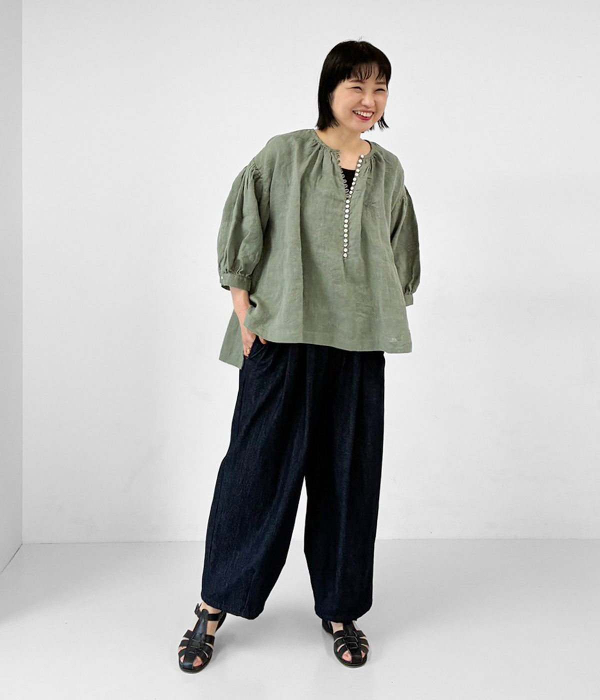 リネンシャンブレー 多ボタンふんわりブラウス