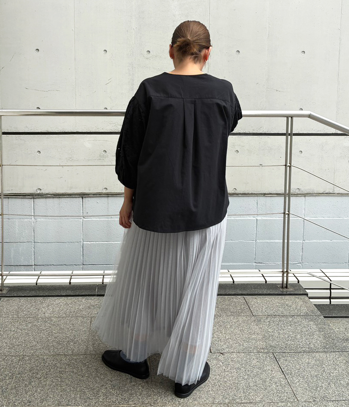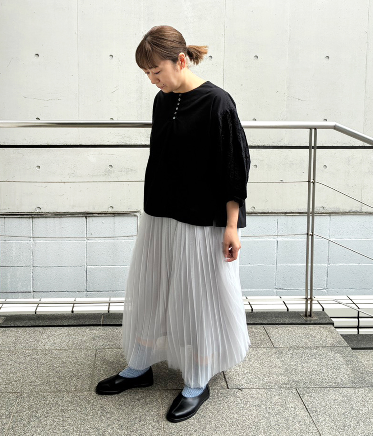 トップス:M、L、ボトムス:M、L、シューズ:23.5~24.0レース、フリルが好きで、メンズライクなアイテムとMIXさせたスタイリングが多いです。お腹ぽっこりと下半身大きめなのが悩み。