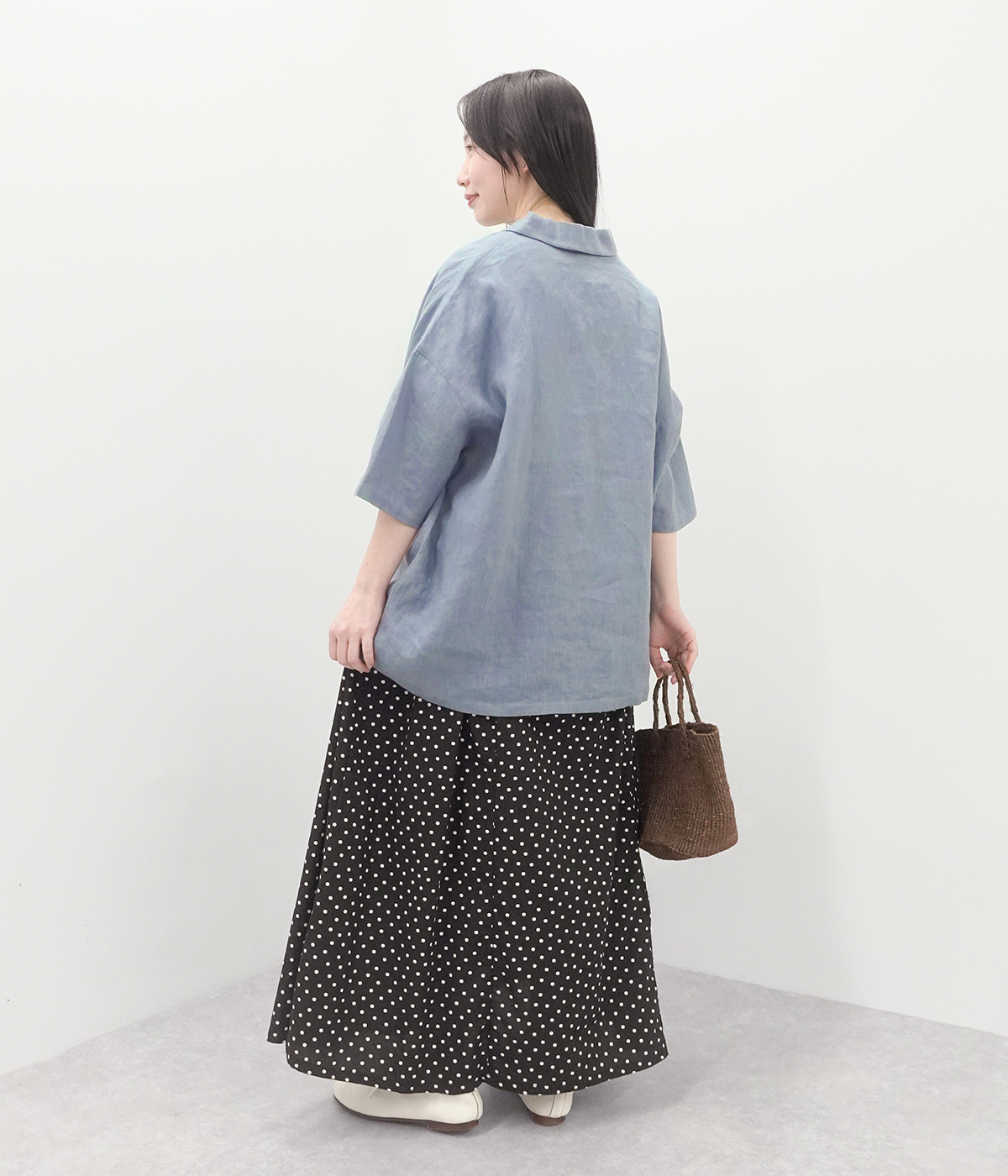 別注|14番手リネンギャザー切り替えワンピースの着用コーディネート