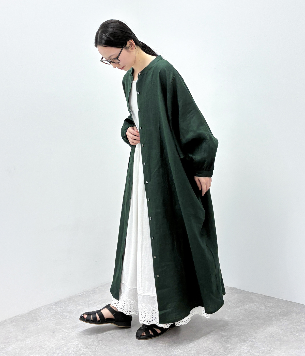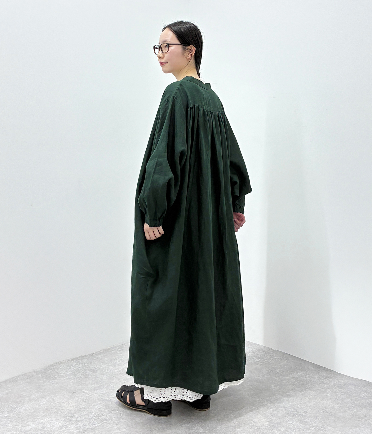 別注|14番手リネン多ボタンギャザーワンピースの着用コーディネート
