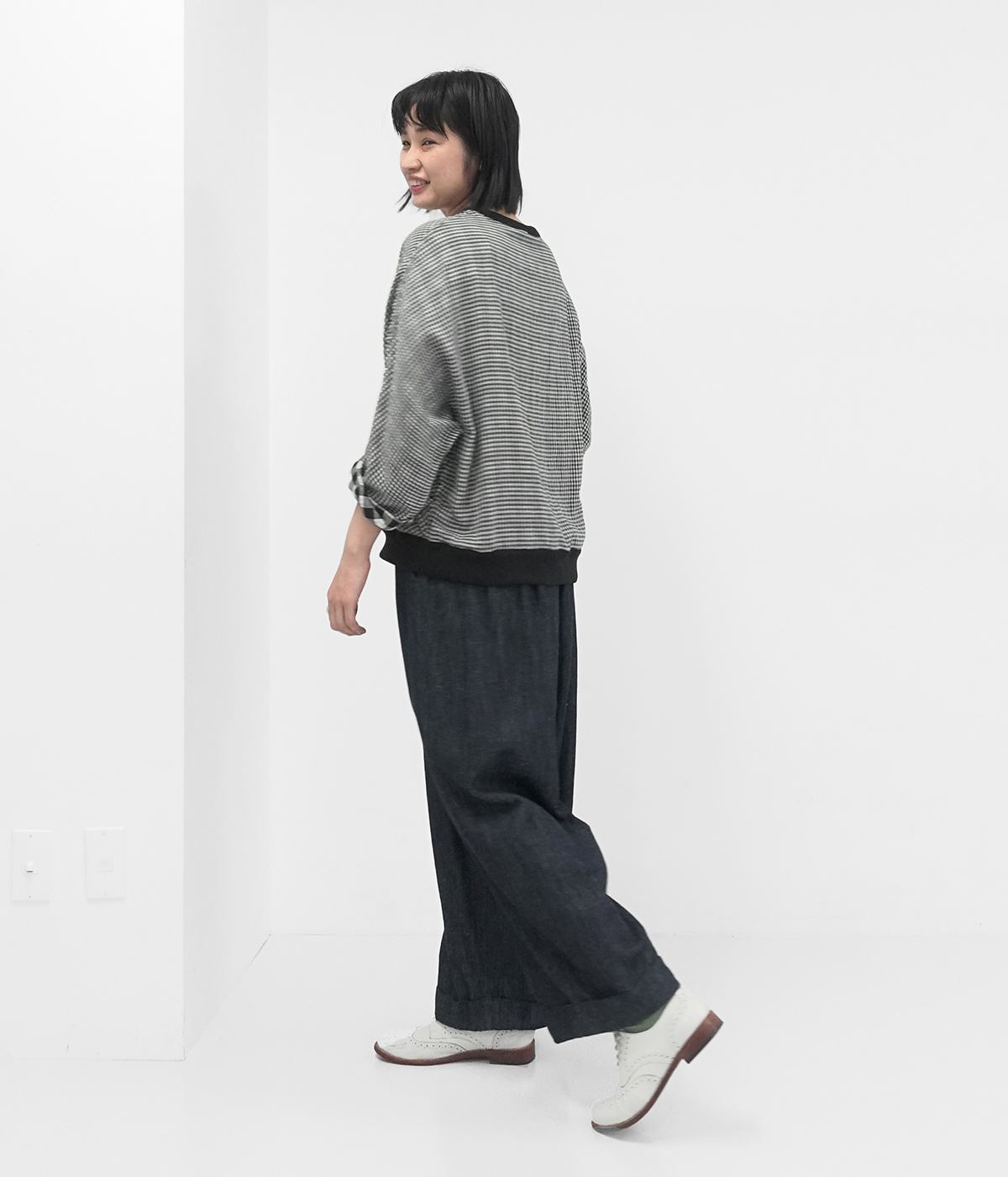 トップス:L、ボトムス:L、シューズ:25.5cmナチュラルで少し甘めなアイテムに太めのパンツを合わせるのが好きです。