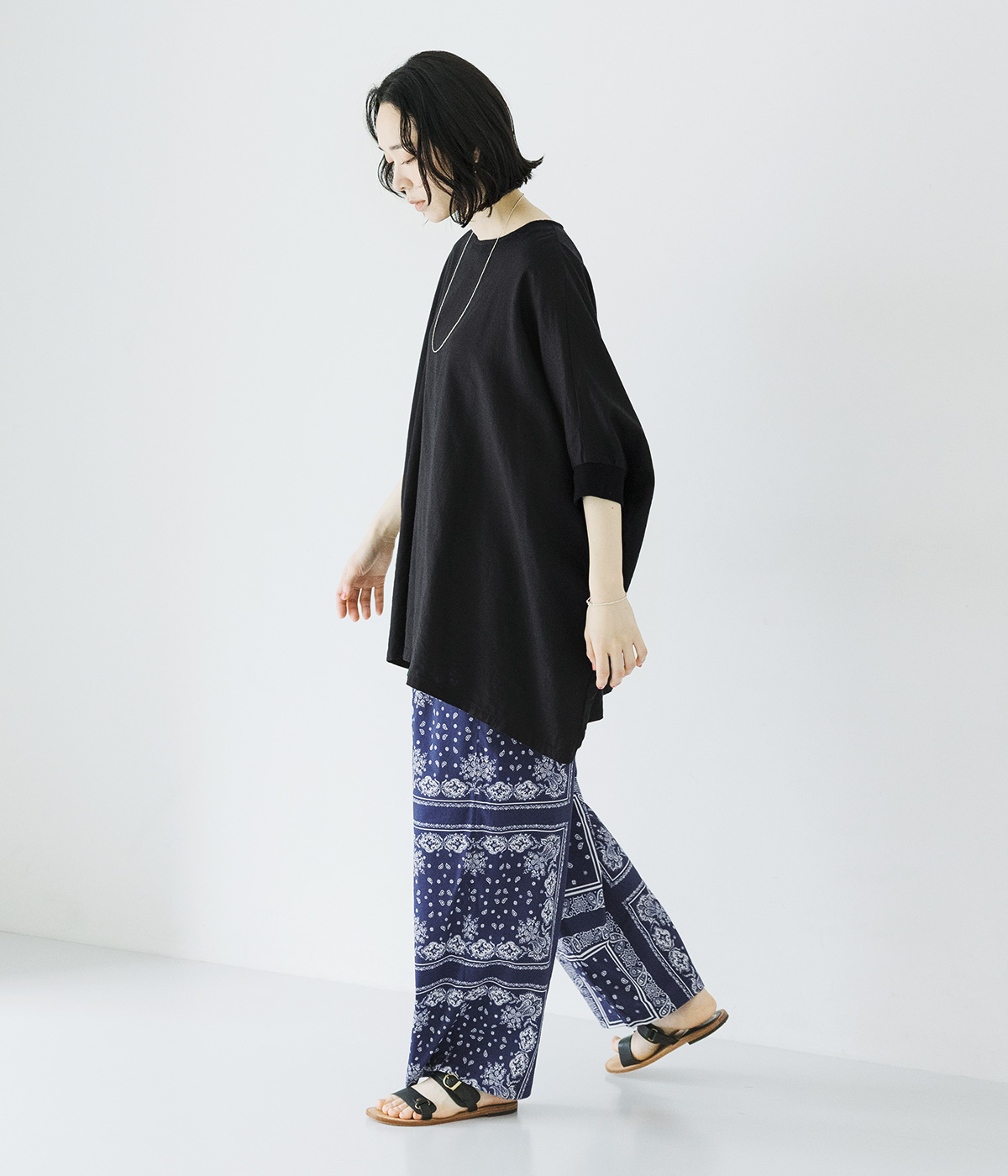 着るだけでサマになる フリル5分袖Tシャツの着用コーディネート