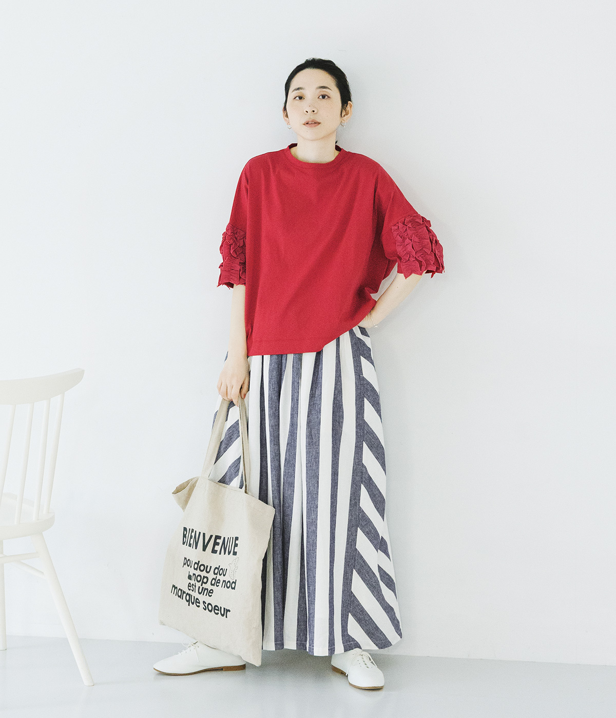 着るだけでサマになる フリル5分袖Tシャツの着用コーディネート