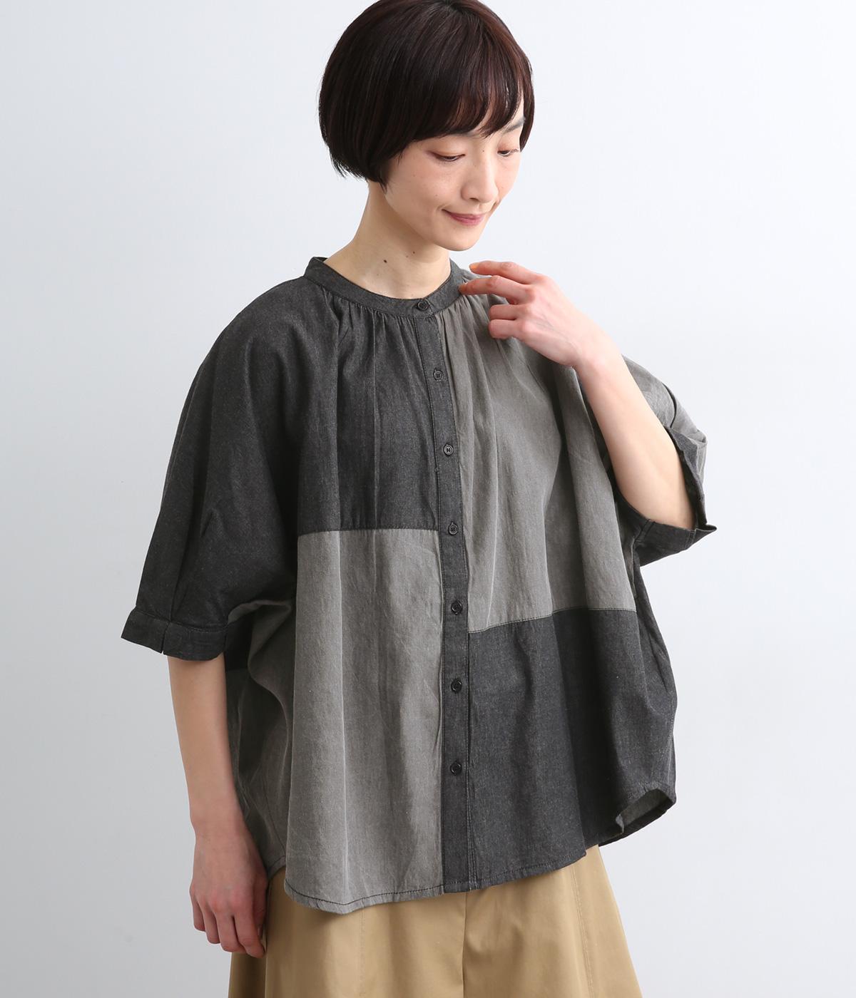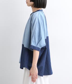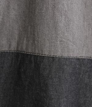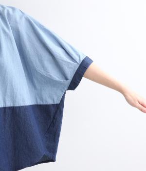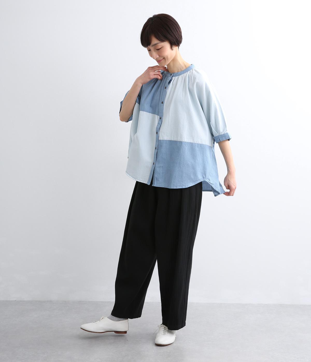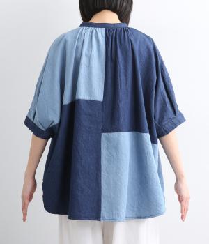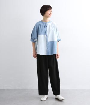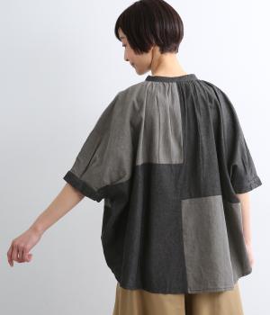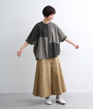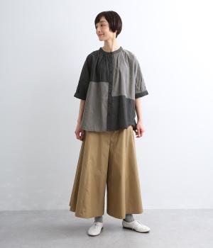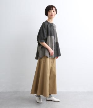 パッチワーク風の切り替えデザインが着こなしに個性をプラス。カジュアルな素材とふっくらしたボリュームスリーブのMIX感が◎。ややフレアなシルエットが着こなしやすく、羽織りスタイルもおすすめ。