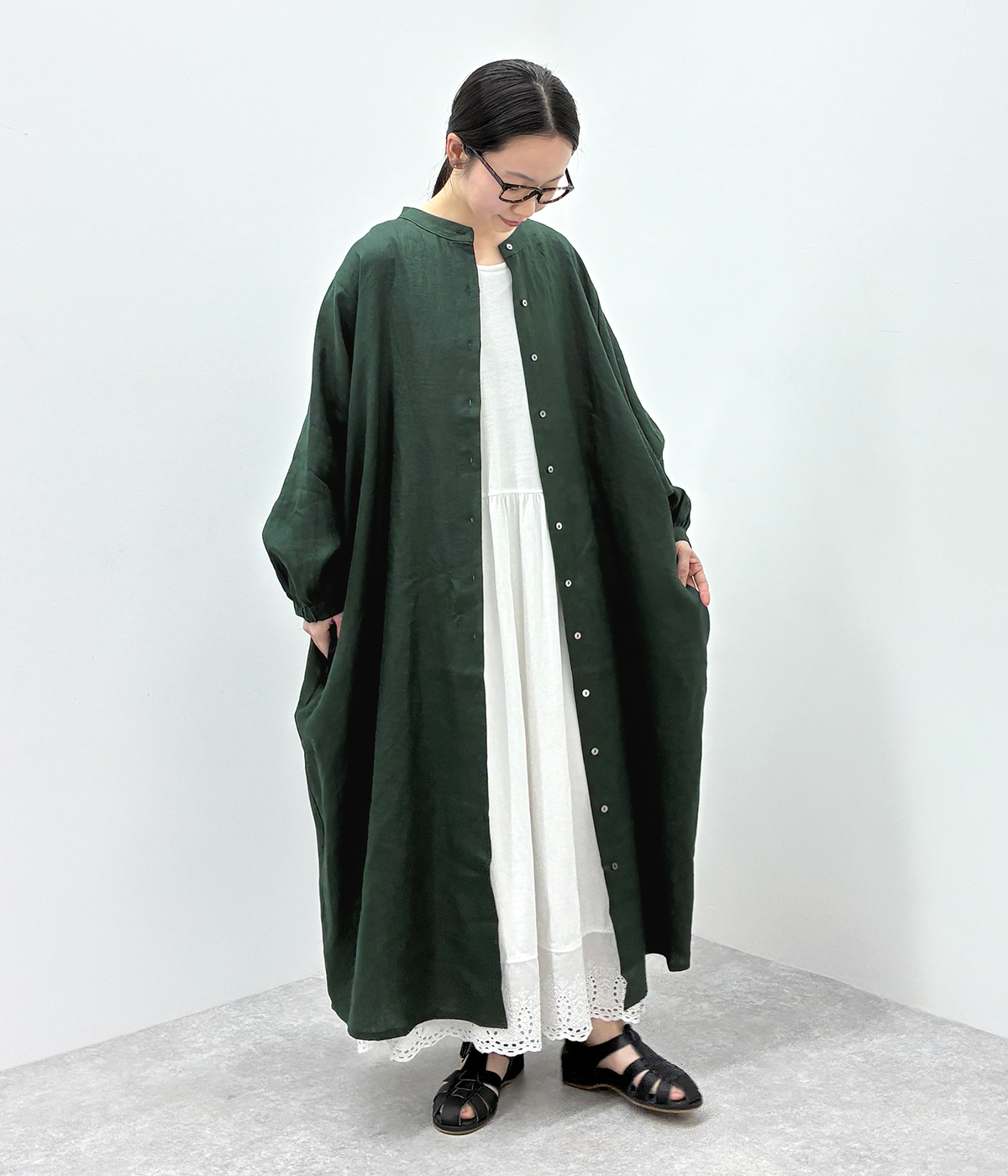 適度な厚みとハリのある、さらりとした肌触りのリネンを使用したワンピース。たっぷりとした袖のラインがアクセントになり、通気性があるのでロングシーズン快適。袖口にはゴム入りで、たくし上げたアレンジも楽しめます。背ヨークの切り替えからはギャザーを施して動きのあるバックスタイルに仕上げました。軽めの羽織りものとしても活躍してくれます。