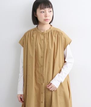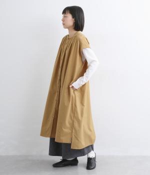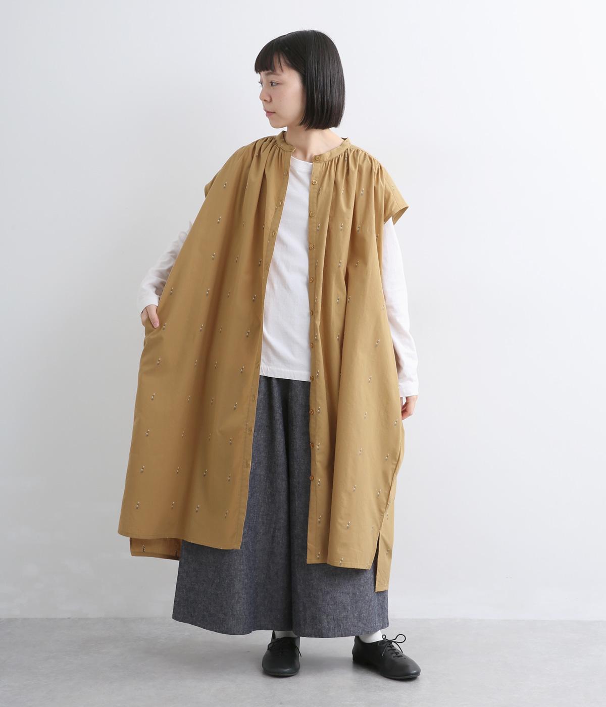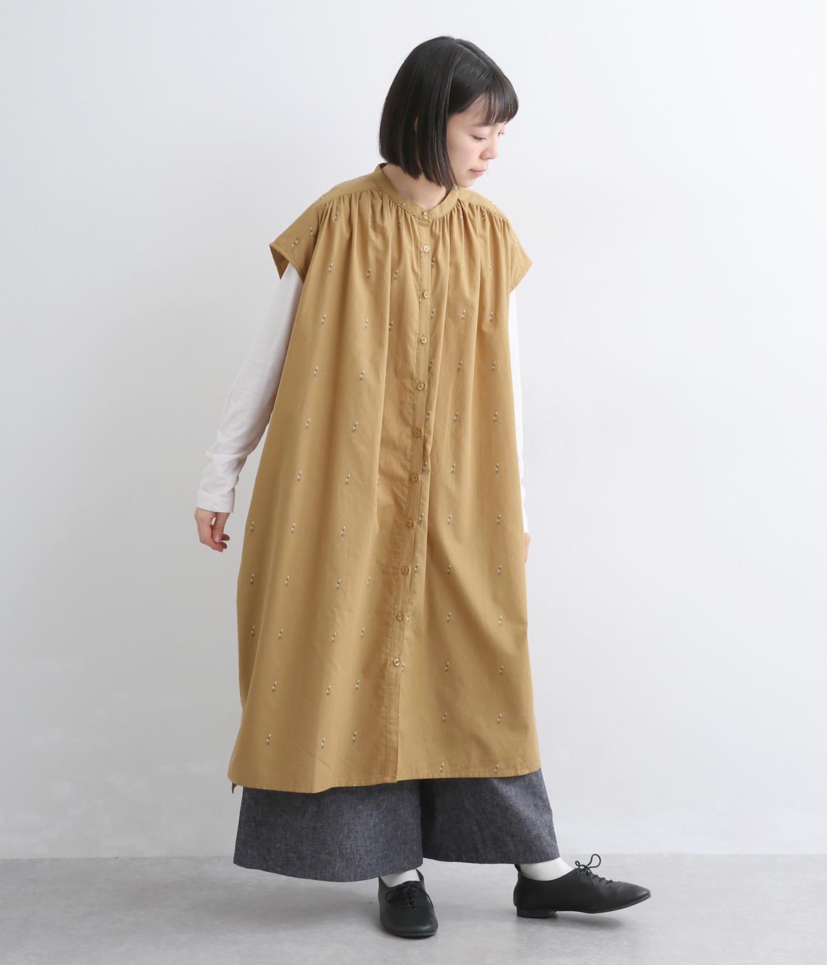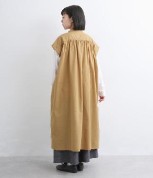 織りで表現したストライプと小花柄が奥行きのある表情をつくるワンピース。前後ヨークにたっぷりとギャザーをほどこし、ふんわりとした女性らしいシルエットを描きます。羽織としても着まわしでき、ロングシーズン活躍します。