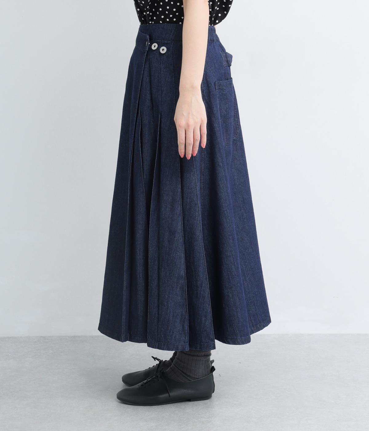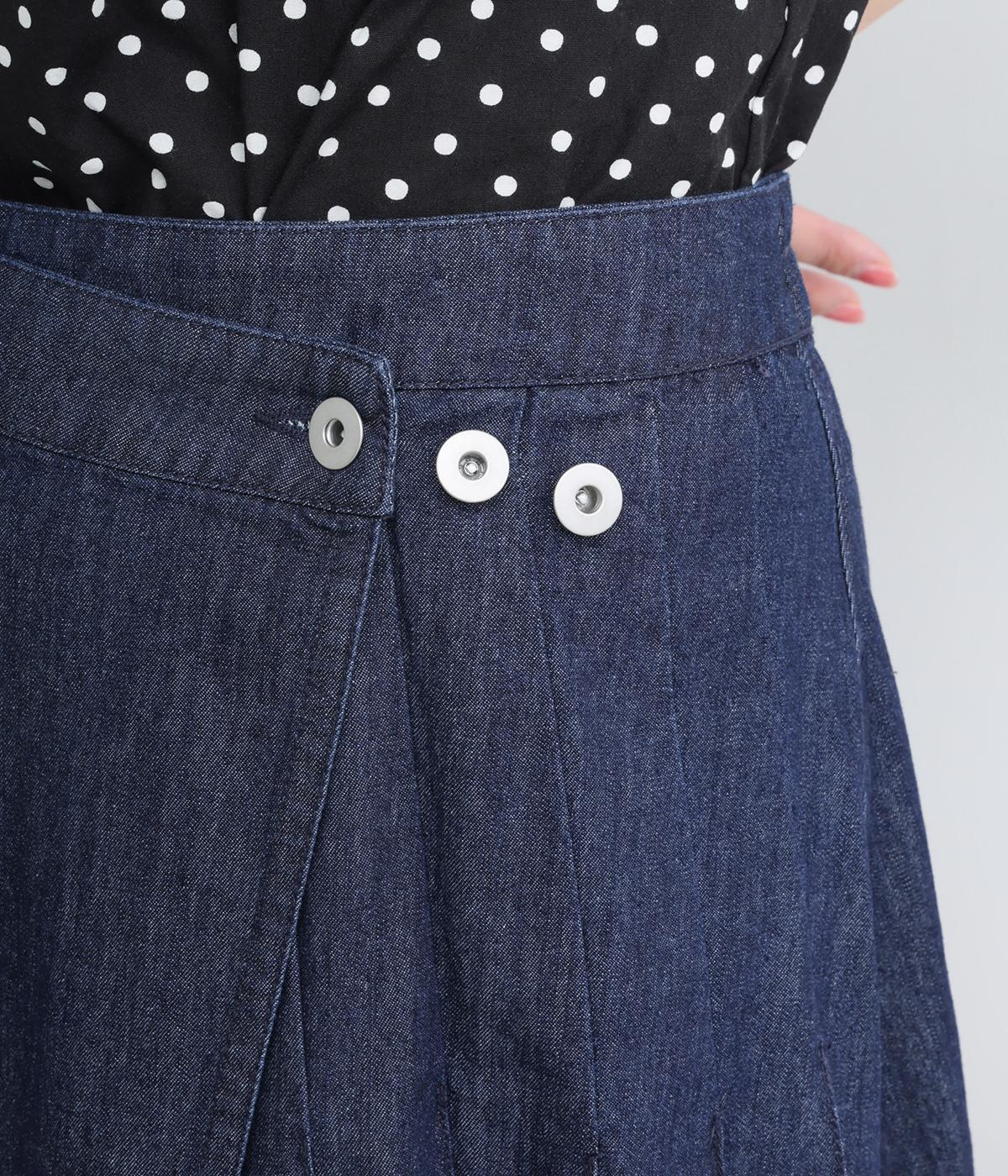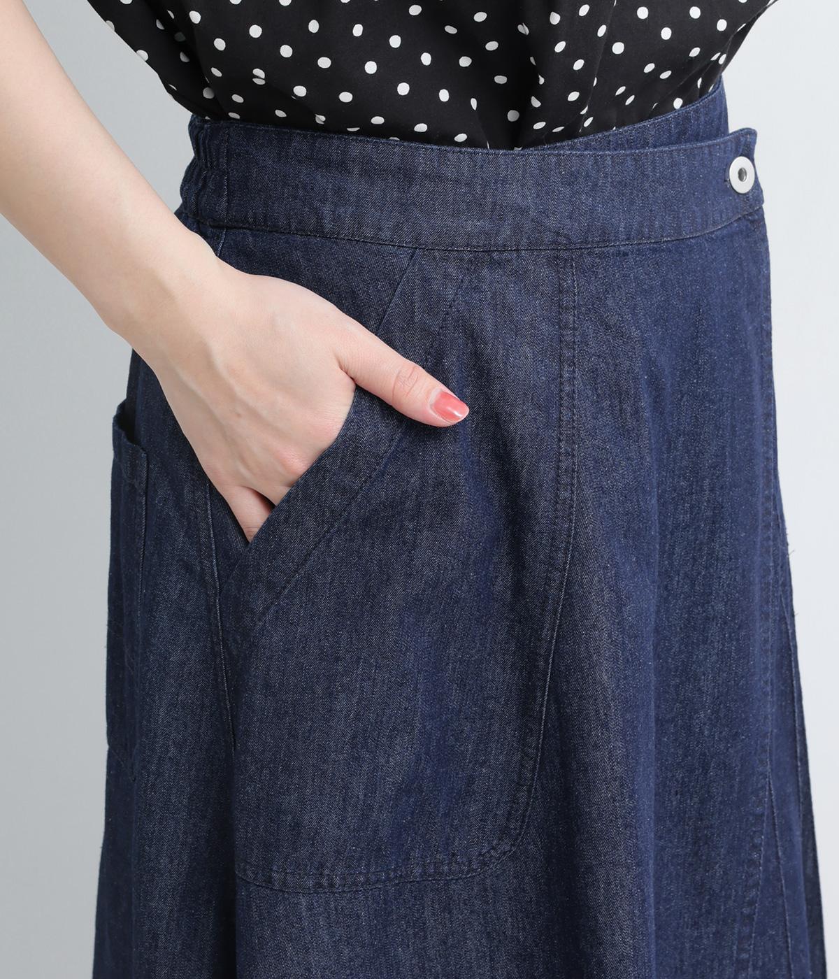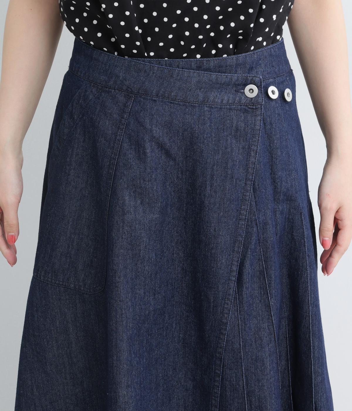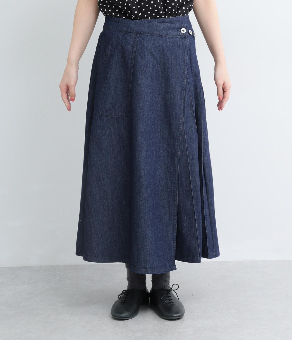アイビールック要素を取り入れた巻きスカートは、片側にタックを入れたアシンメトリーデザインが洗練された印象に。ウエストはボタンで微調整可能。後ろウエストはゴム仕様でフィット感よく仕上がっています。いつものデニムスタイルを格上げする一枚。