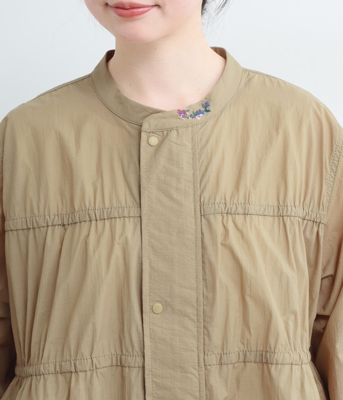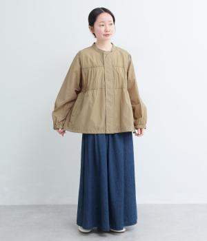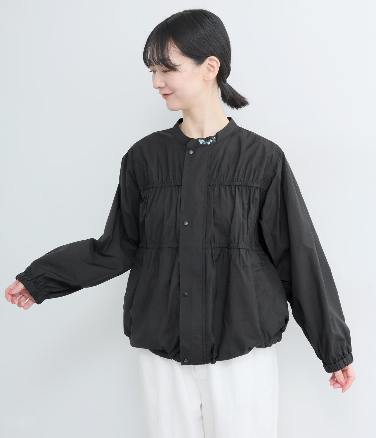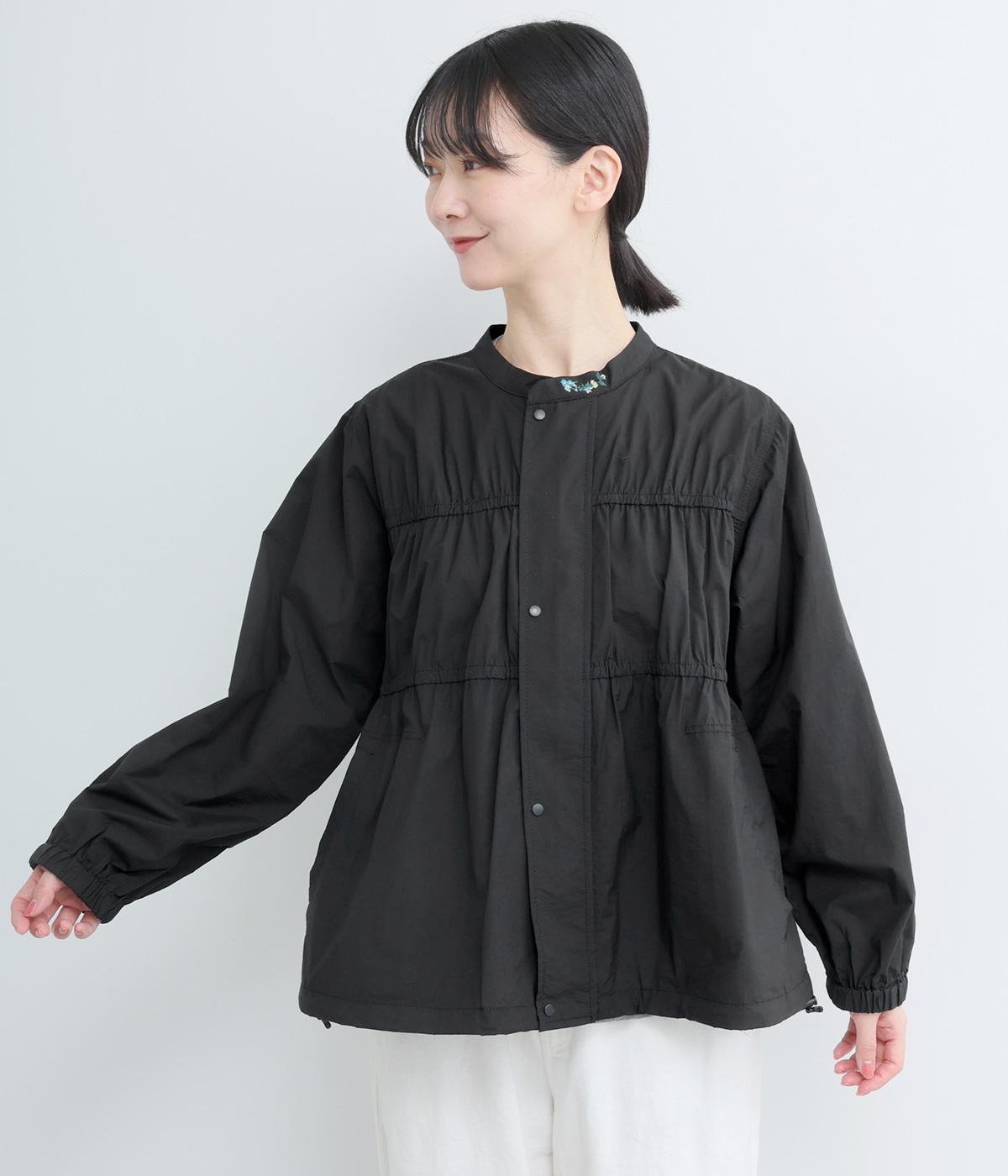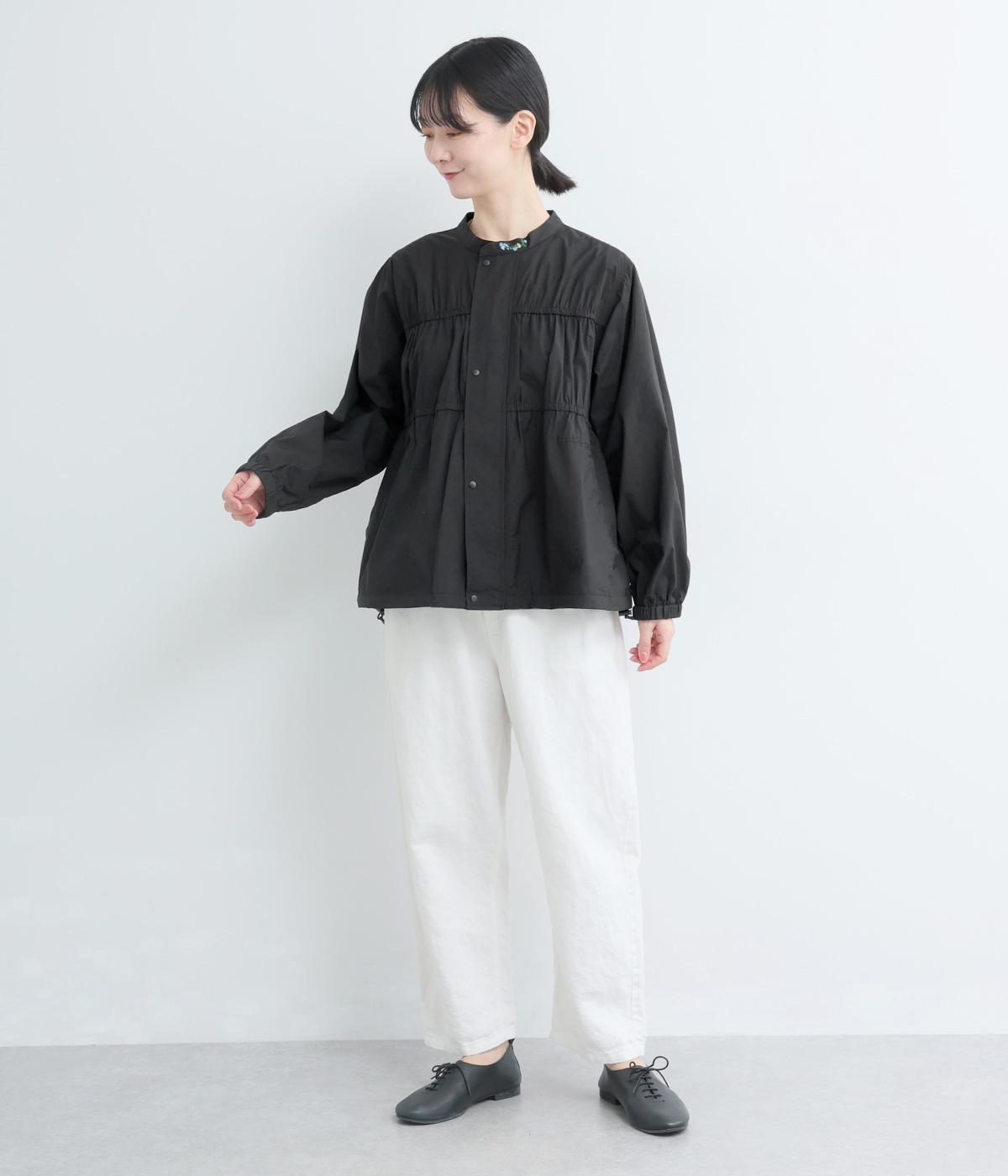 フロントの2段のギャザーデザインに襟元の刺しゅうがシンプルながらも華やか見えするジャケット。前立てをすっきりした太めにすることで甘さを中和し、ふだん使いしやすさを意識。裾はアジャスターでニュアンスをつけられます。
