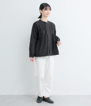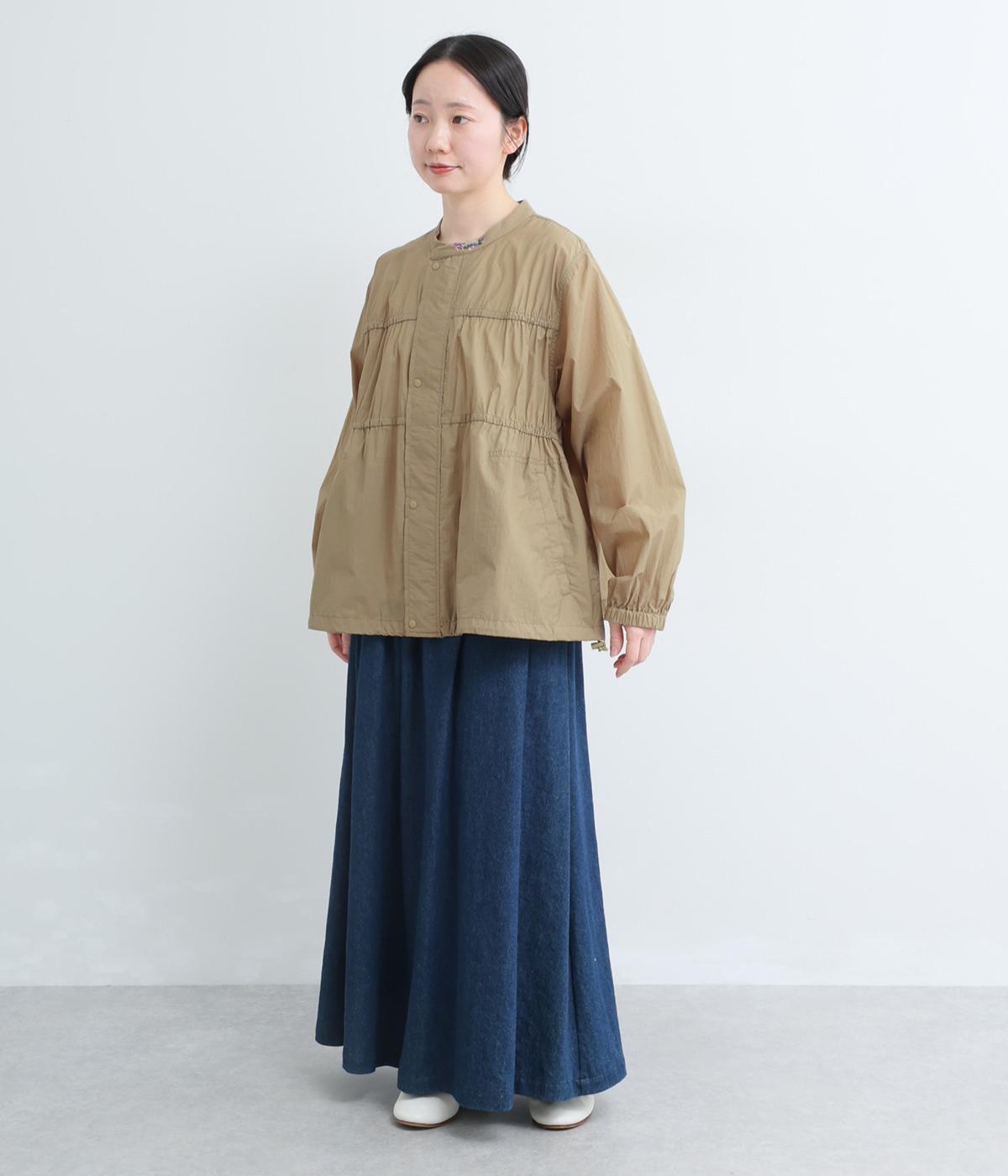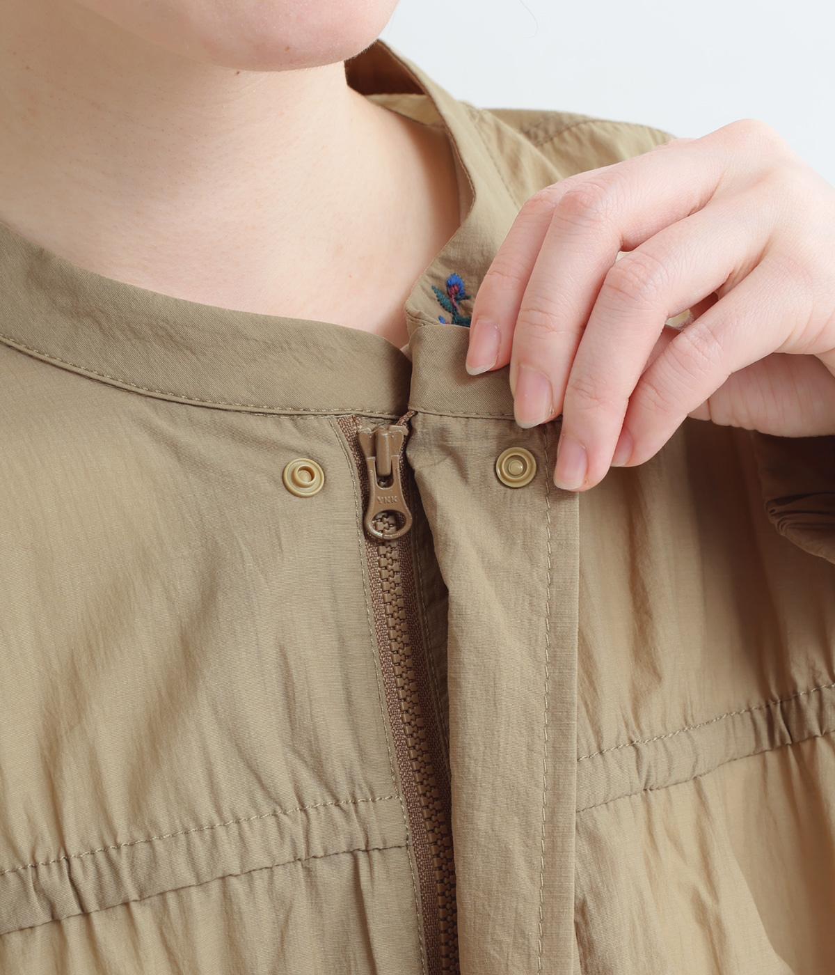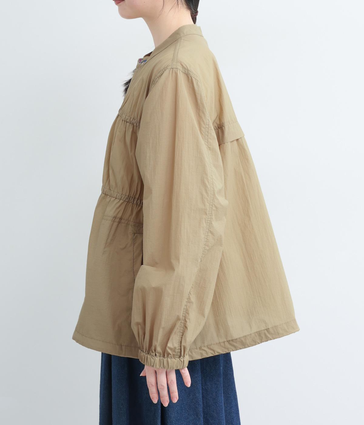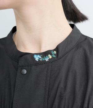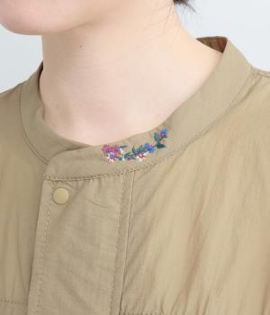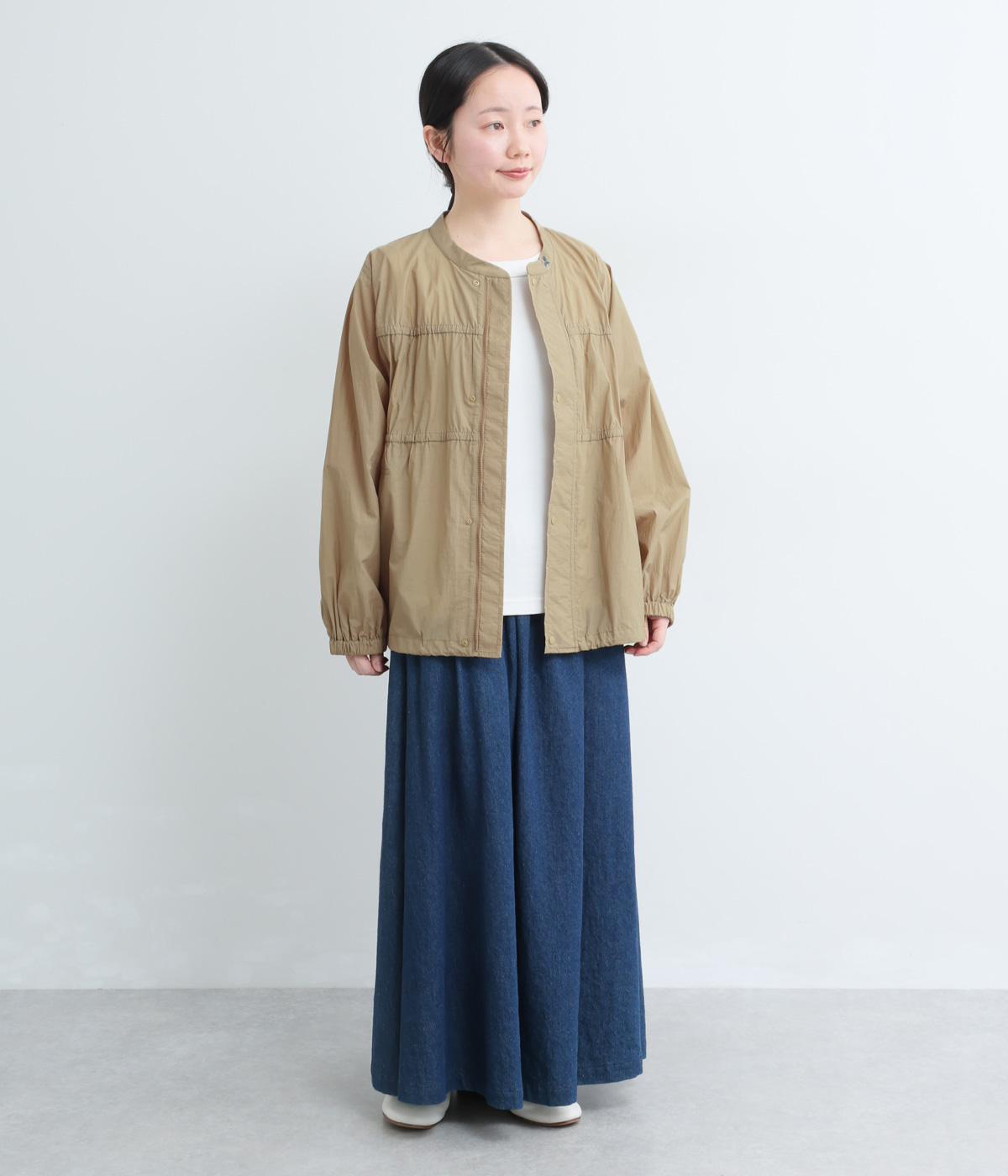 フロントの2段のギャザーデザインに襟元の刺しゅうがシンプルながらも華やか見えするジャケット。前立てをすっきりした太めにすることで甘さを中和し、ふだん使いしやすさを意識。裾はアジャスターでニュアンスをつけられます。