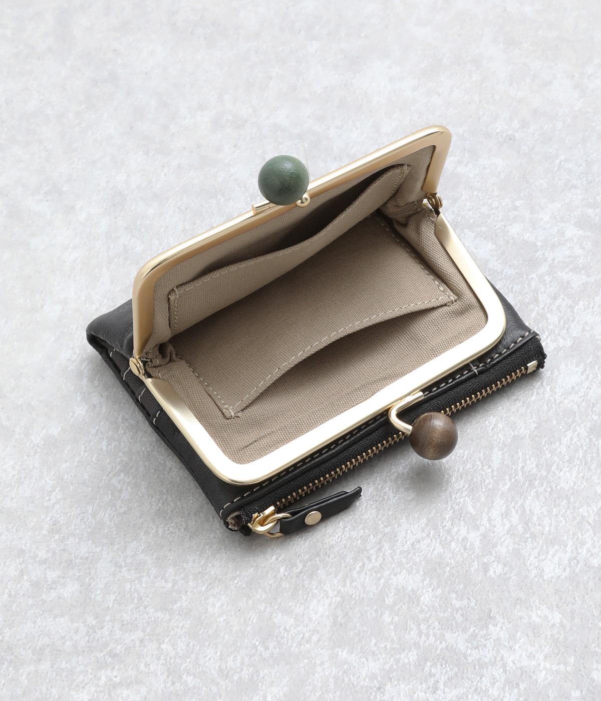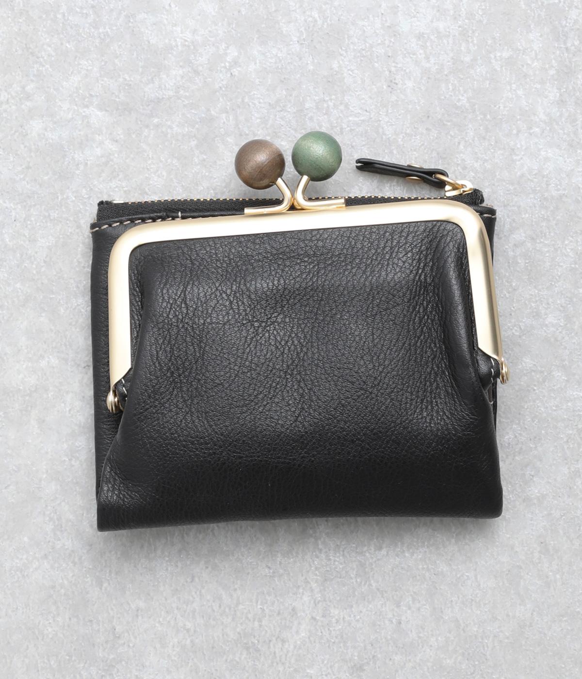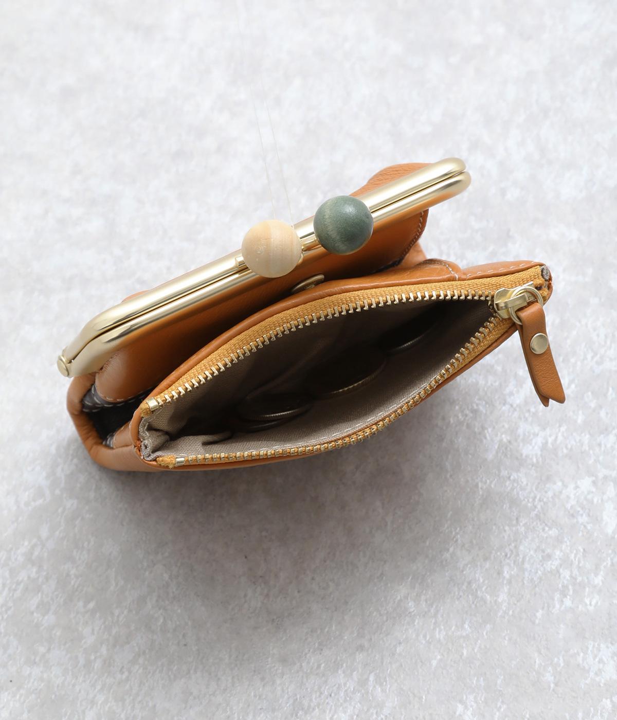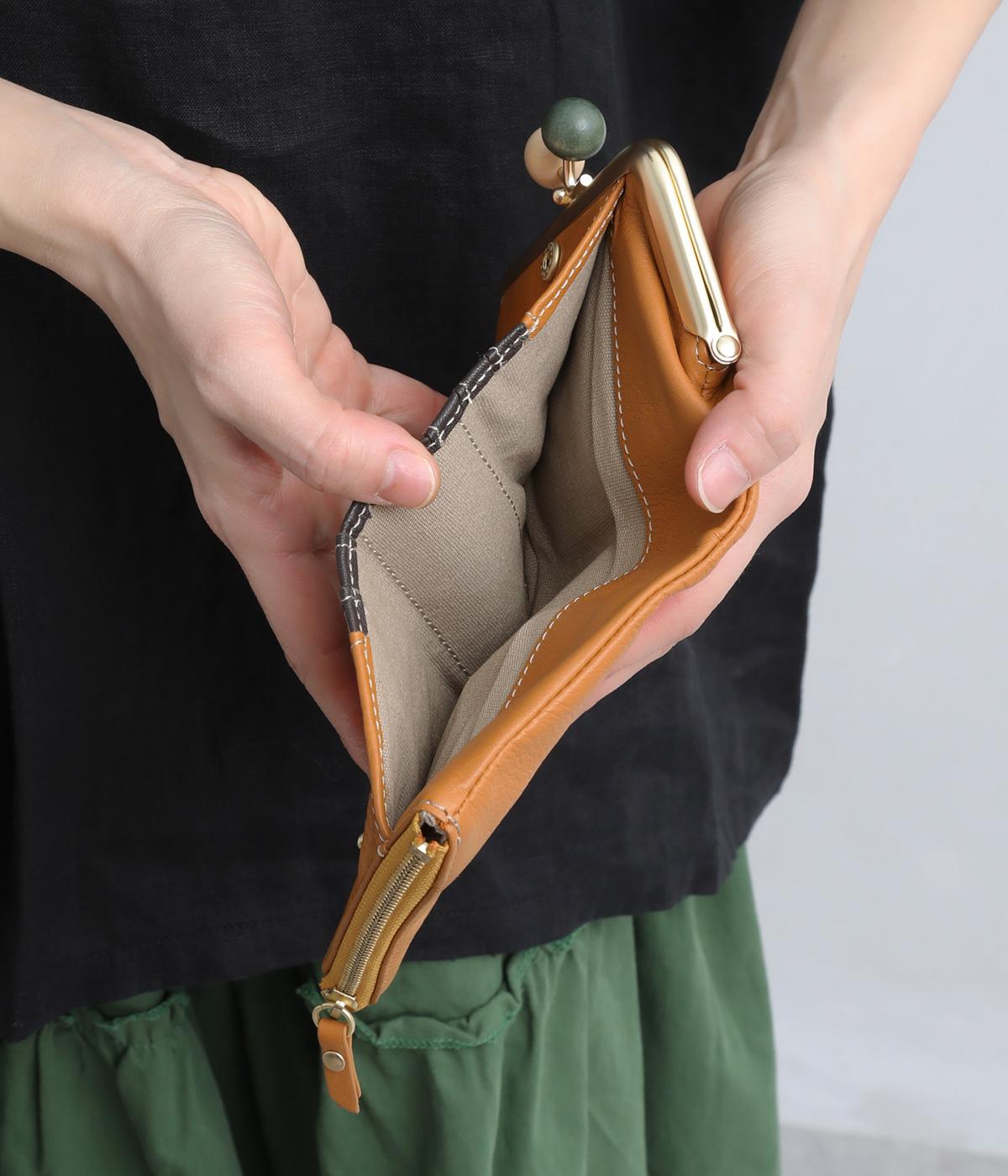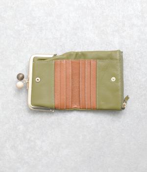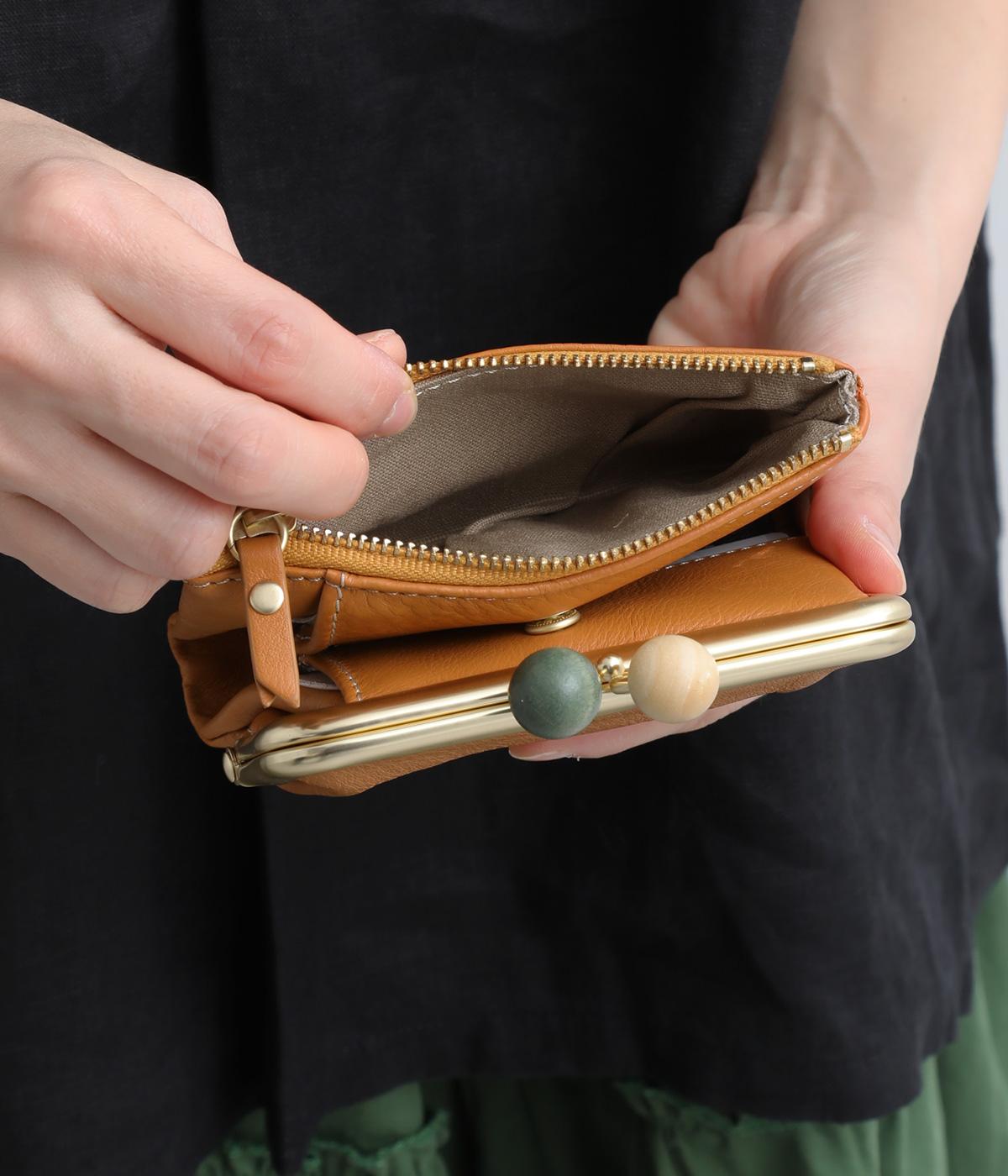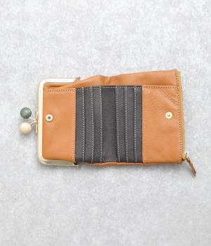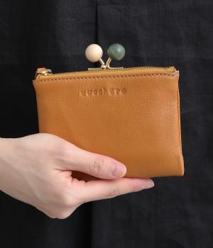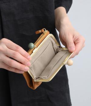 美しい木目の天然木玉がレトロなワンポイントになったがま口ウォレット。折りたたみ式なのでお札やカードも出し入れしやすく、ファスナーポケットには領収書や小物の収納にも便利。がま口内もポケットがついているので小銭を仕分けしても◎。