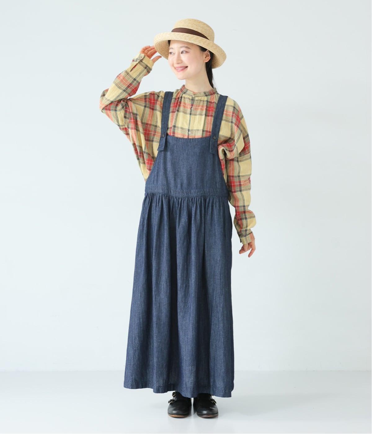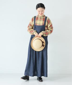 デニムのジャンパースカートに、小物でリラックス感を添えたナチュラルコーデ。帽子のリボンとサンダルのカラーを揃えることで、すっきりとまとまりのある、洗練された印象に仕上がります。