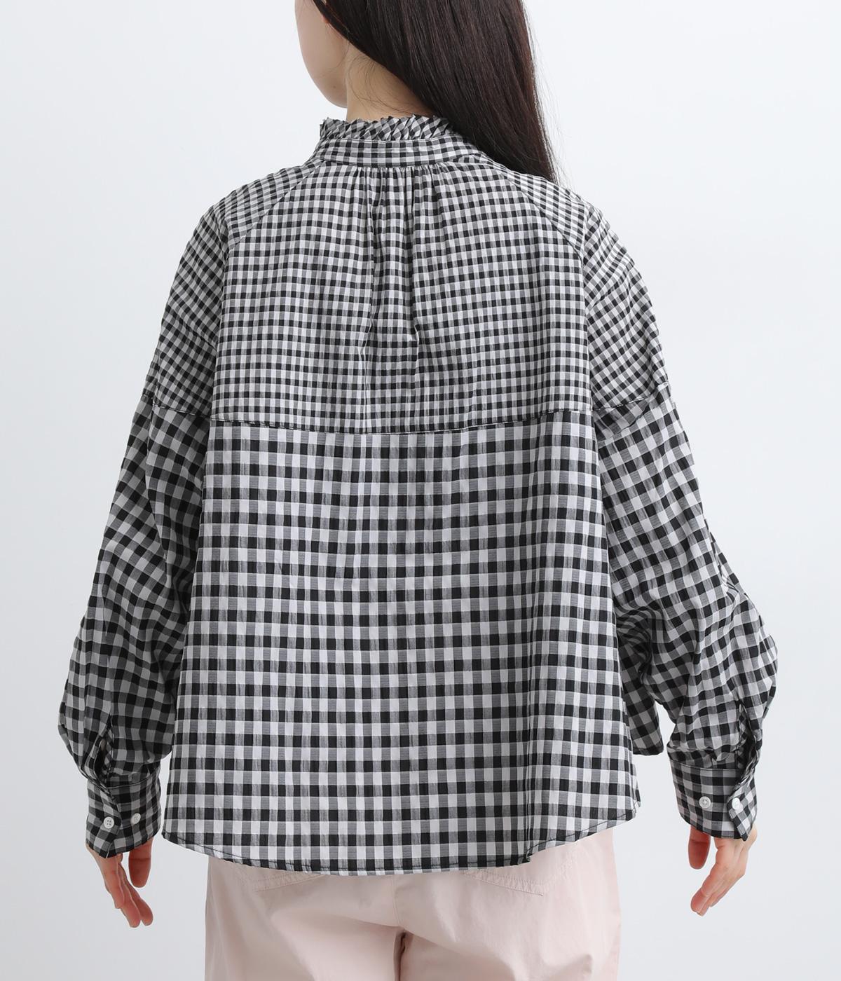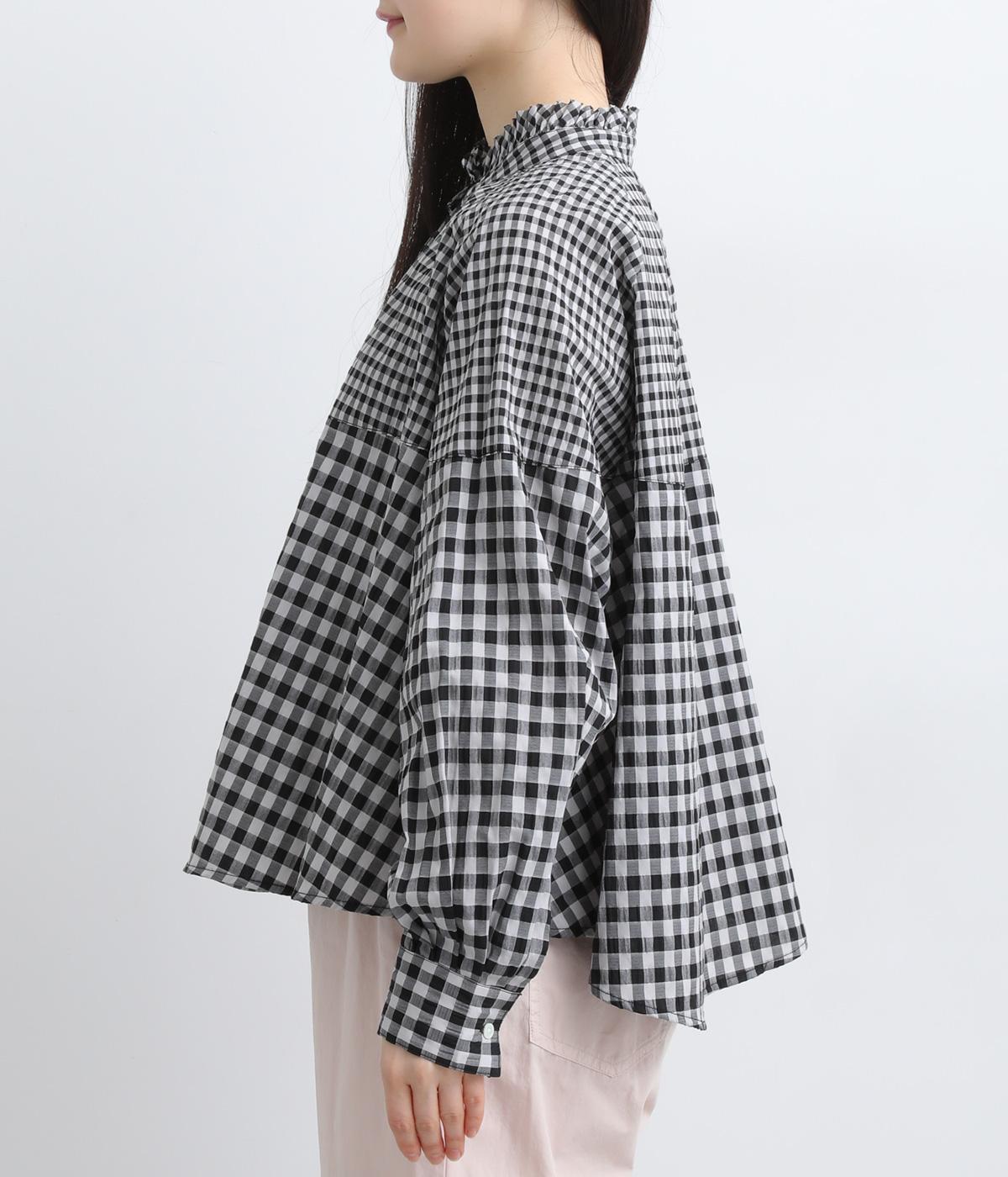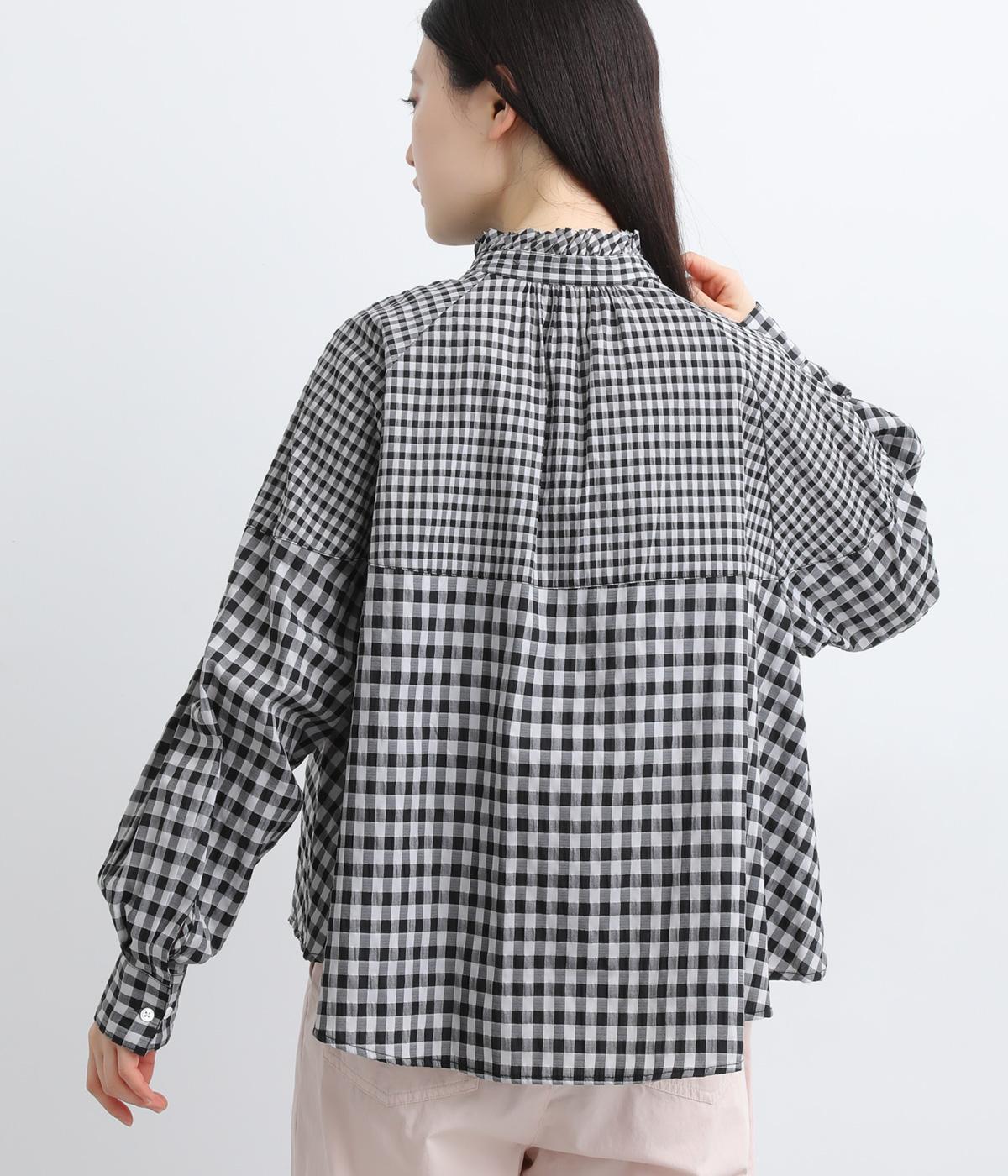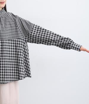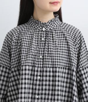 大小異なるチェック柄をパッチワークのように組み合わせました。肩のラインをやわらかく描くラグラン袖やスタンドフリルネックが女性らしい印象に。シックな配色が甘さを調和し、大人ならではのチェックアイテムに仕上がっています。