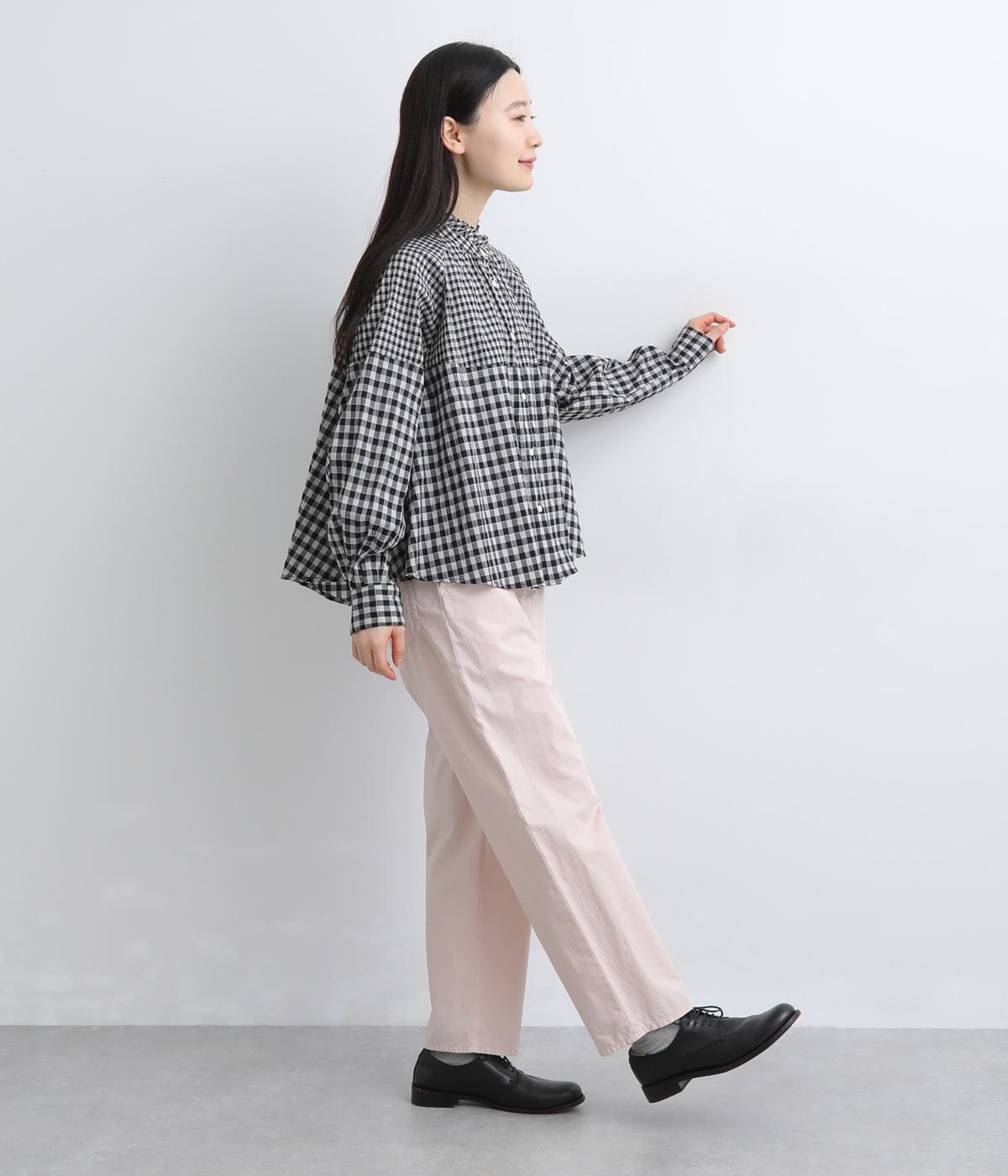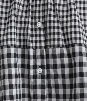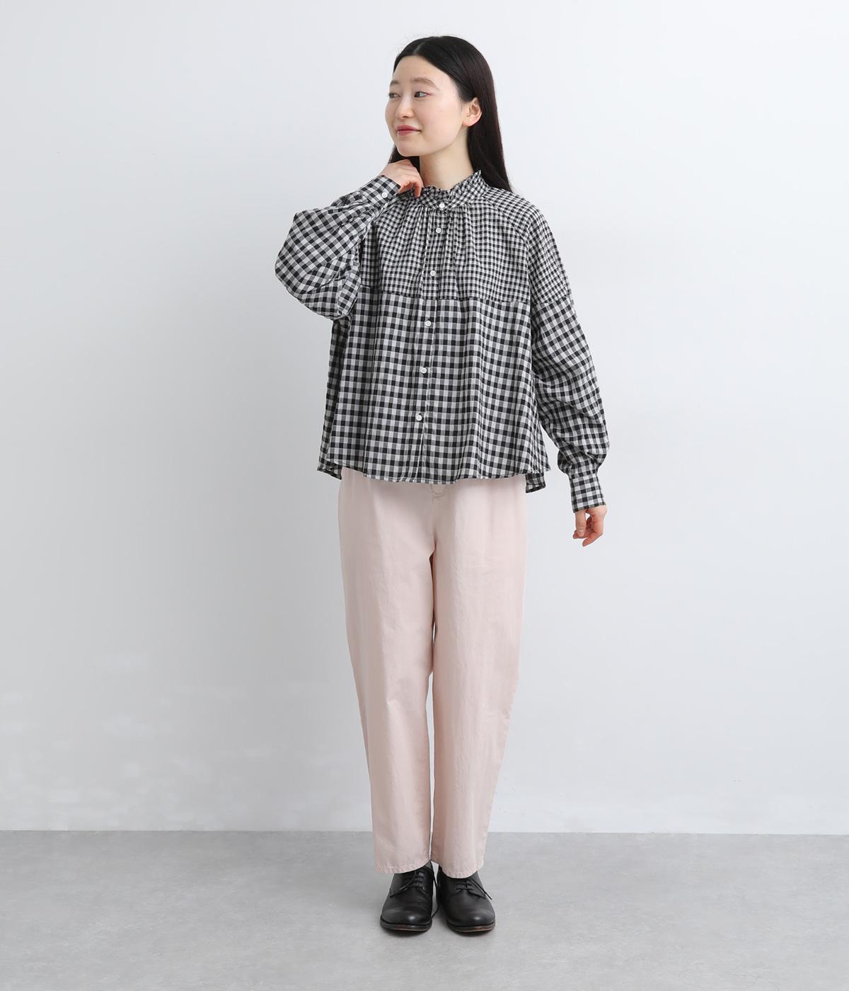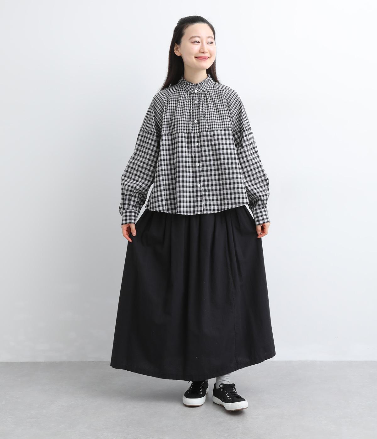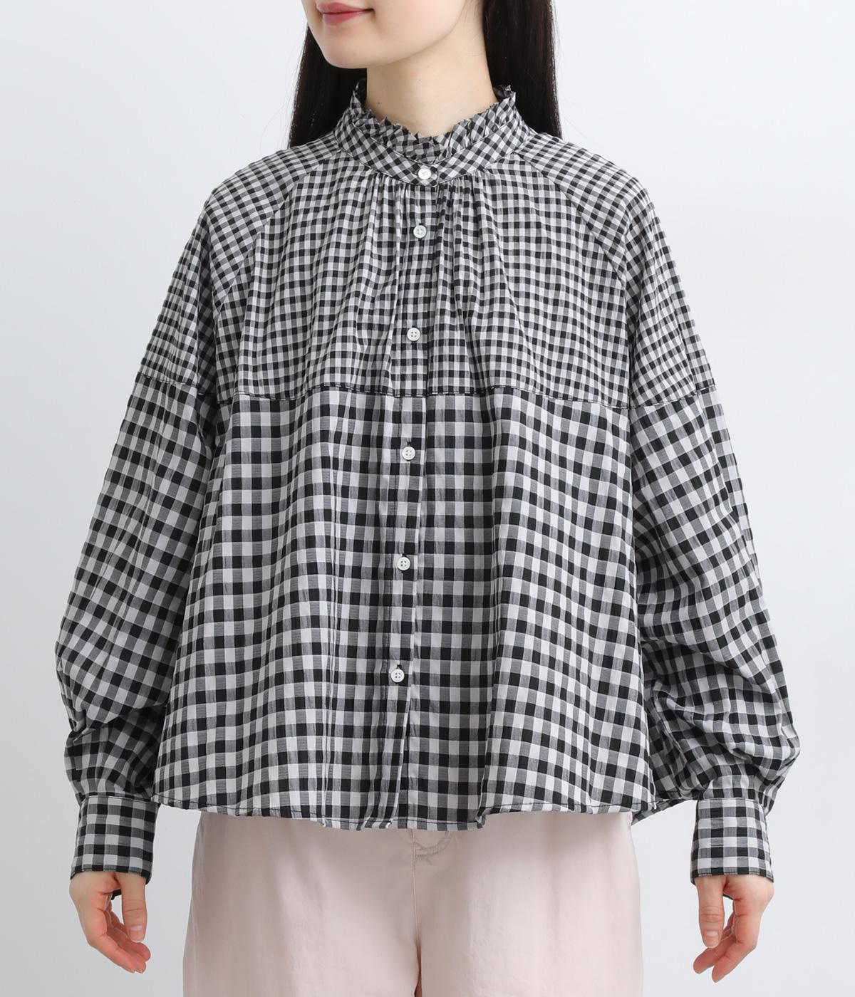 大小異なるチェック柄をパッチワークのように組み合わせました。肩のラインをやわらかく描くラグラン袖やスタンドフリルネックが女性らしい印象に。シックな配色が甘さを調和し、大人ならではのチェックアイテムに仕上がっています。