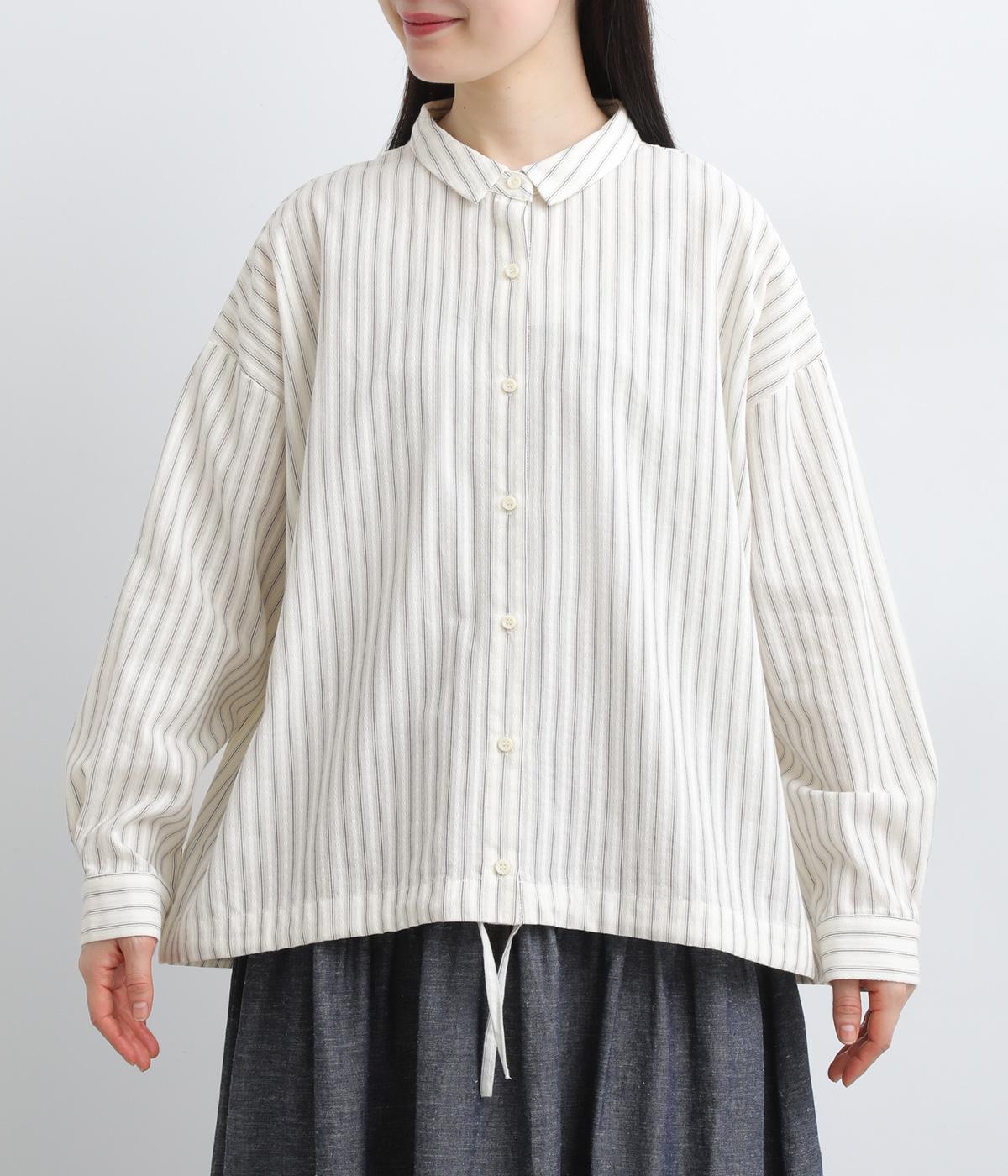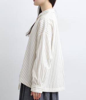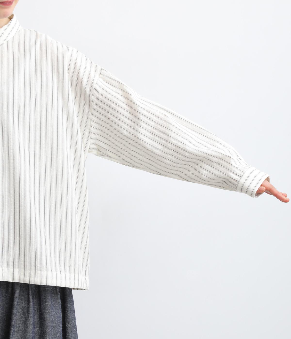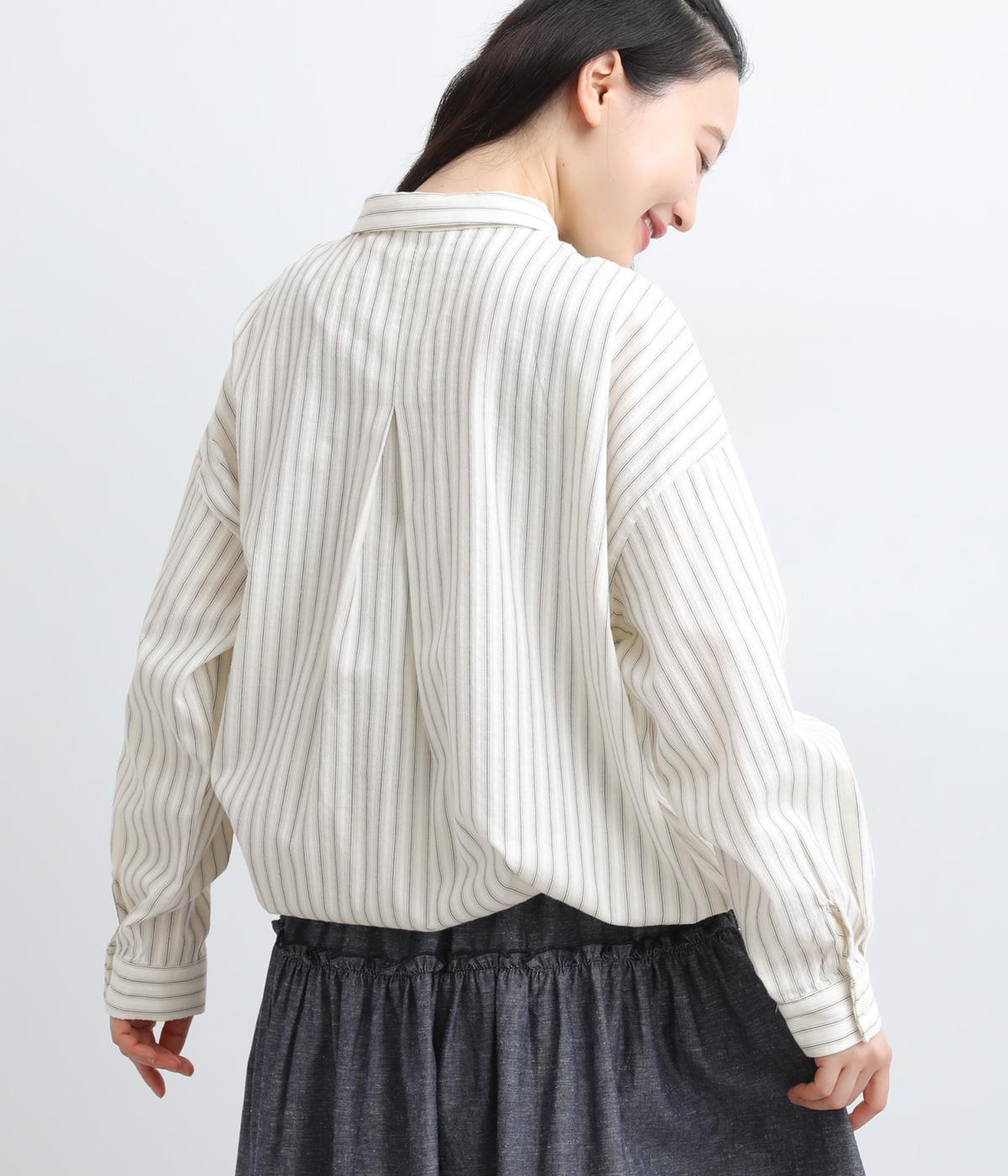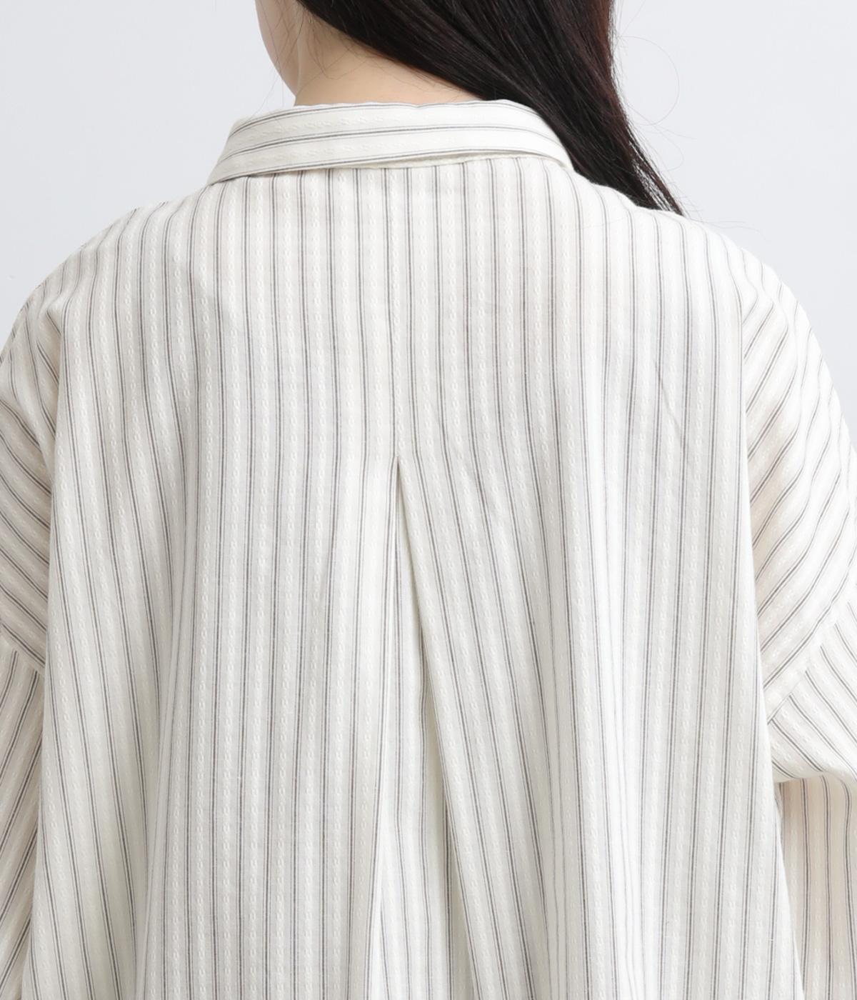 ドビー織りによるストライプ柄がクリーンな印象を与える一枚。シルエットはゆったりとリラクシーで、裾をしぼってメリハリをきかせたアレンジも◎。着丈に前後差をつけているので横姿もきれい見え。
