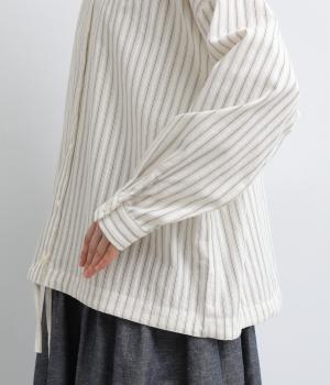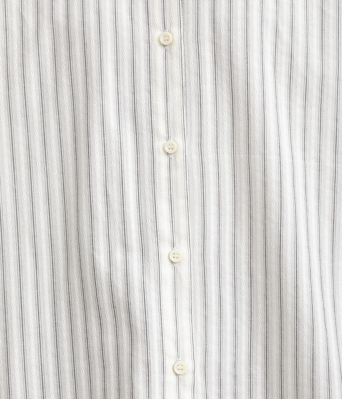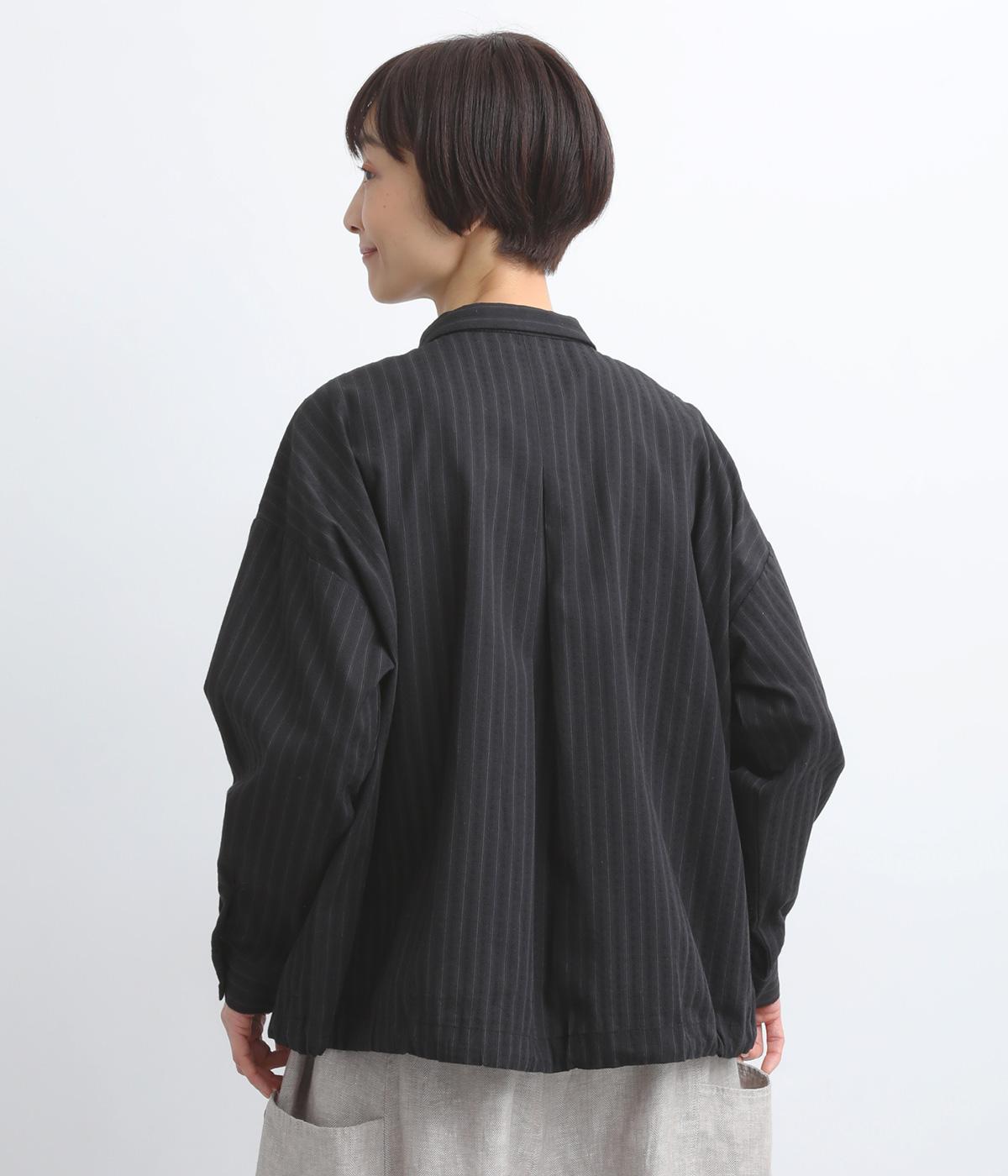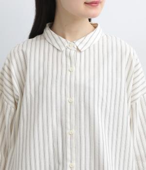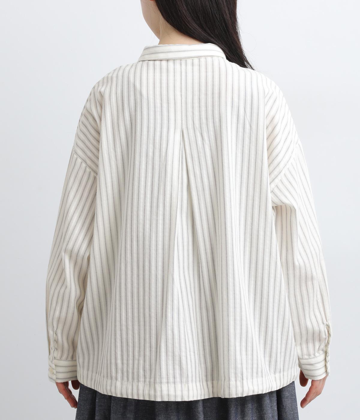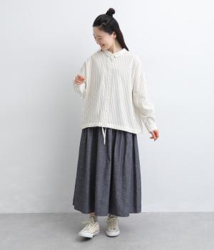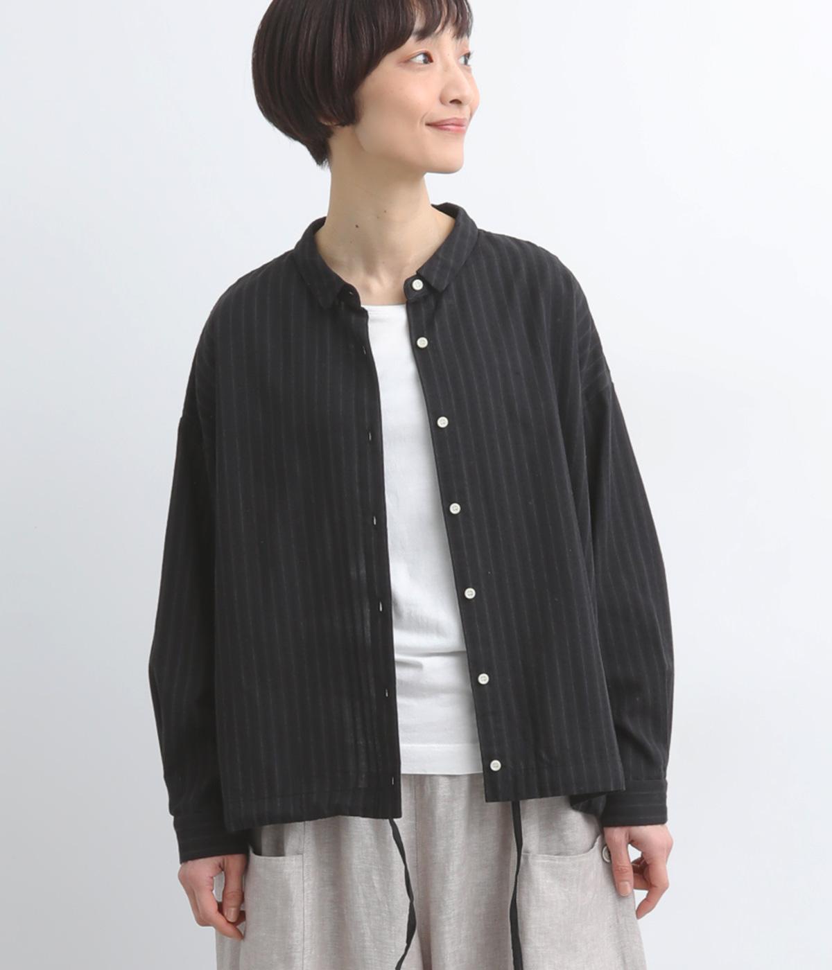 ドビー織りによるストライプ柄がクリーンな印象を与える一枚。シルエットはゆったりとリラクシーで、裾をしぼってメリハリをきかせたアレンジも◎。着丈に前後差をつけているので横姿もきれい見え。