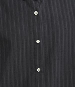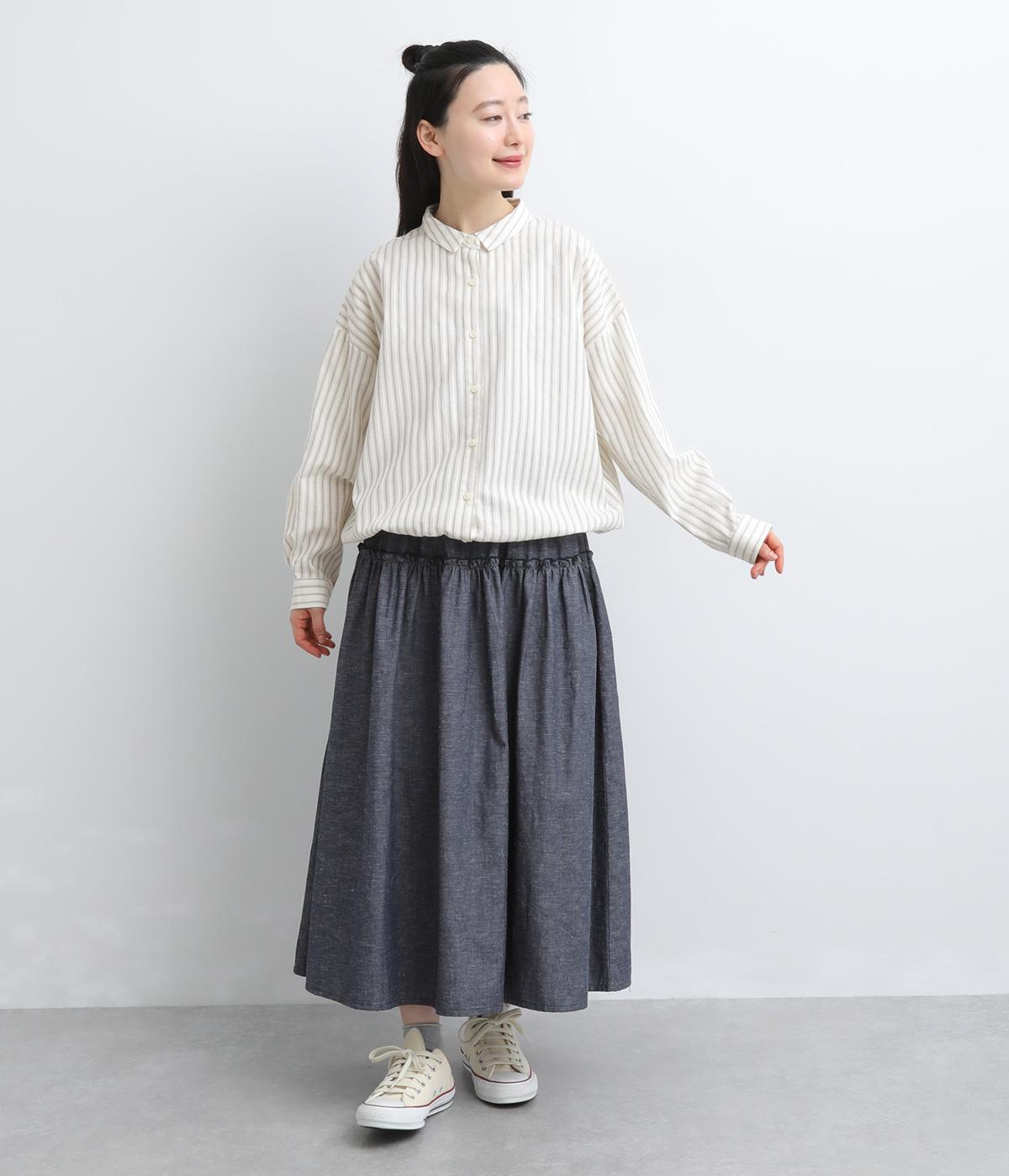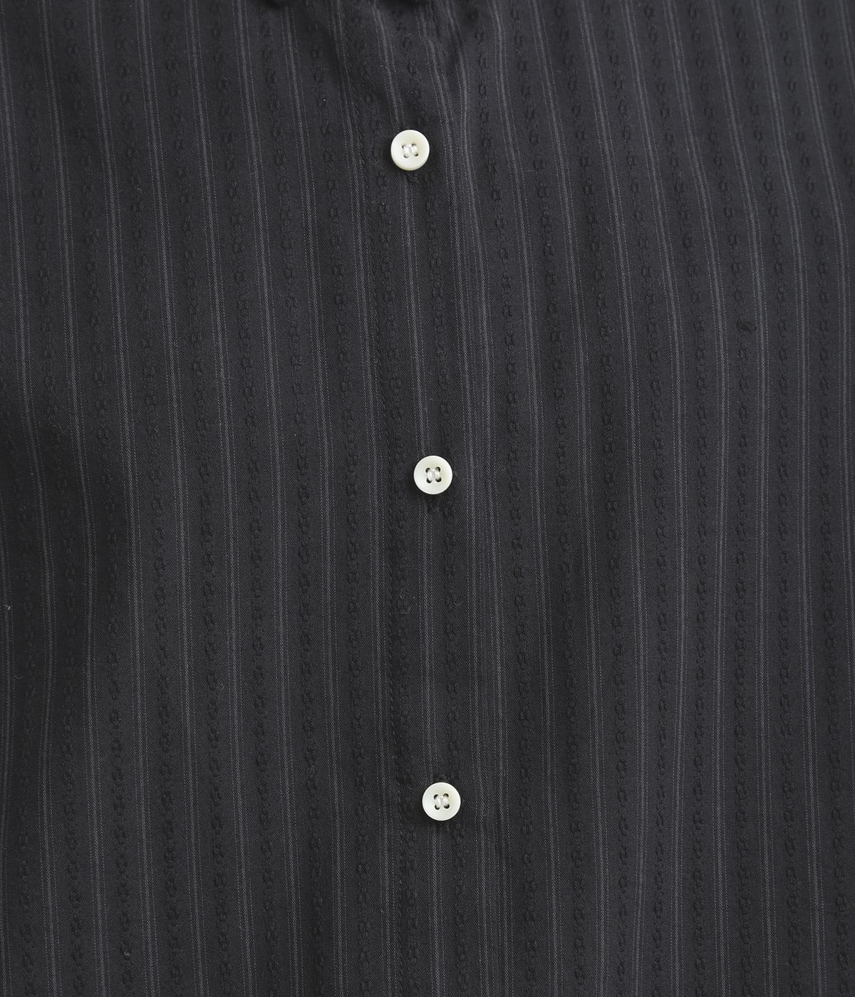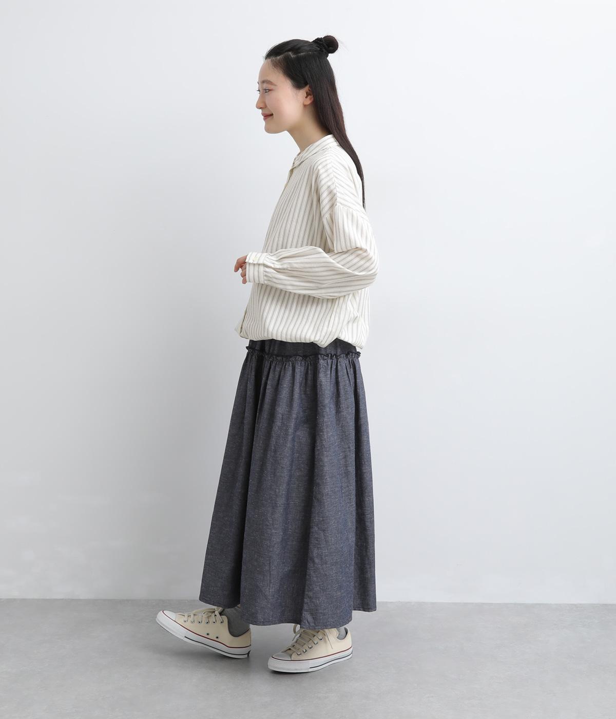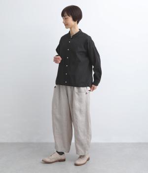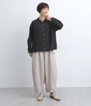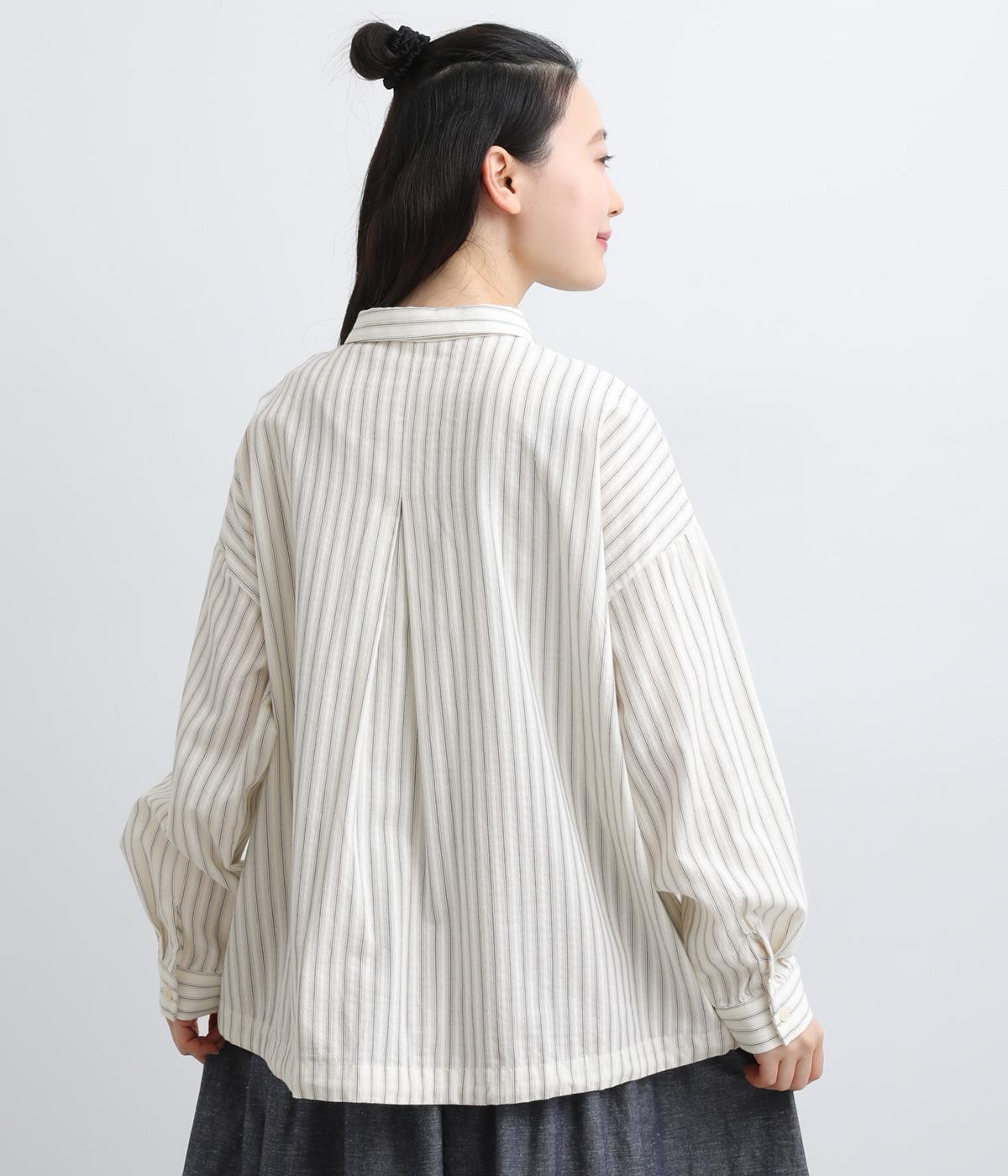 ドビー織りによるストライプ柄がクリーンな印象を与える一枚。シルエットはゆったりとリラクシーで、裾をしぼってメリハリをきかせたアレンジも◎。着丈に前後差をつけているので横姿もきれい見え。