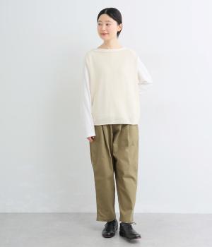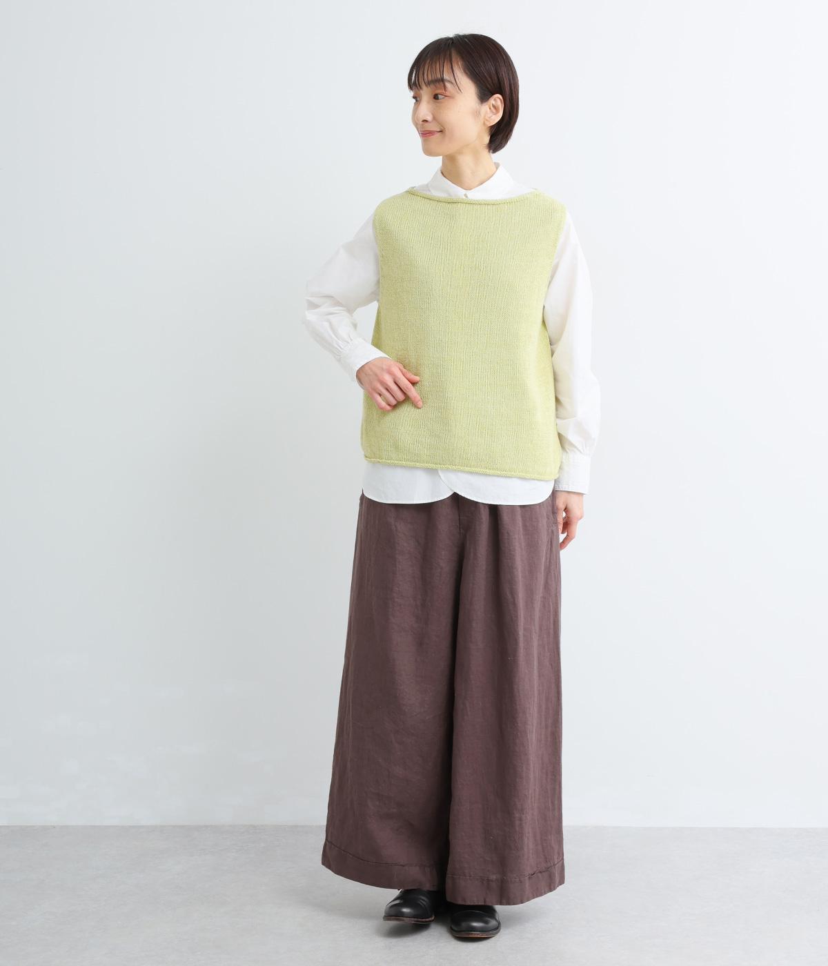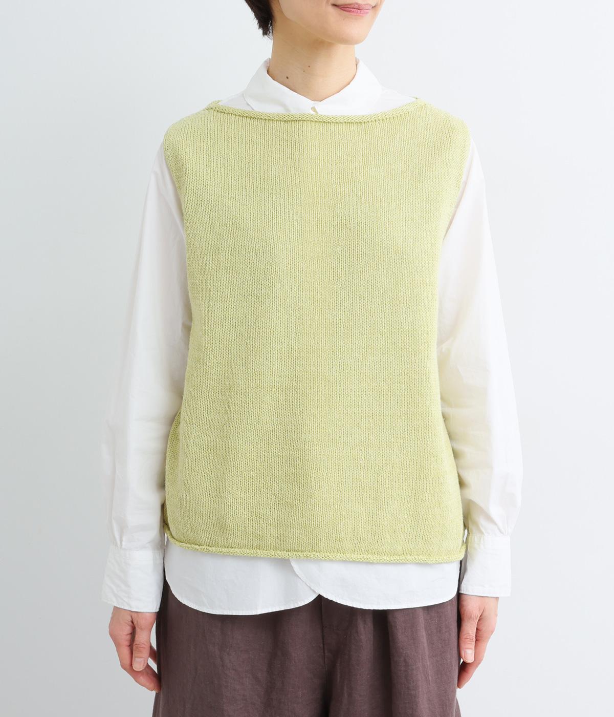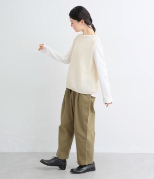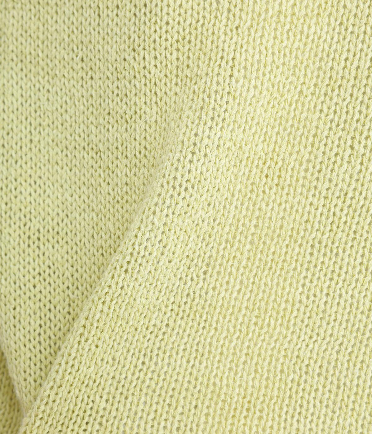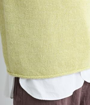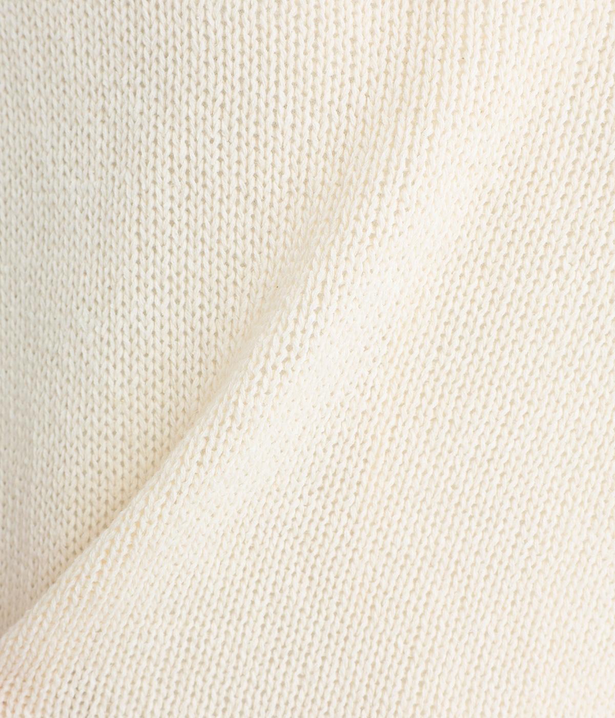 ヘンプのドライな質感がナチュラルな雰囲気を運びます。ローゲージで、ざっくりと軽やか。ごわつき感の少ないしなやかな肌ざわりで、心地よく着られます。