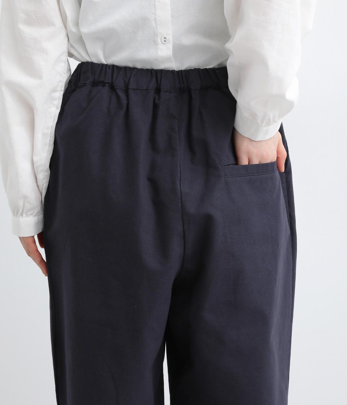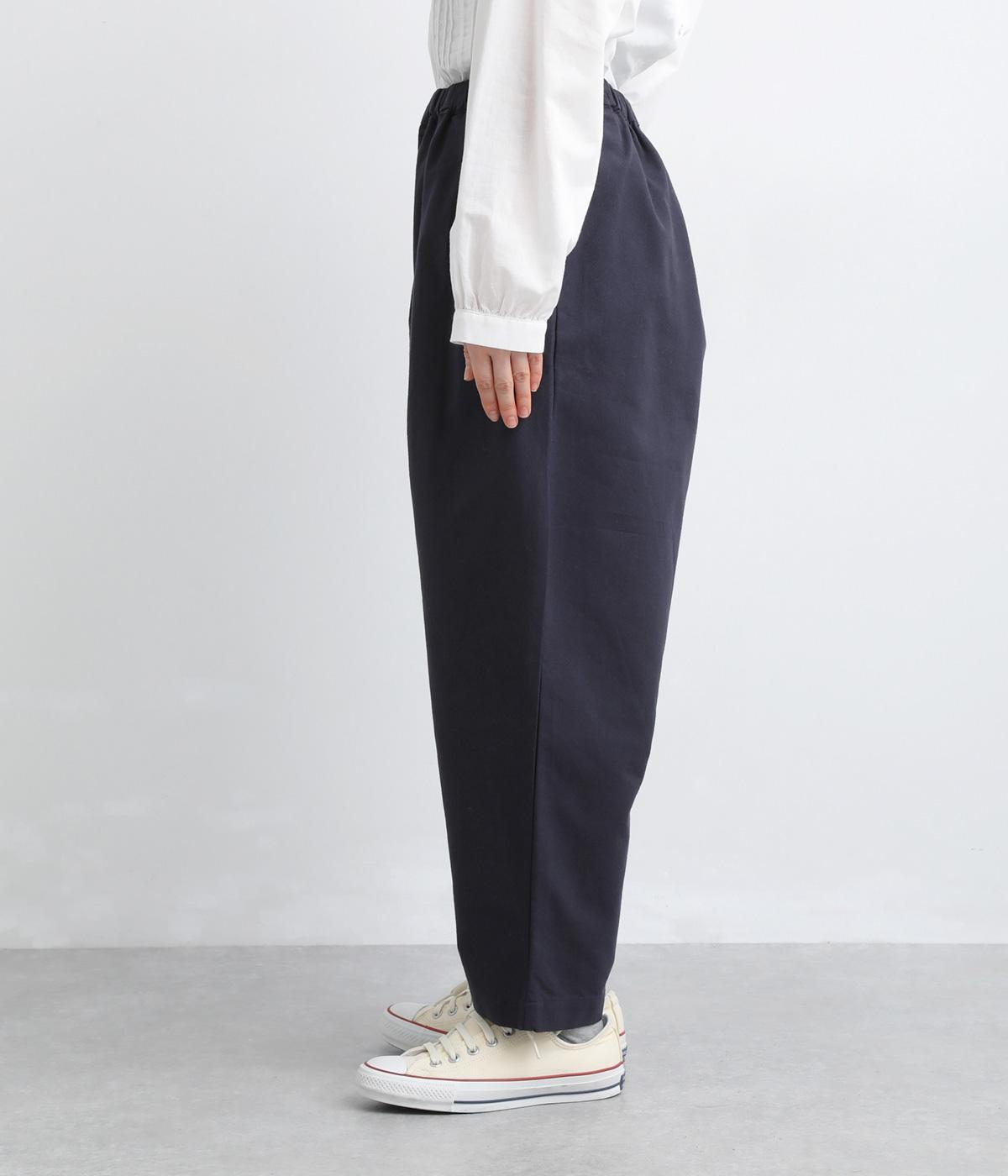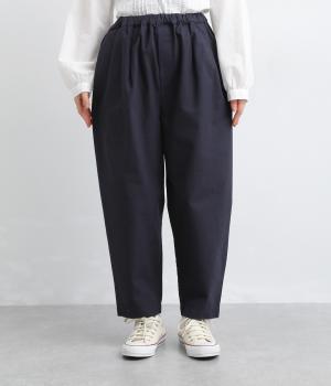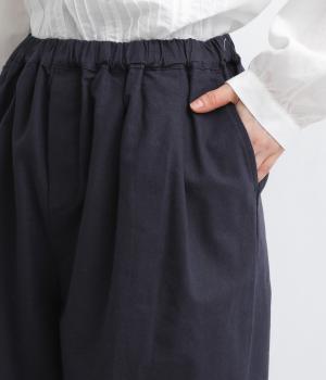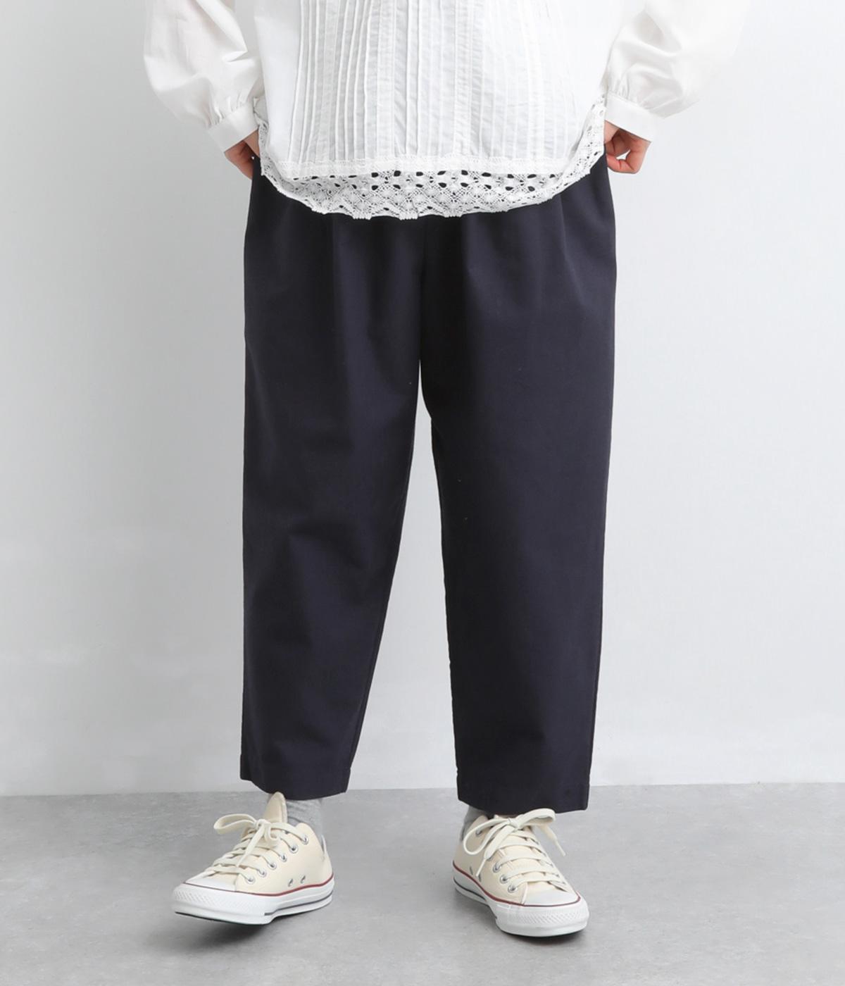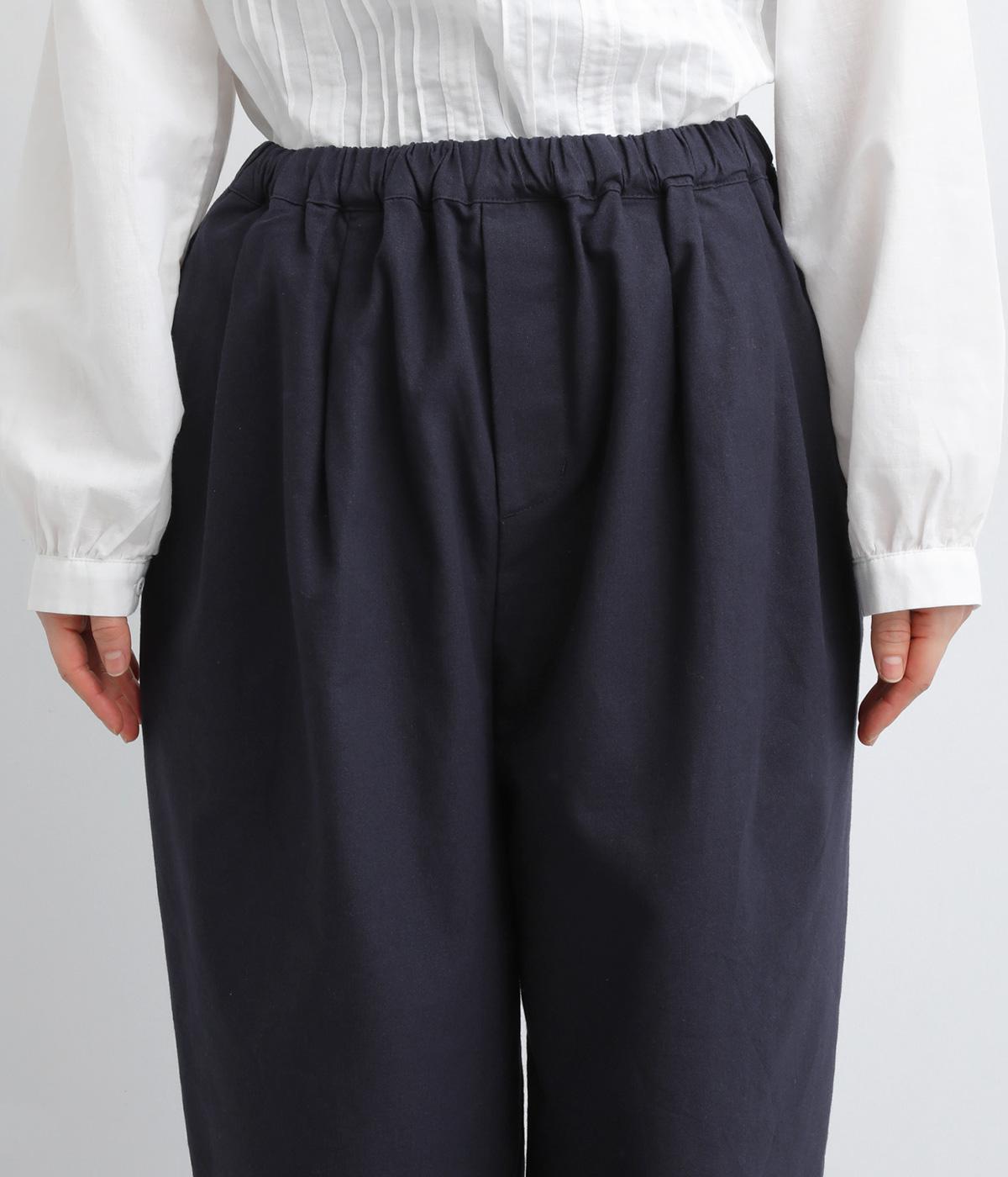タックを入れて腰まわりにゆとりを持たせたテーパードパンツ。ふくらみのある素材が自然な立体感を描き、シンプルながらも雰囲気のいい着こなしに。ウエストはフィット感のいい総ゴムに調整紐を入れました。