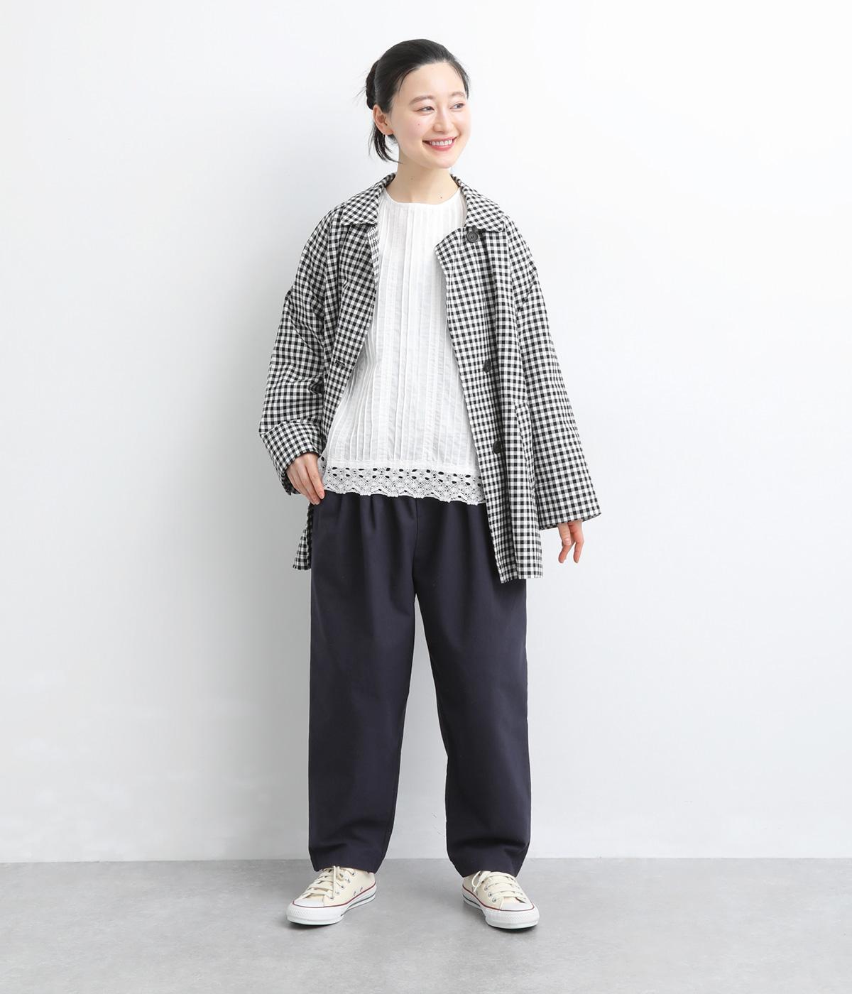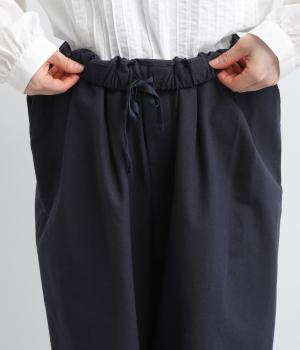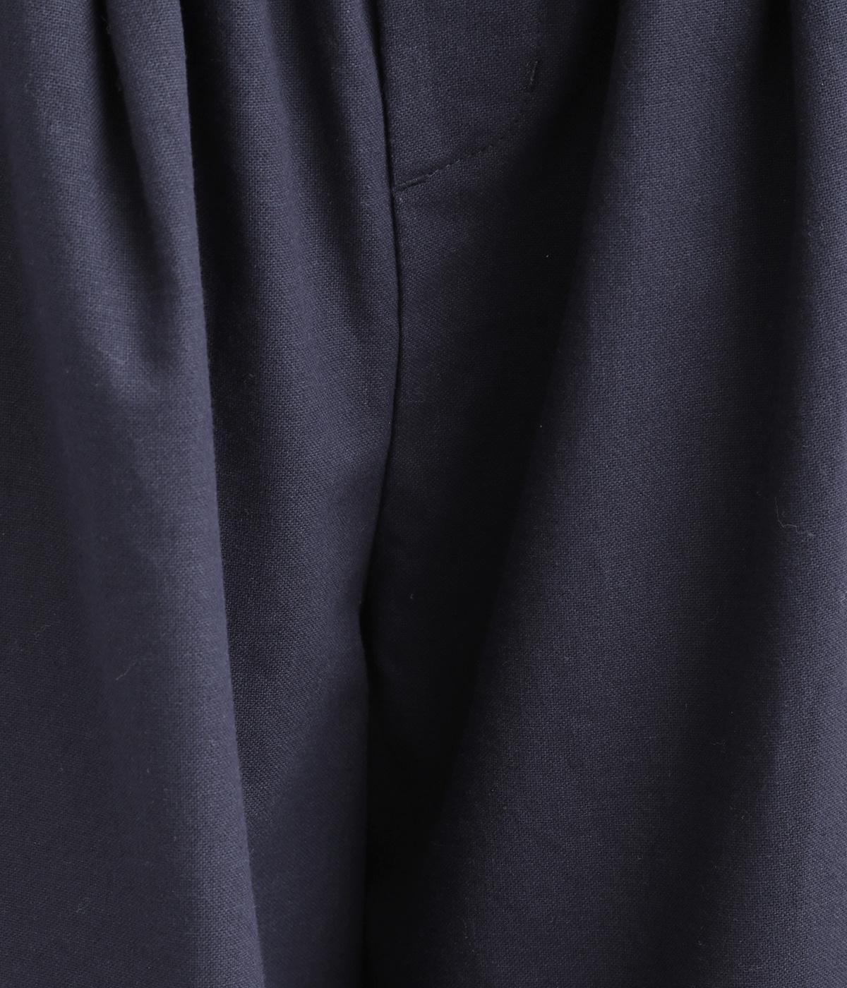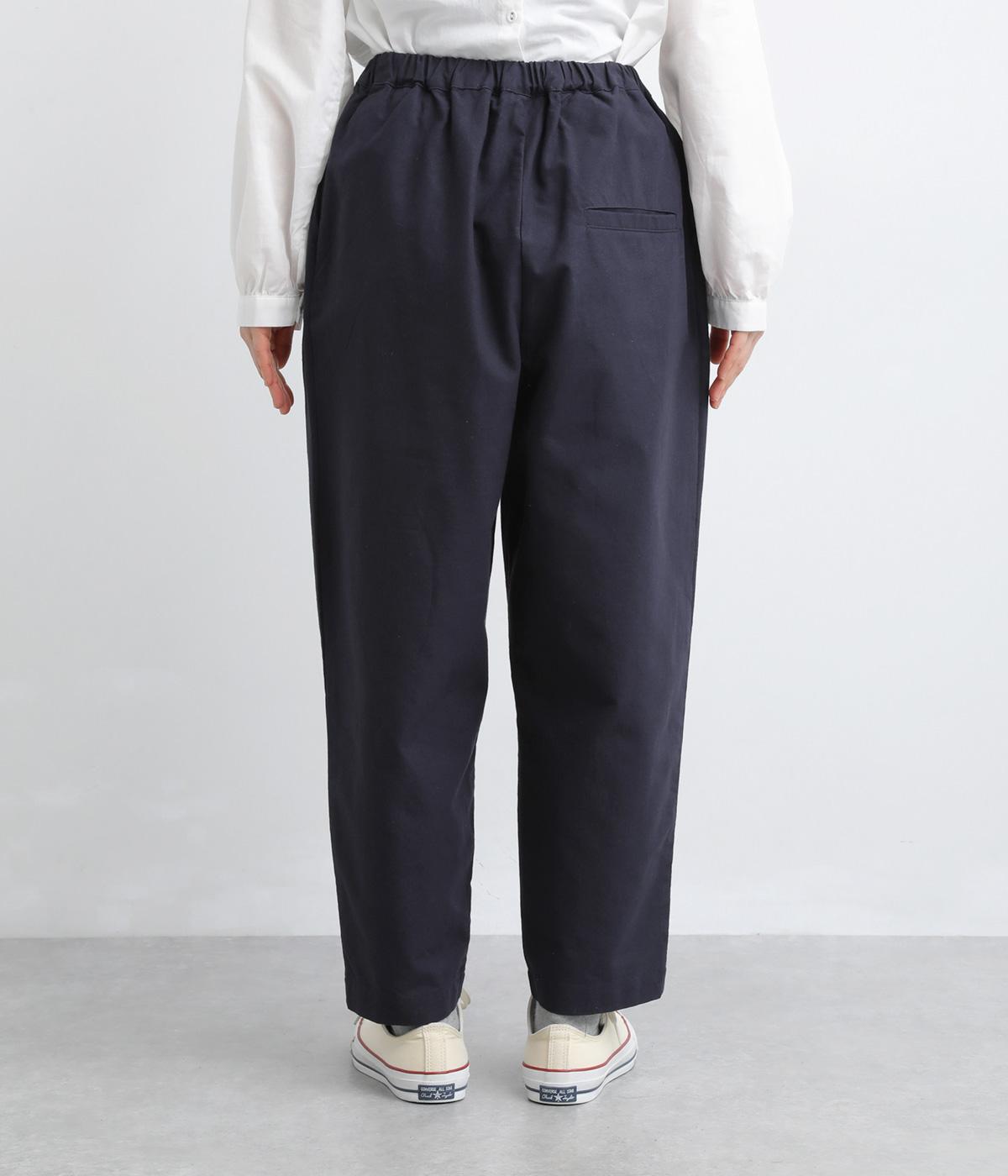 タックを入れて腰まわりにゆとりを持たせたテーパードパンツ。ふくらみのある素材が自然な立体感を描き、シンプルながらも雰囲気のいい着こなしに。ウエストはフィット感のいい総ゴムに調整紐を入れました。